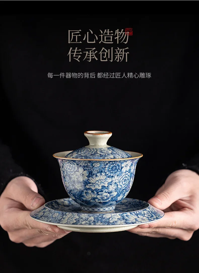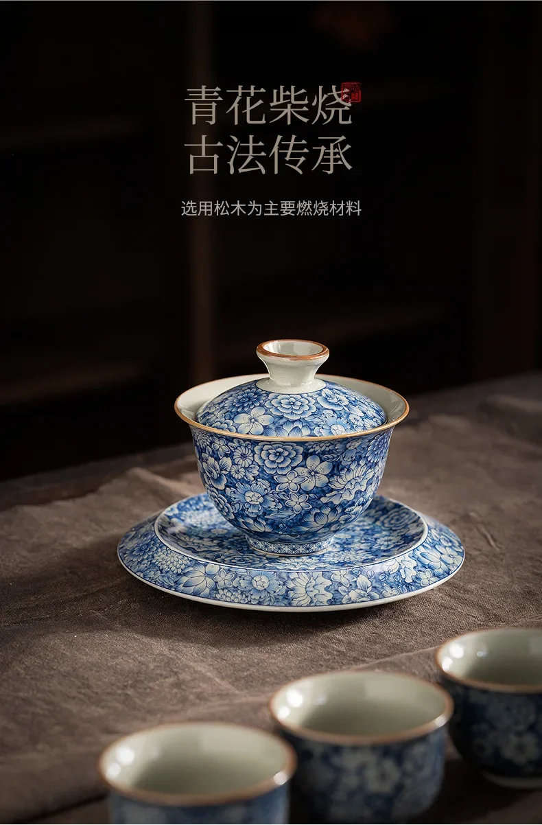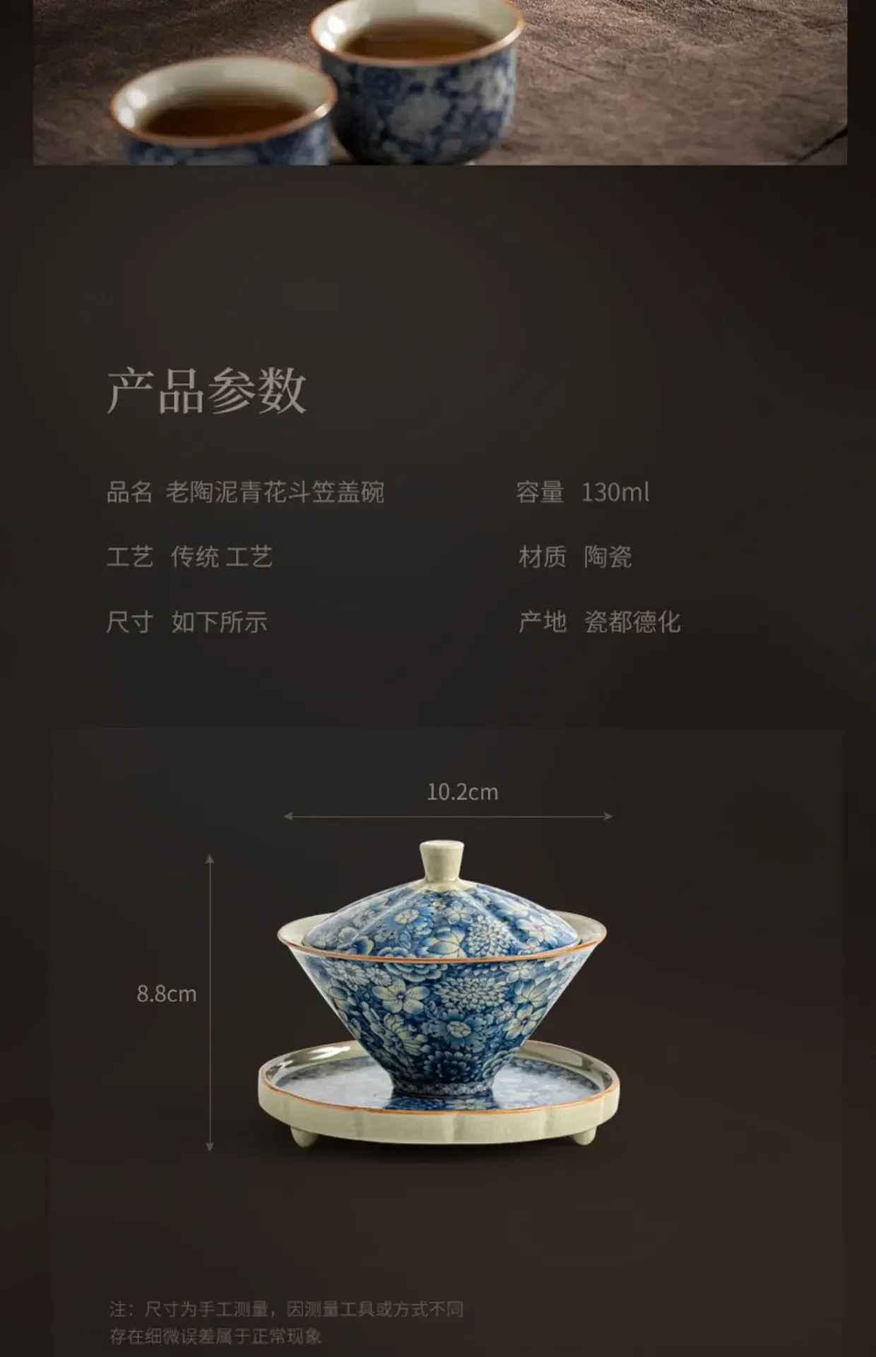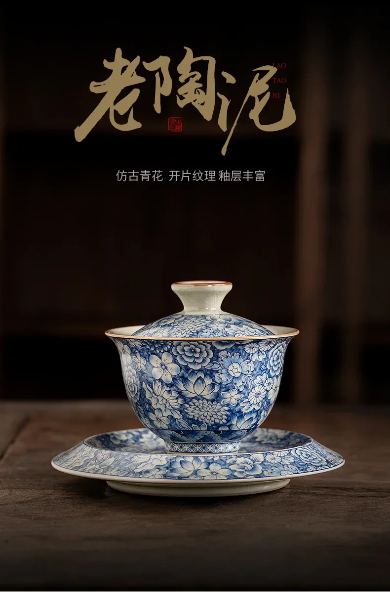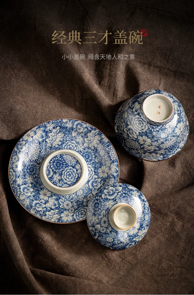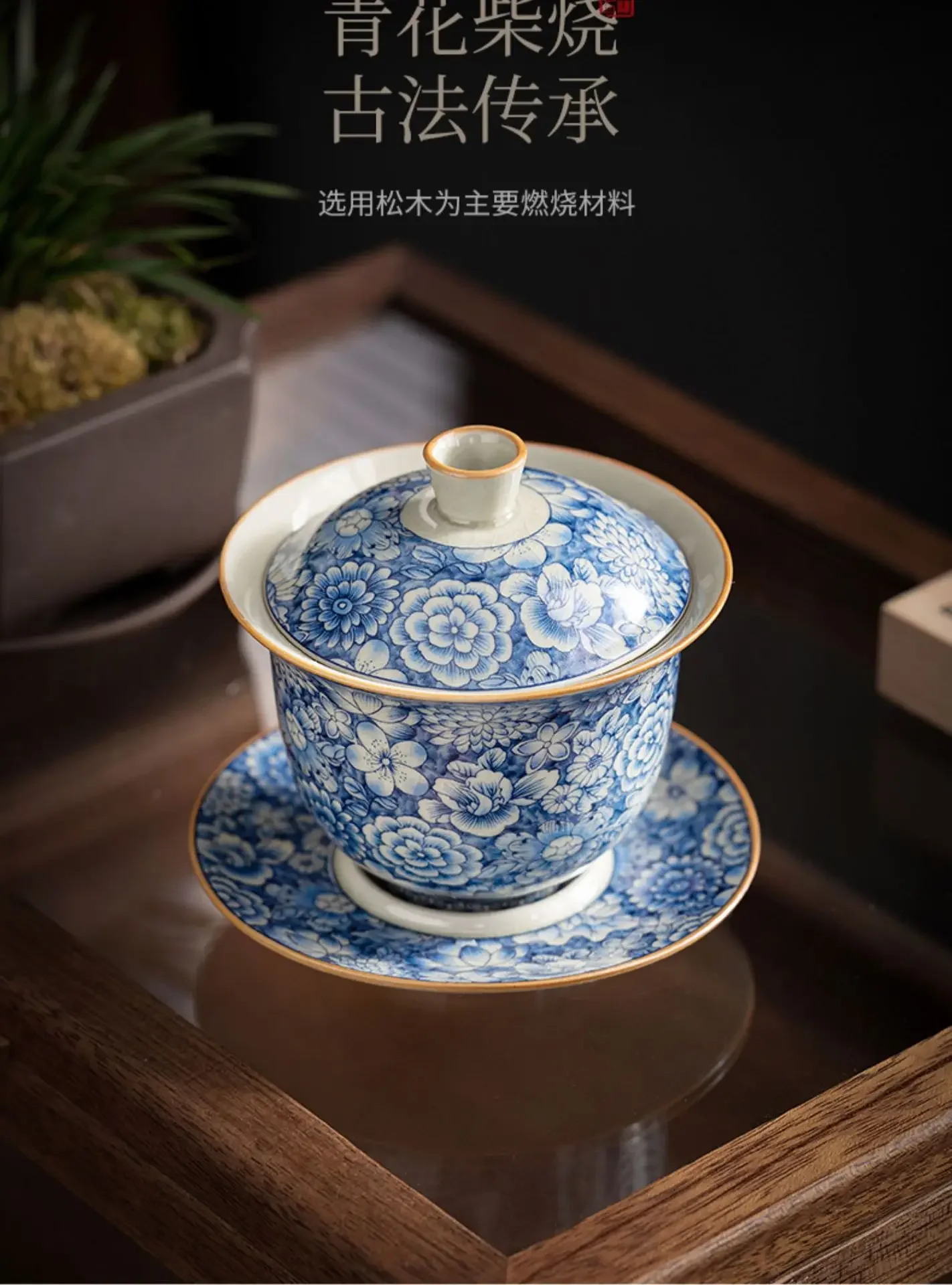 Old Clay Blue and White, Bamboo Hat Tureen High-End Sancai Gaiwan Tea Cup, Ceramic Household Single Ceremony Tea Brewing Bowl
