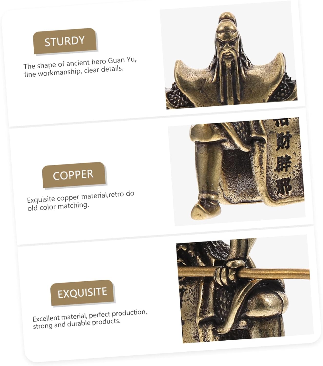 Guan Yu Chinese Fighting Warrior This figurine is a Chinese Guan Yu craft.table decoration Great ornament for home decoration.chinese feng shui decor You can put it on your home desk, office, car, or other plat places.Tea Pet The cooper Guan Yu is also a great tea pet choice.guan yu figurine The ornament is made of material, so not damaging to your body