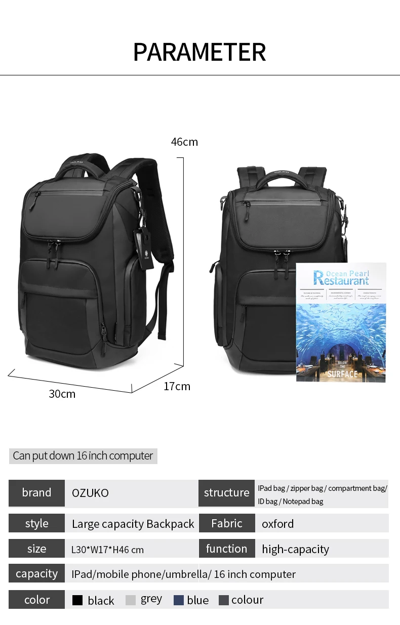 OZUKO Men Backpack Multifunctio Large Capacity Waterproof Backpacks 15.6 Laptop Backpack Travel Business Male Bag USB Fashion