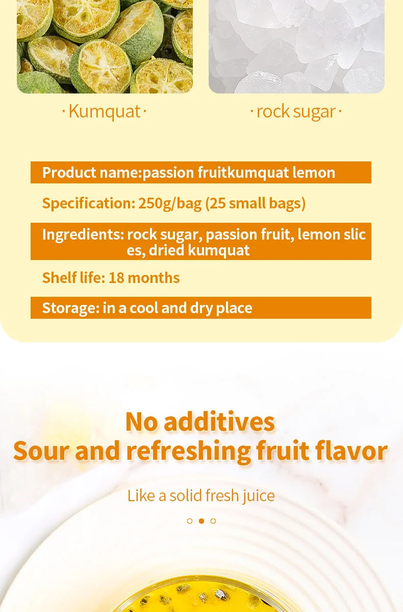 Ingredients: rock sugar, passion fruit, lemon slic es, dried kumquat