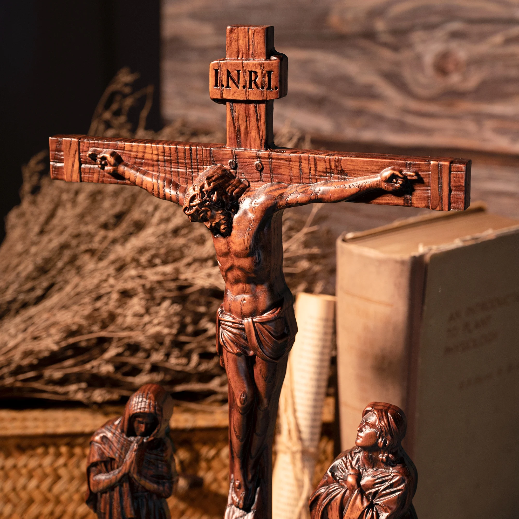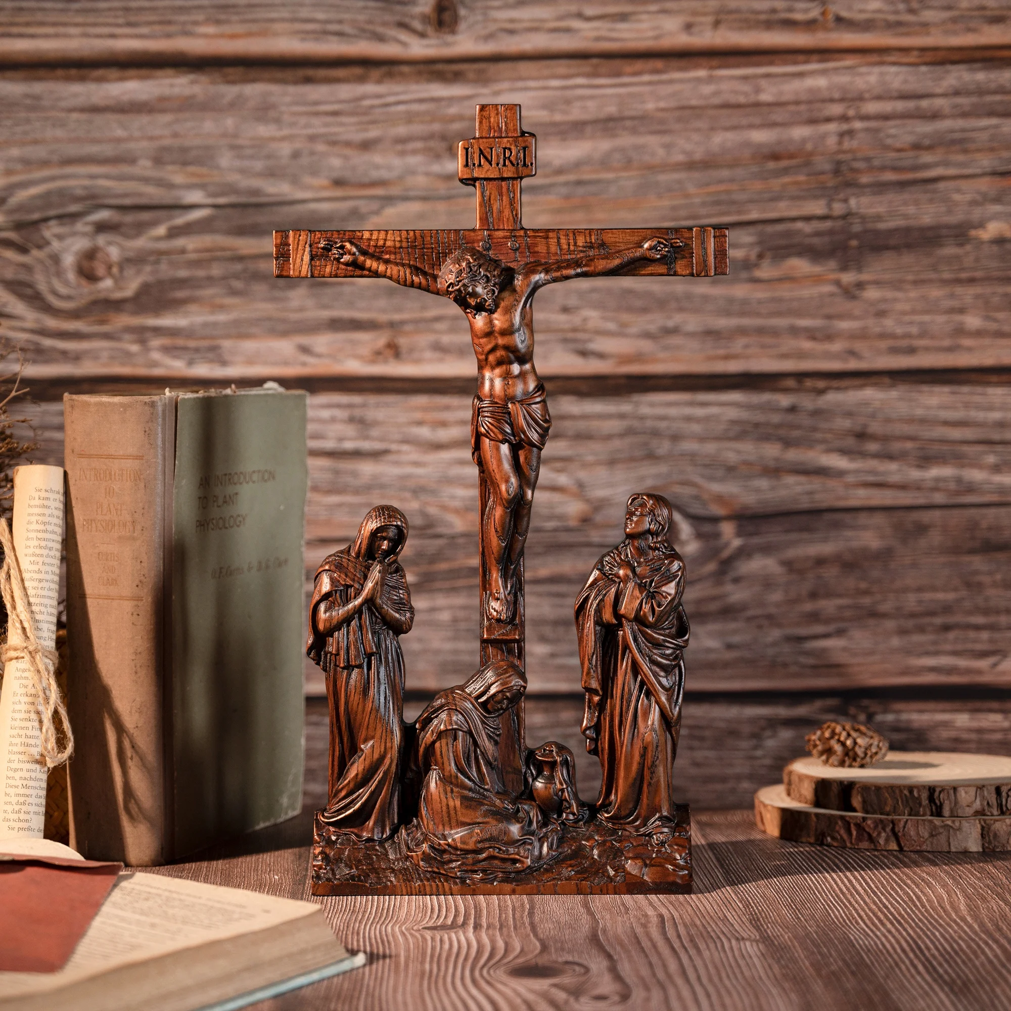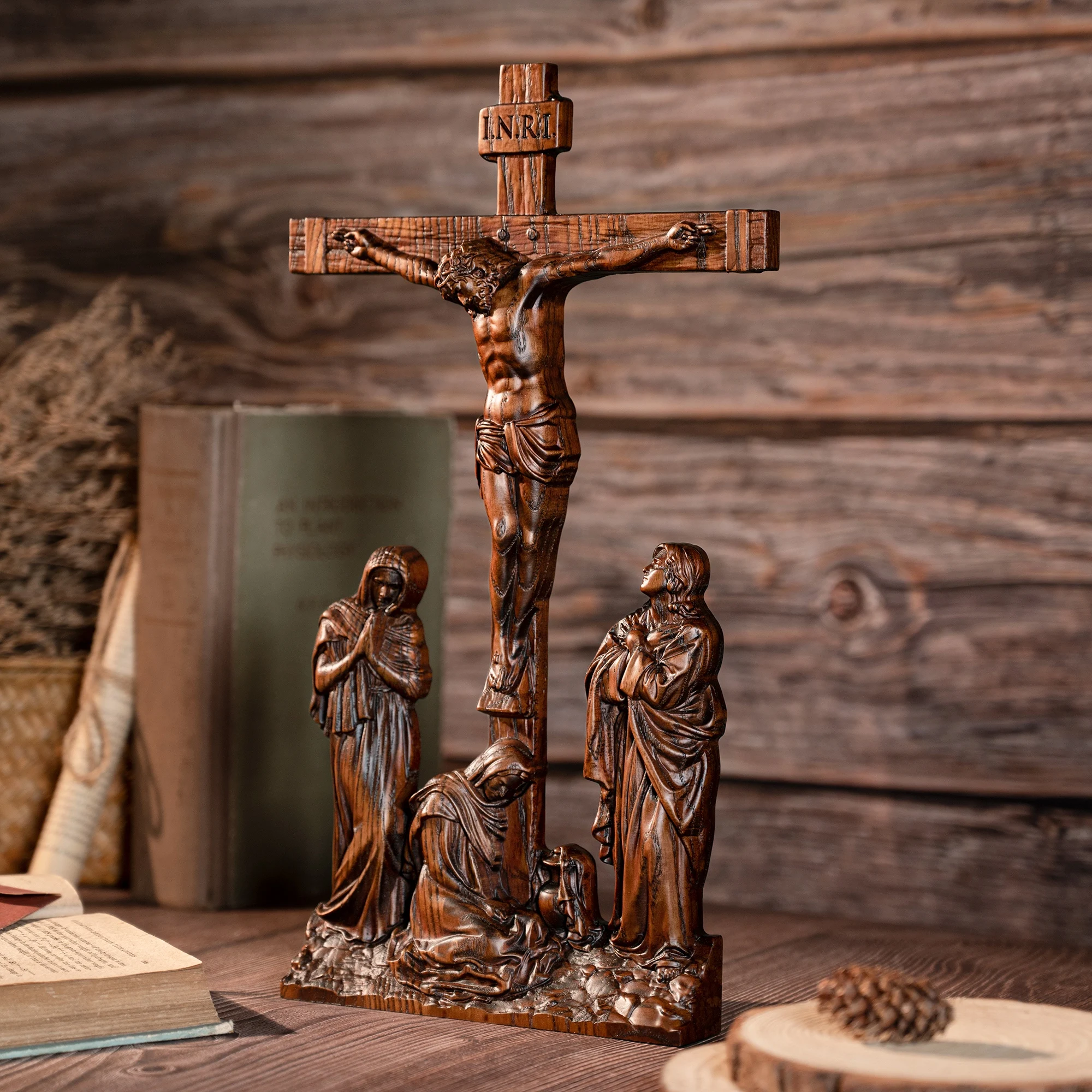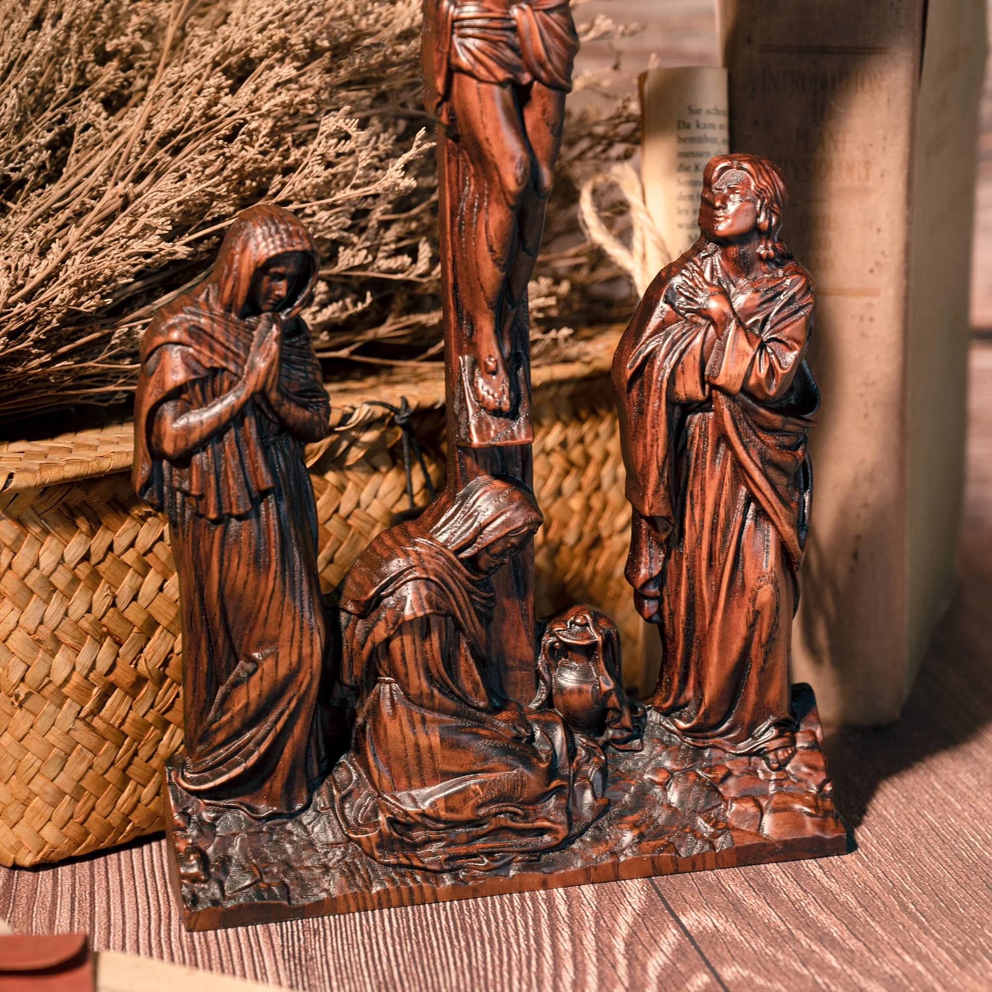 This product depicts a crucifixion scene with statues of the Virgin Mary, Saint John and Mary Magdalene on the base.