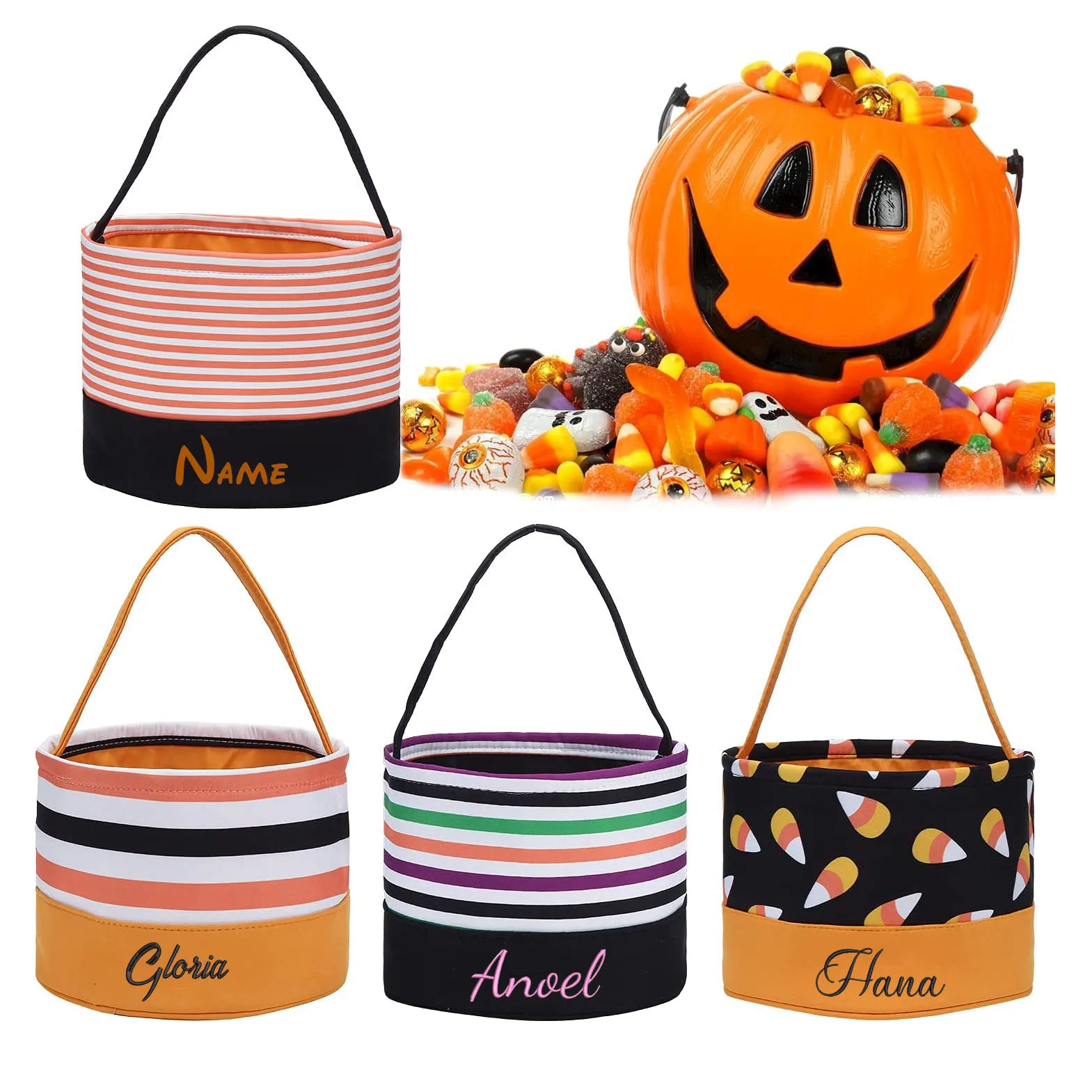 - 3.Durable material: This halloween trick or treat bag is made of polyester material, lightweight yet durable, strong enough to hold various items like candies, chocolates, festival gifts and more, it can provide long-time service.Size is 6.75" Tall x 9"Diameter.