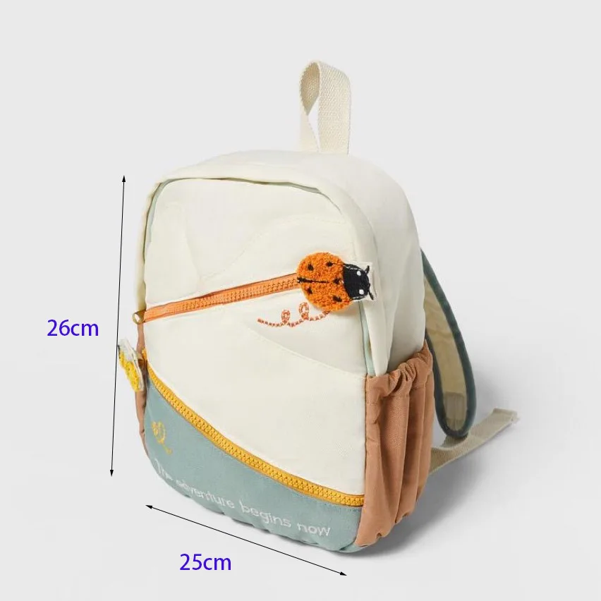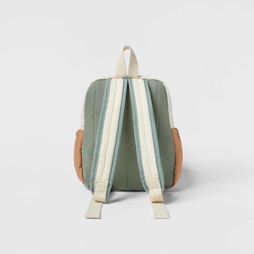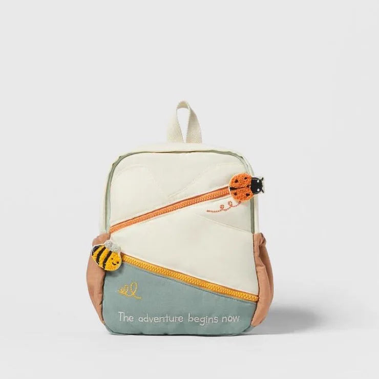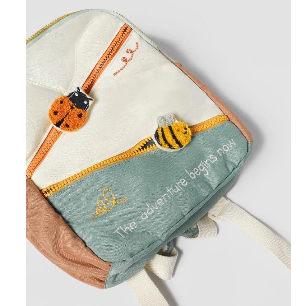 Multicolor quilted backpack. Main compartment with zip closure. Two central pockets with insect detail at pull tabs. Two side pockets. Handle and two adjustable shoulder straps.