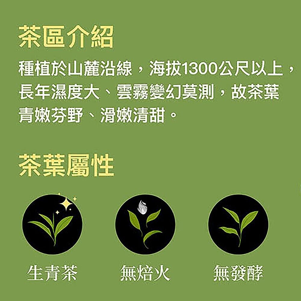 種植於山麓沿線,海拔1300公尺以上,長年濕度大、雲霧變幻莫測,故茶葉青嫩芬野、滑嫩清甜。