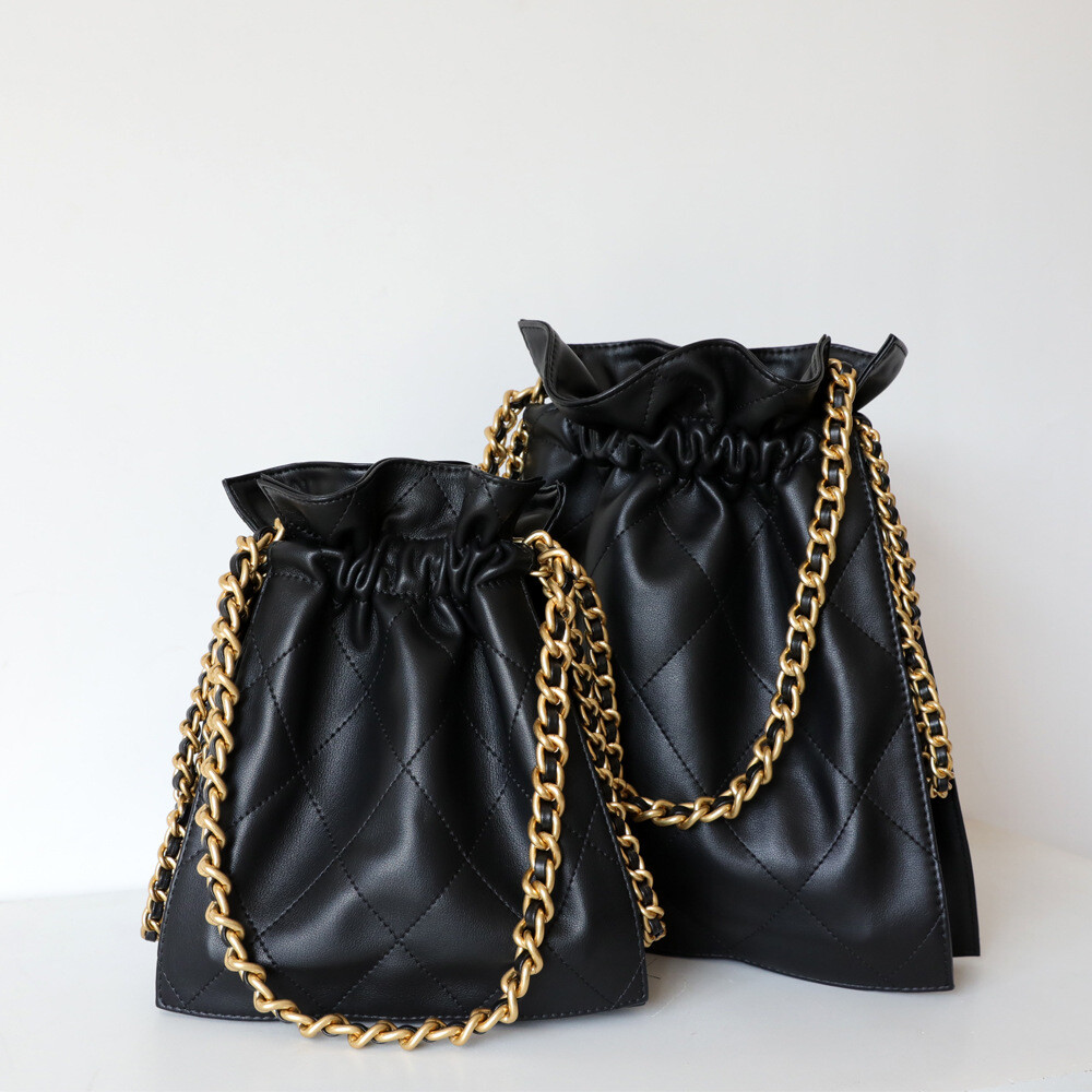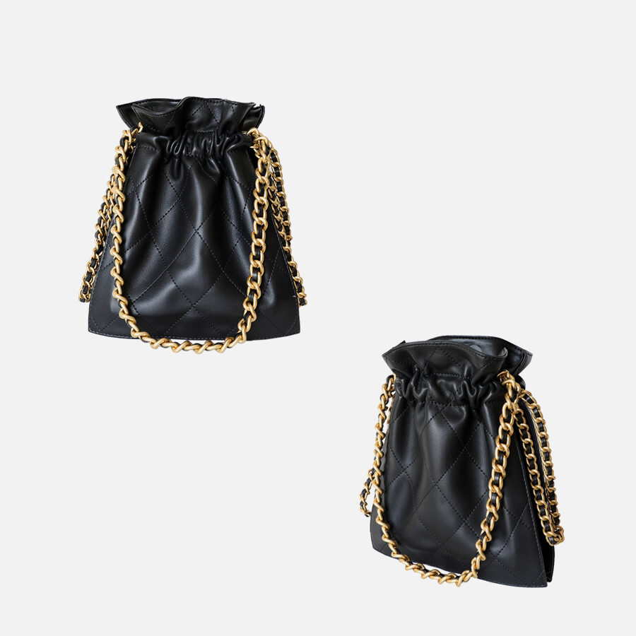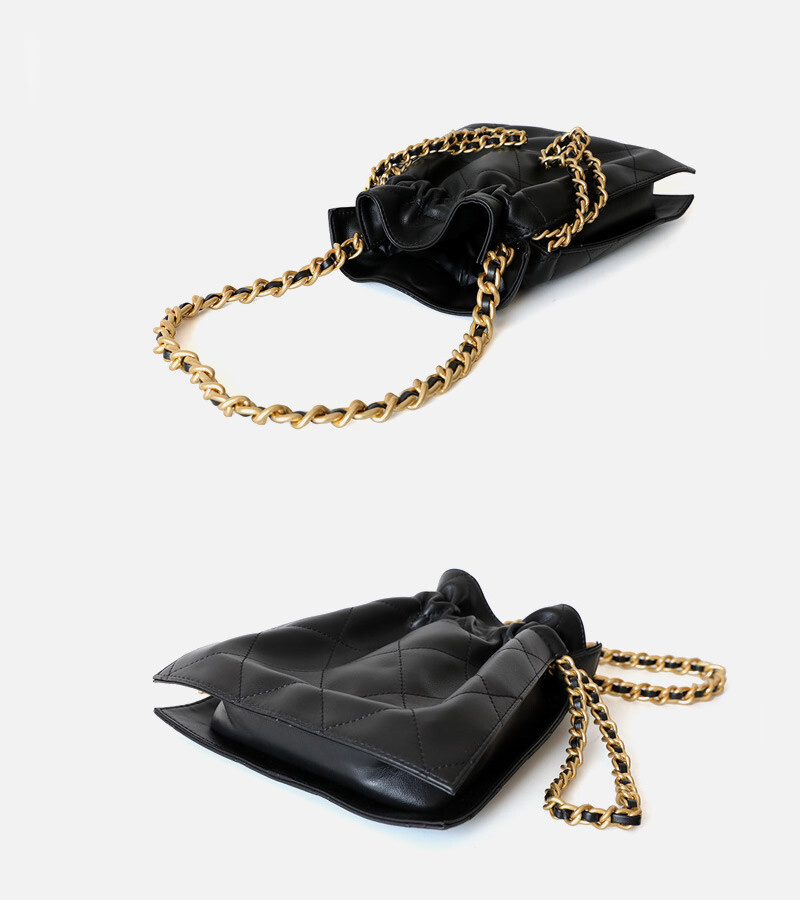 - Two detachable chain straps included: one short thick chain and one long thin chain