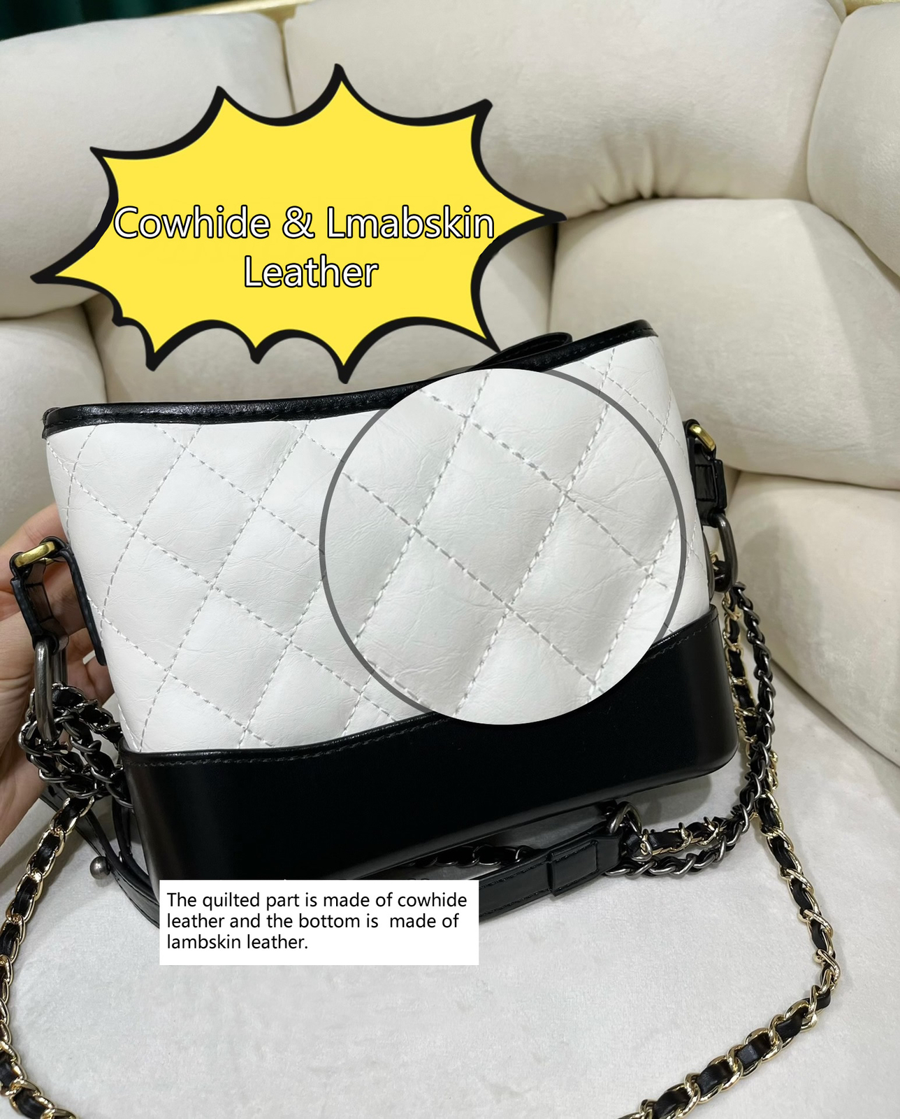 - The quilted part is made of cowhide leather and the bottom is made of