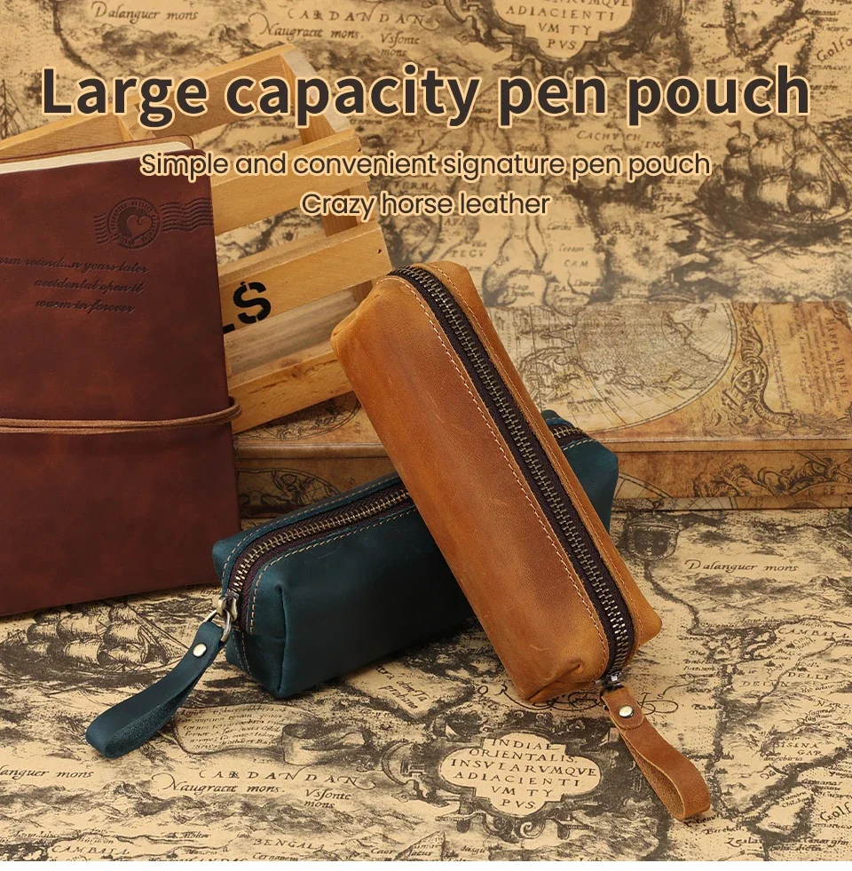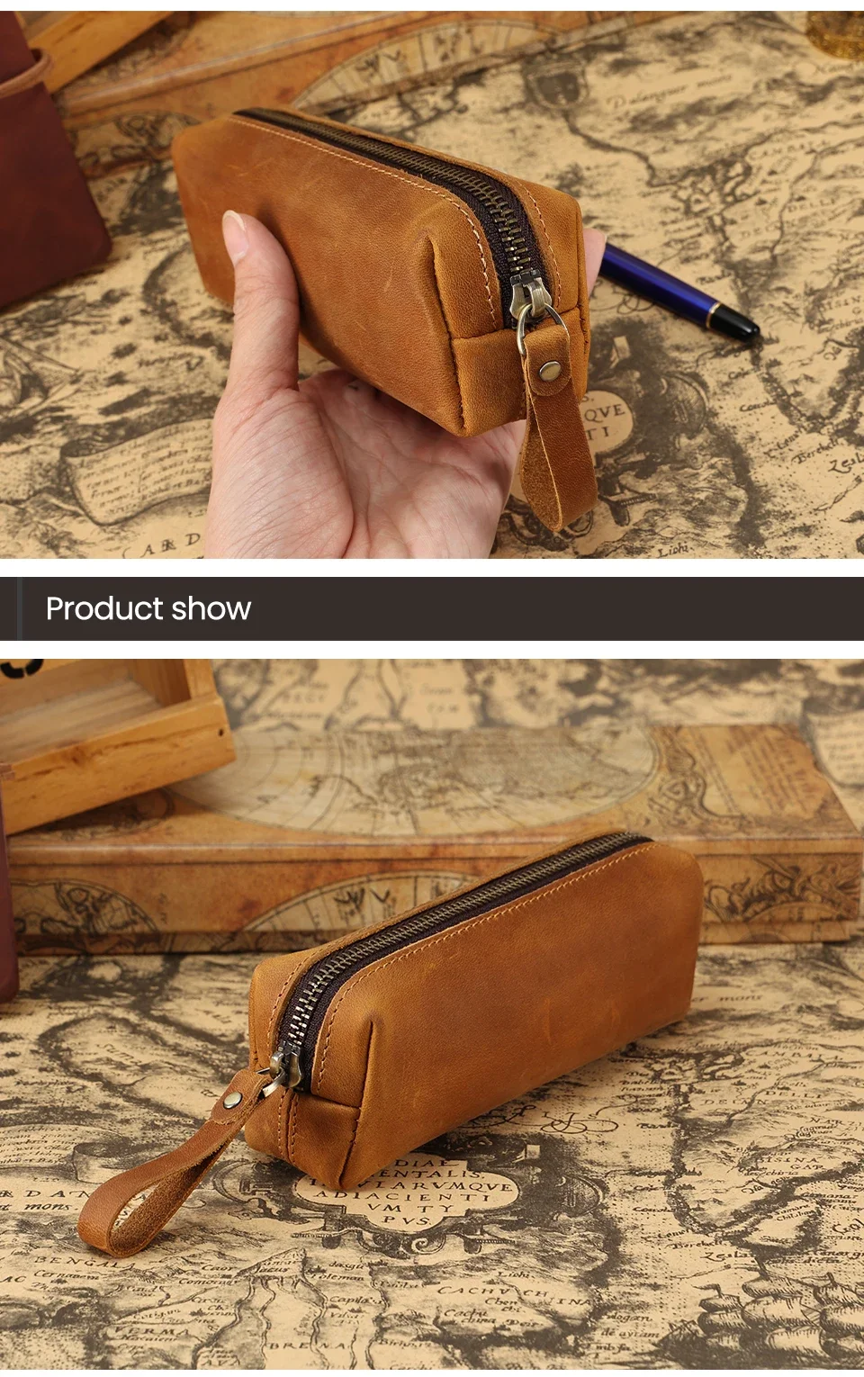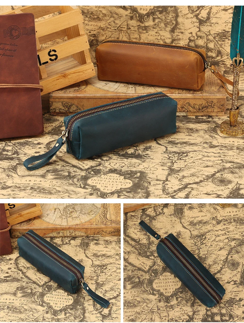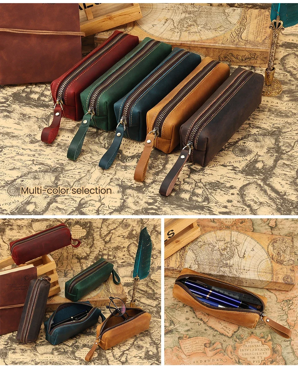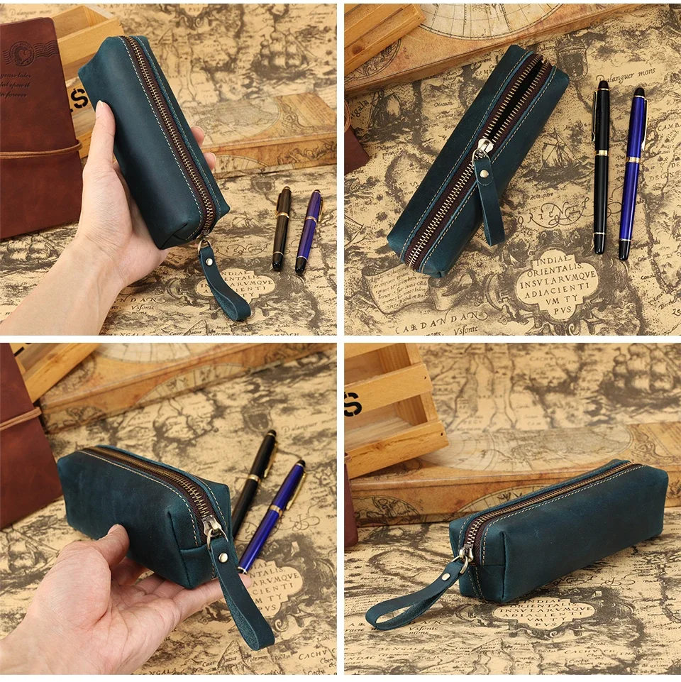 Retro Genuine Leather Pencil Case Handmade Business Pen Cases with Zipper Pouch for School Office Stationery Supplies