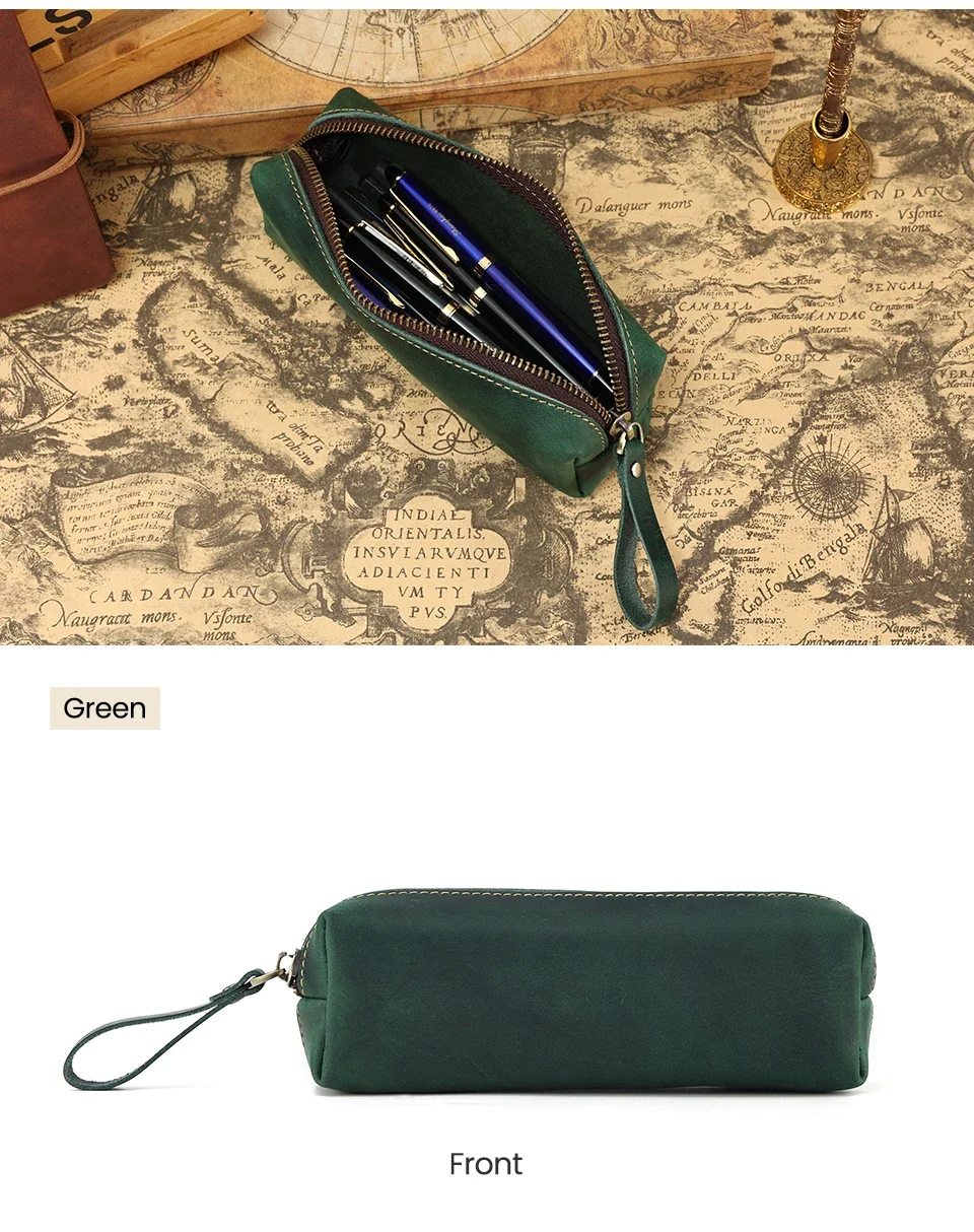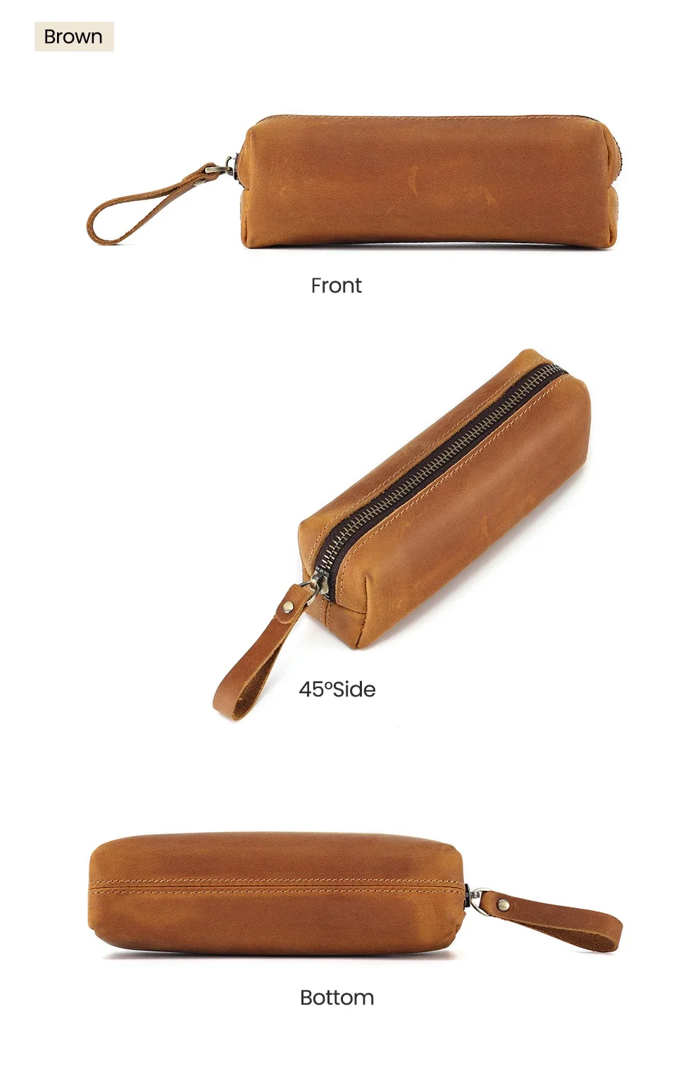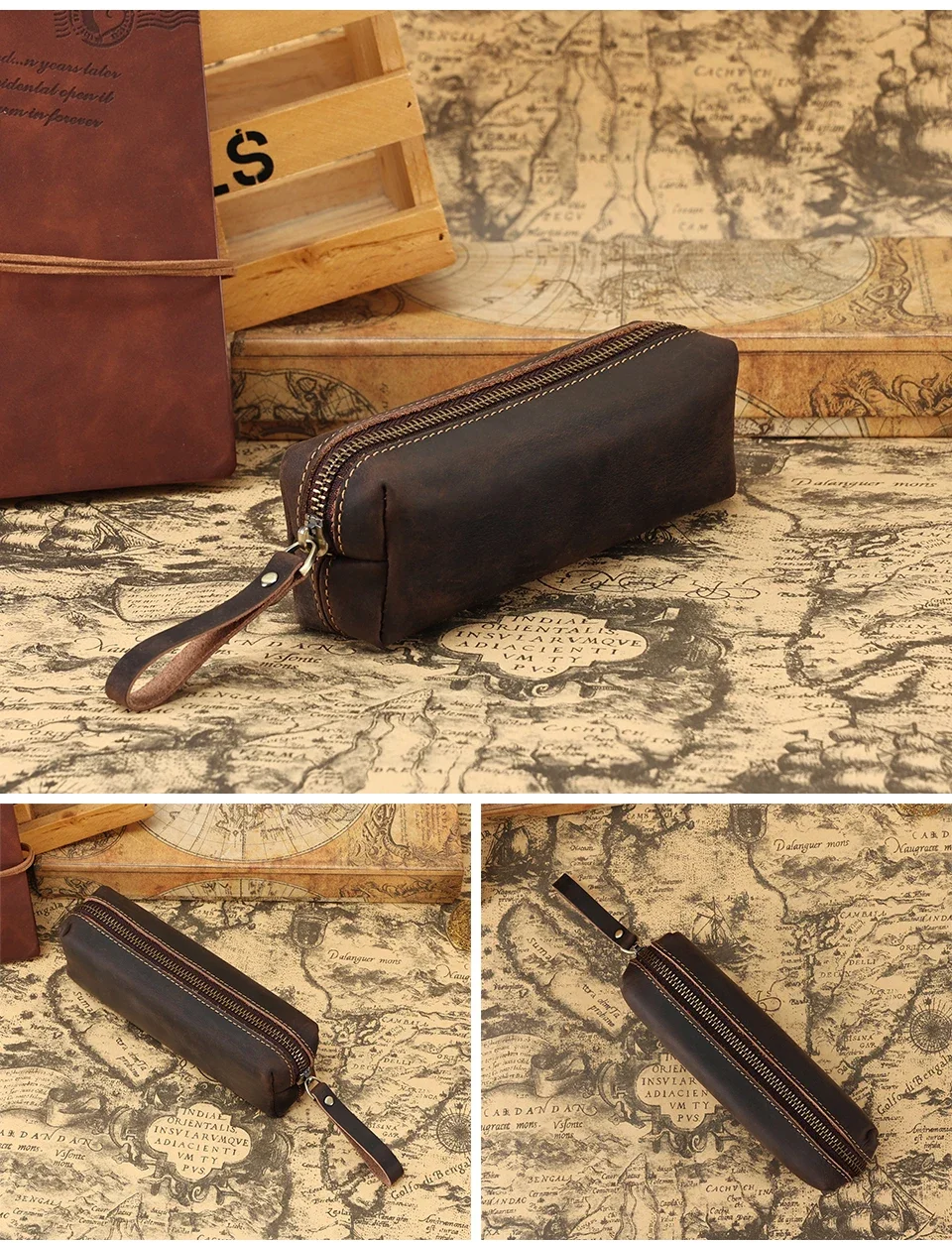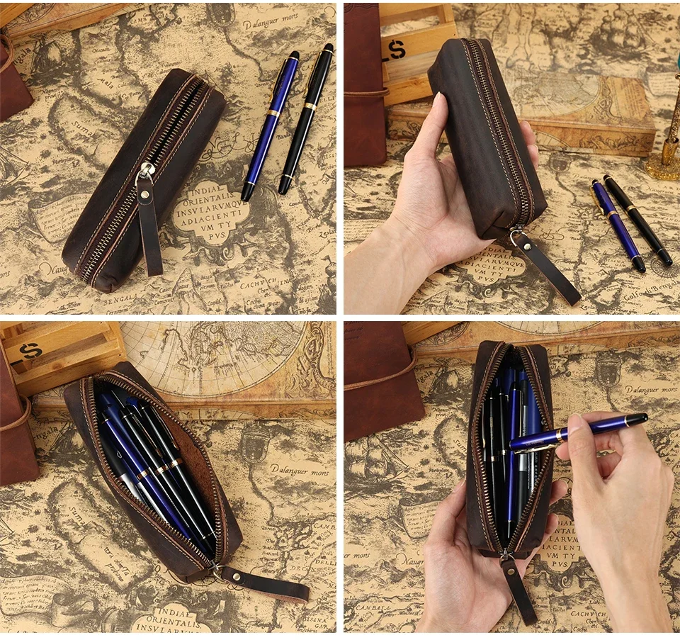 Retro Genuine Leather Pencil Case Handmade Business Pen Cases with Zipper Pouch for School Office Stationery Supplies