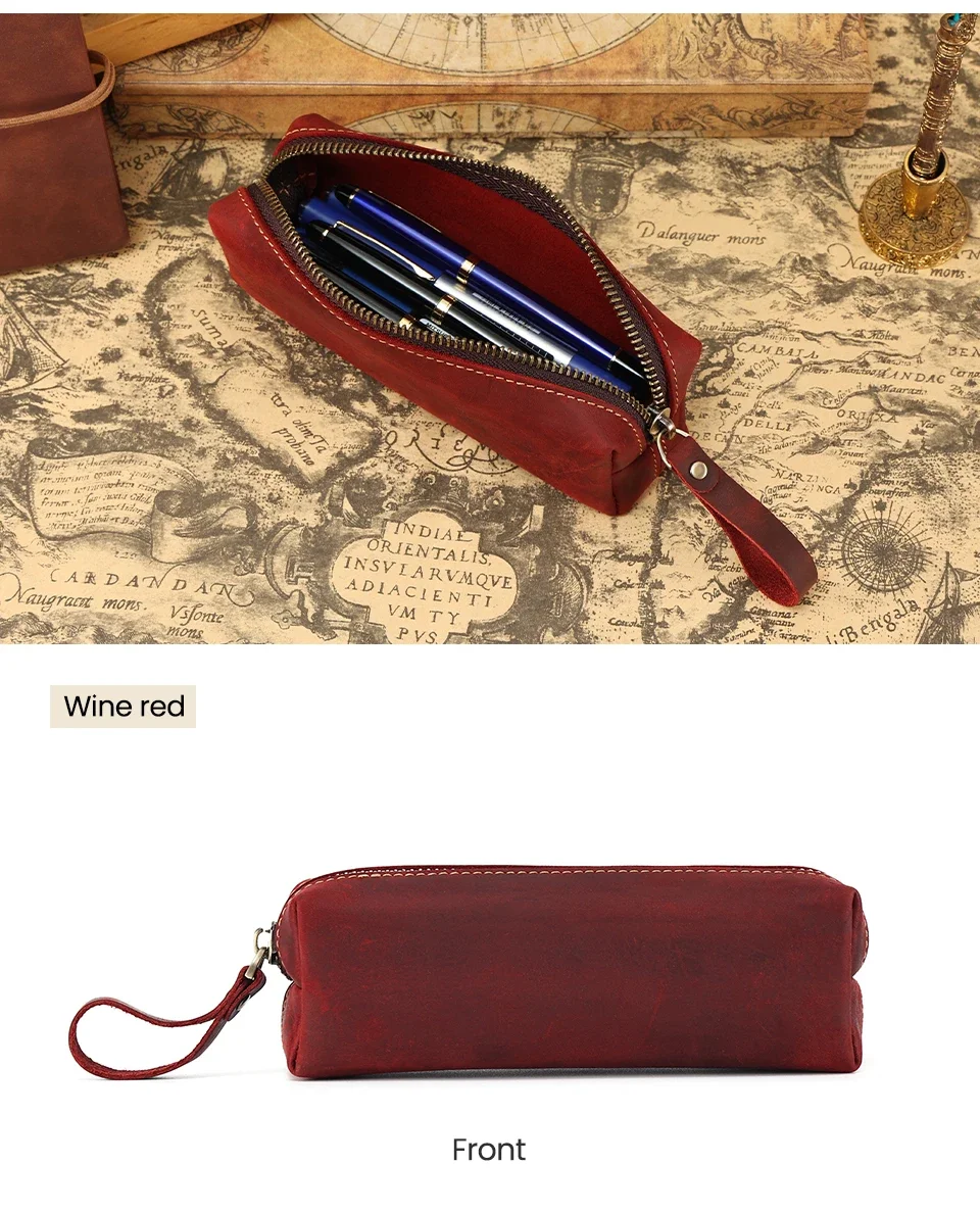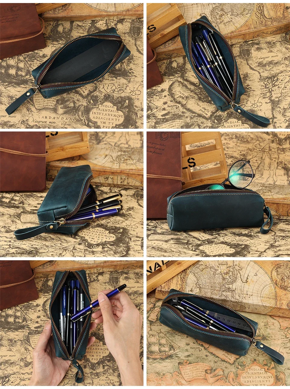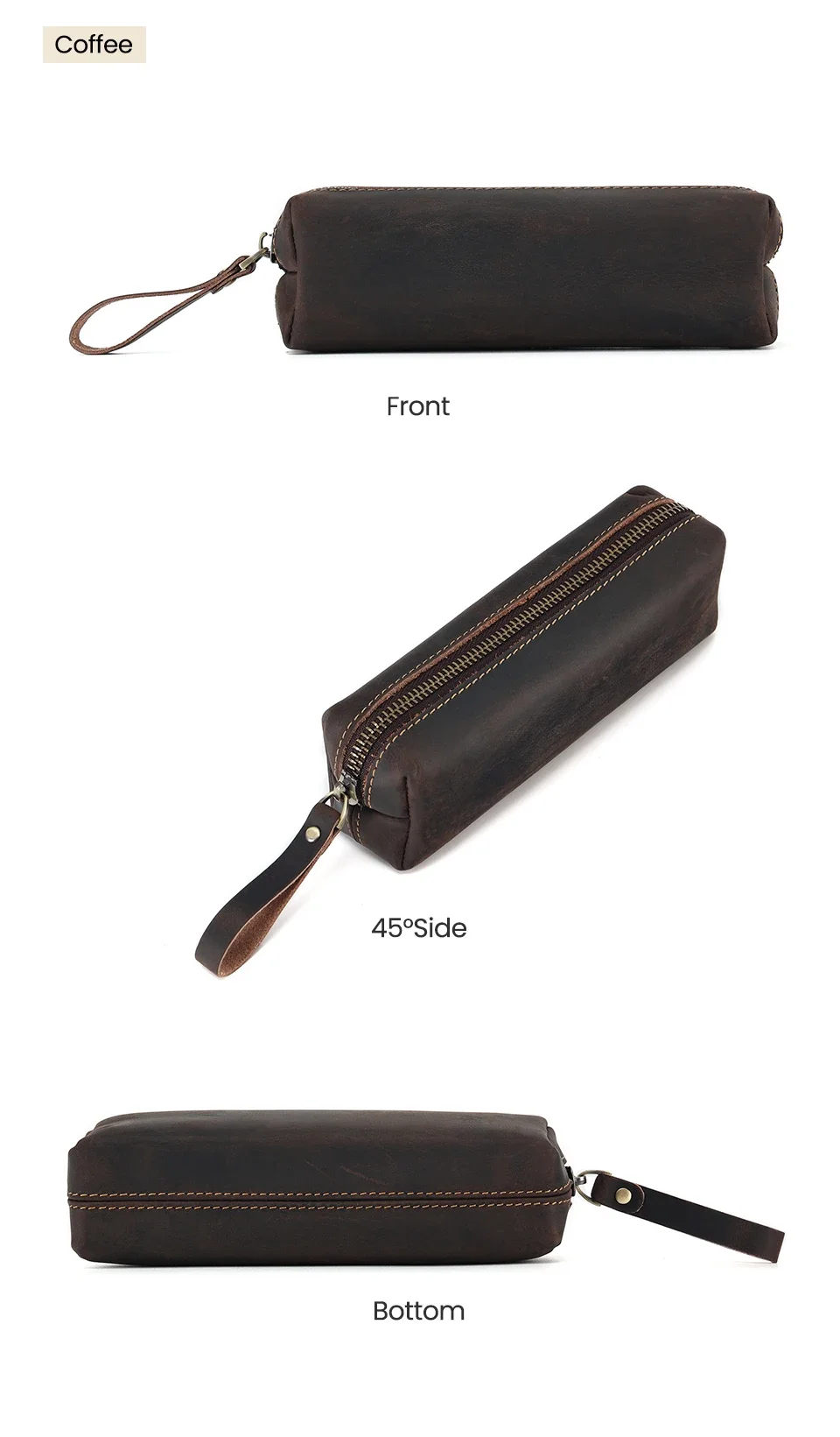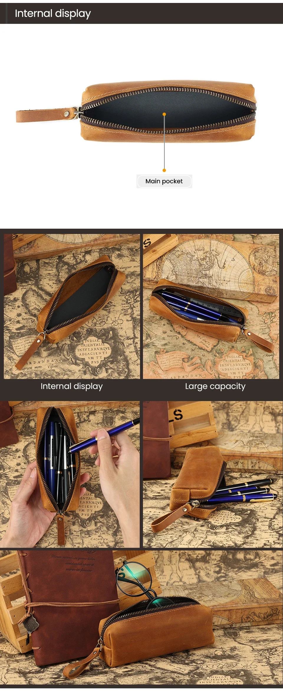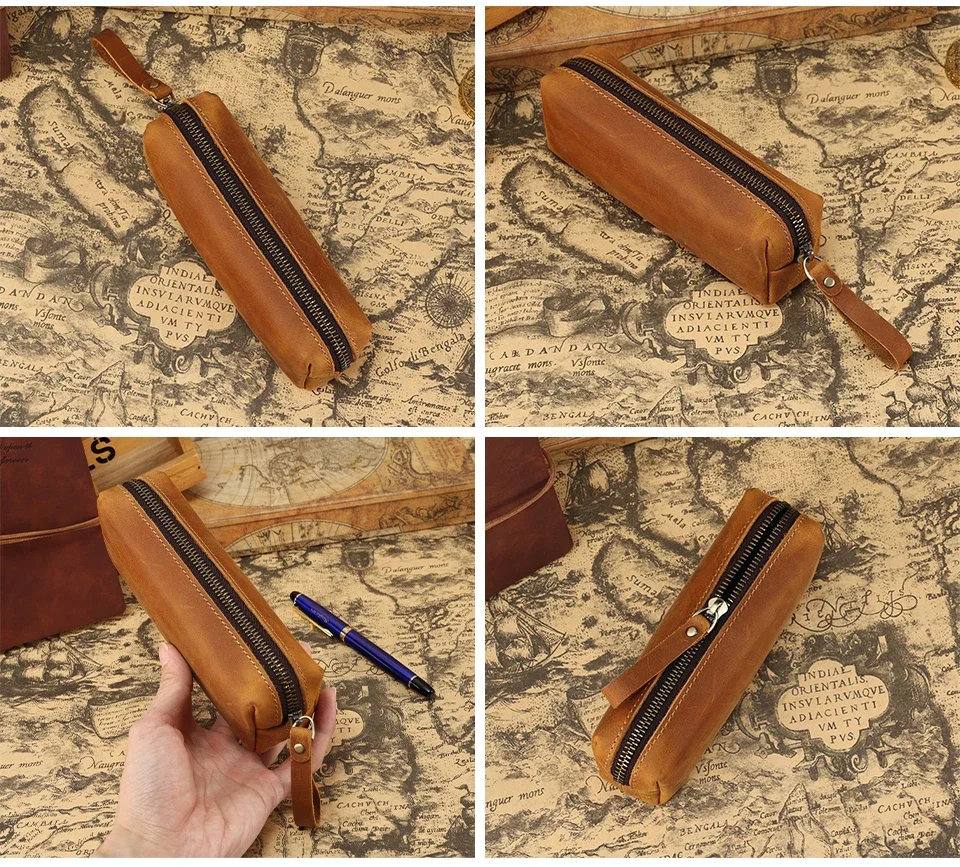 Retro Genuine Leather Pencil Case Handmade Business Pen Cases with Zipper Pouch for School Office Stationery Supplies