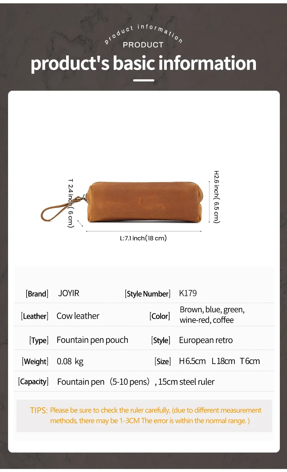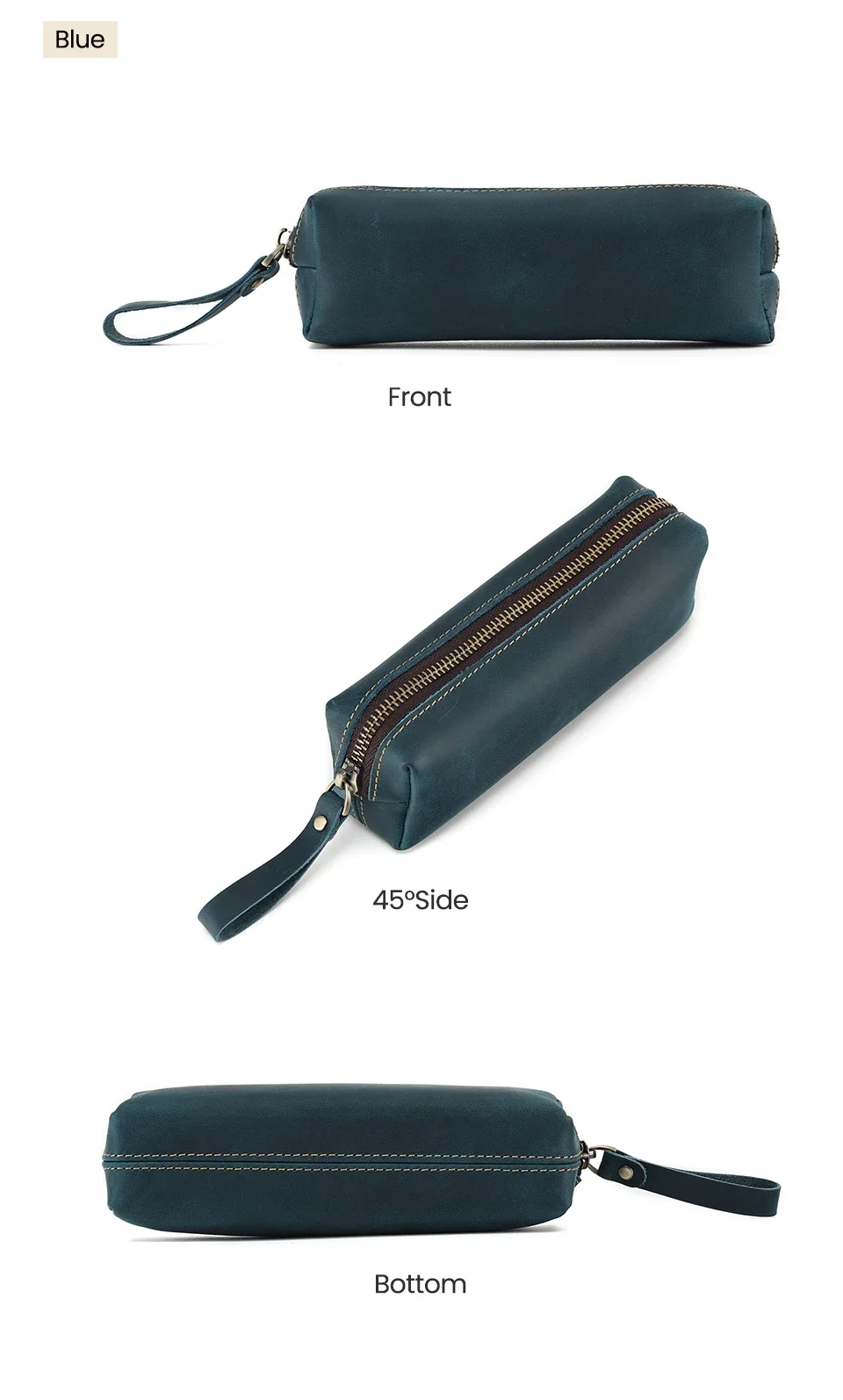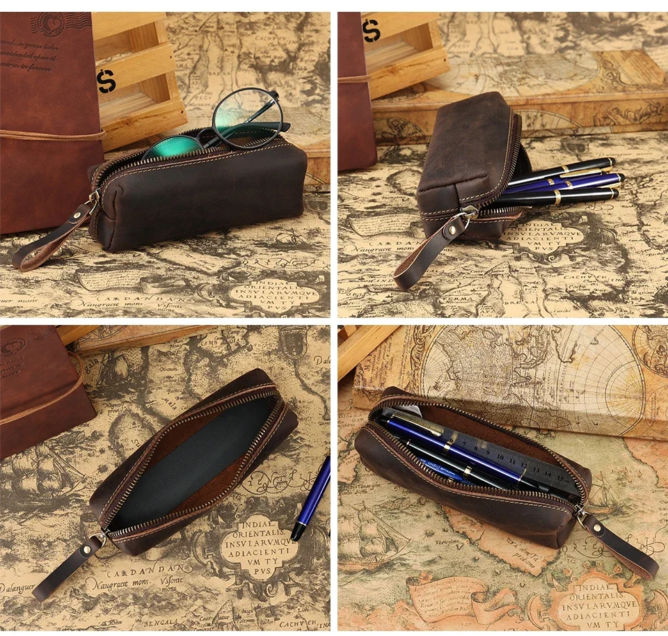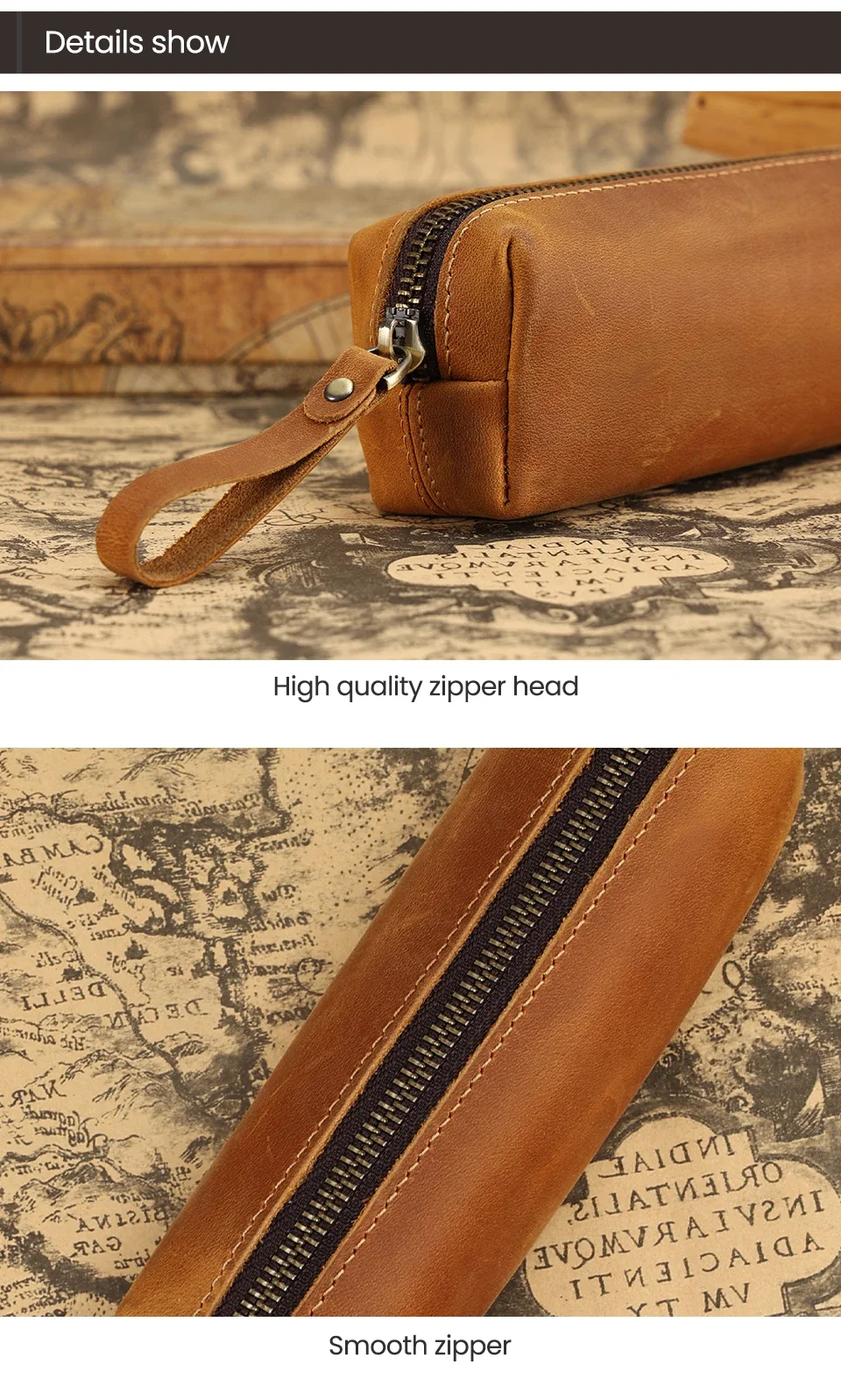 Retro Genuine Leather Pencil Case Handmade Business Pen Cases with Zipper Pouch for School Office Stationery Supplies