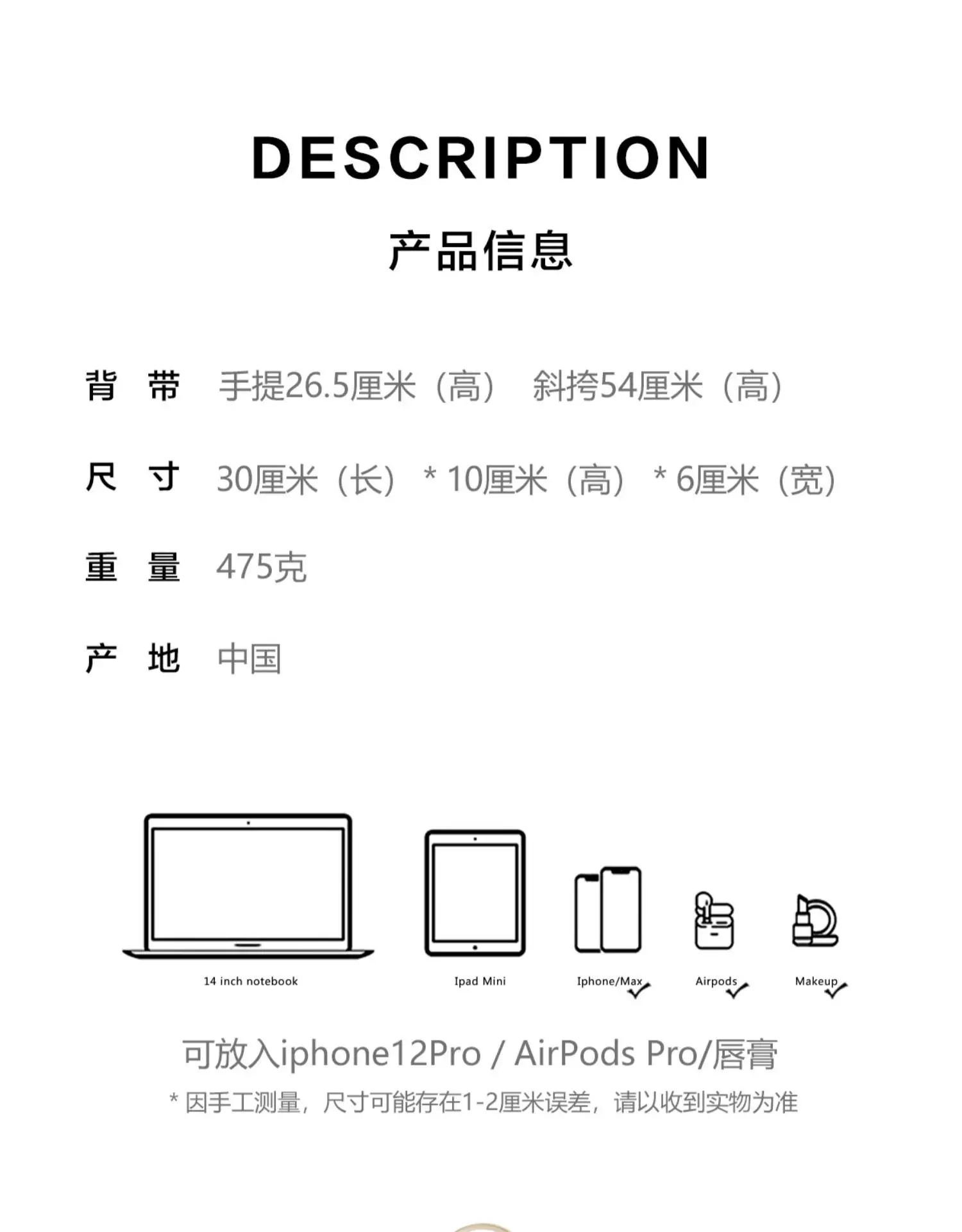 Split leather upper material Polyester liningMetal decorationLength: 30cmWidth: 10cmHeight: 6cmColors: Black, Beige