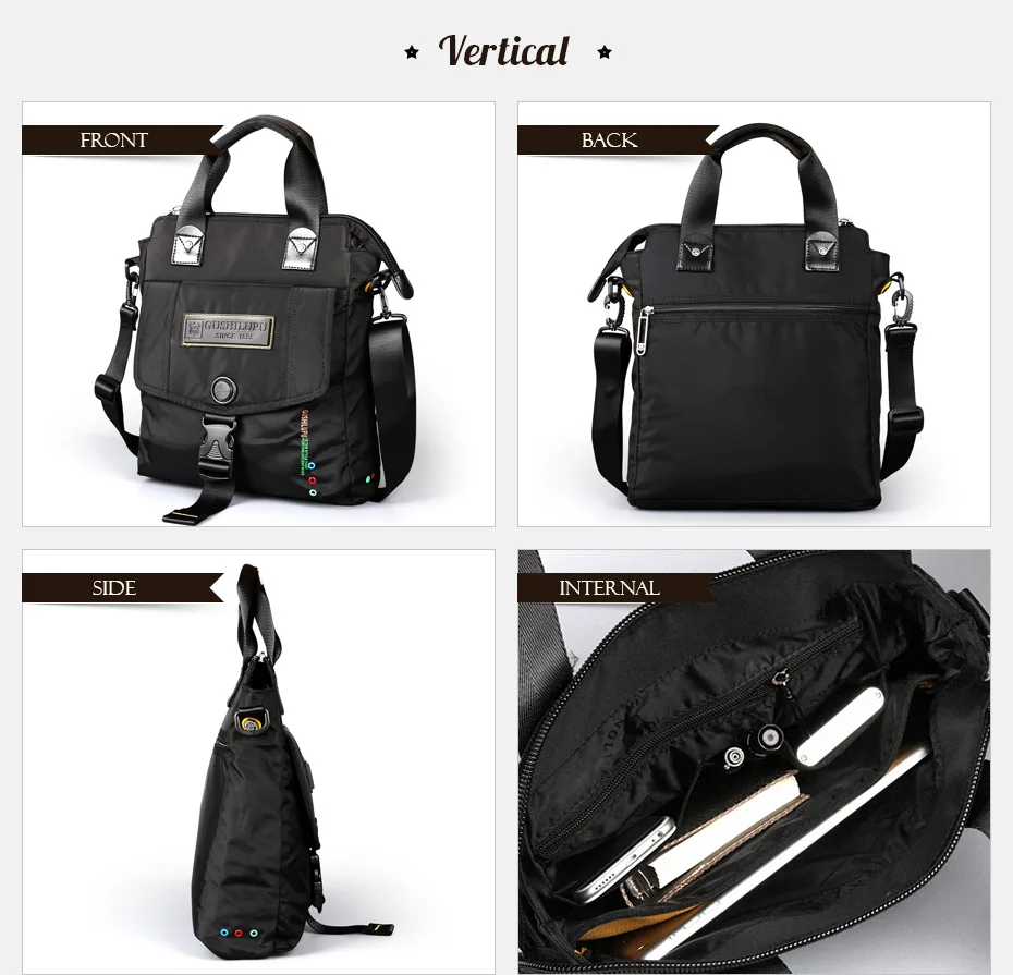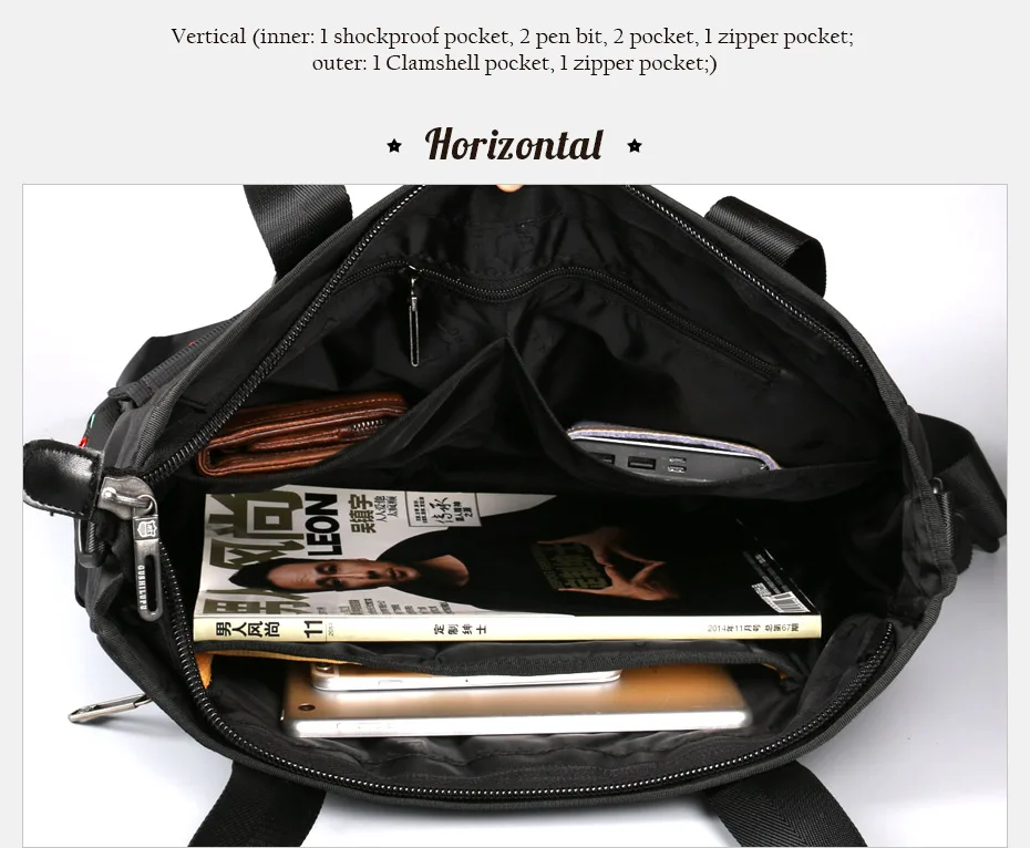 Vertical (inner: 1 shockproof pocket, 2 pen bit, 2 pocket, 1 zipper pocket; outer: 1 Clamshell pocket, 1 zipper pocket;![]()