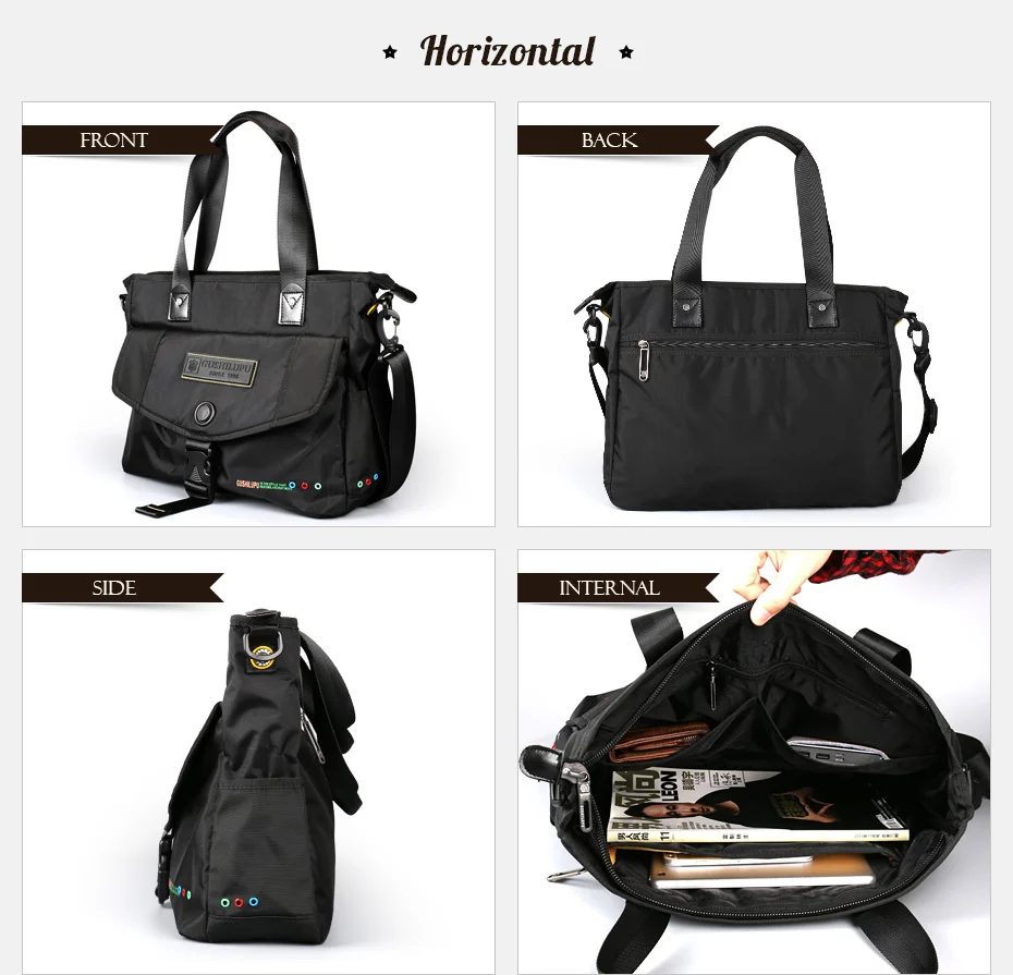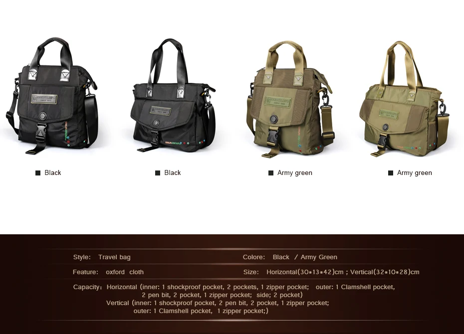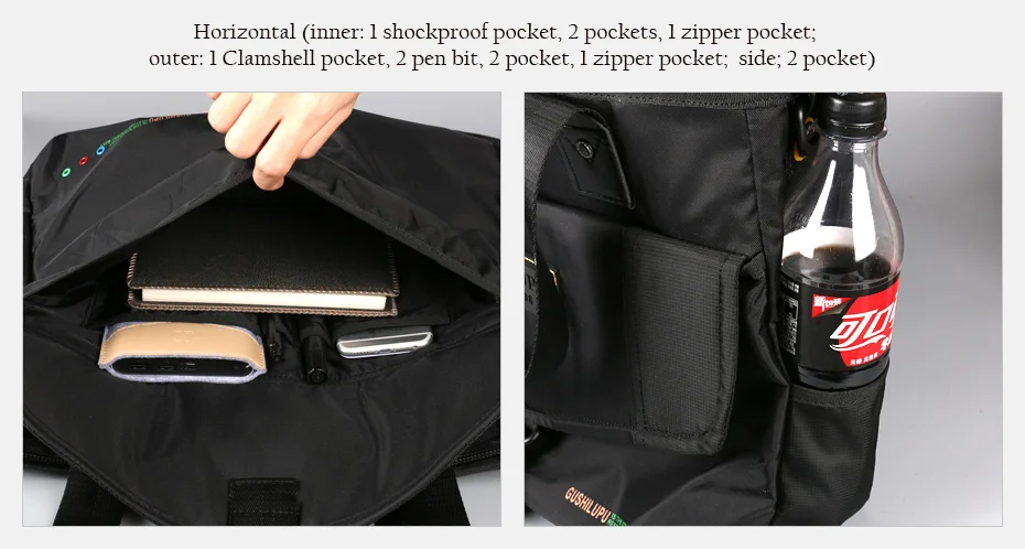 Horizontal (inner: 1 shockproof pocket, 2 pockets, 1 zipper pocket; outer: 1 Clamshell pocket, 2 pen bit, 2 pocket, 1 zipper pocket; side; 2 pocket)
