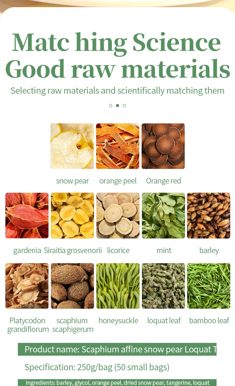Ingredients: barley, glycol, orange peel, dried snow pear, tangerine, loquat leaf, gardenia, Siraitia grosvenorii, mint,
