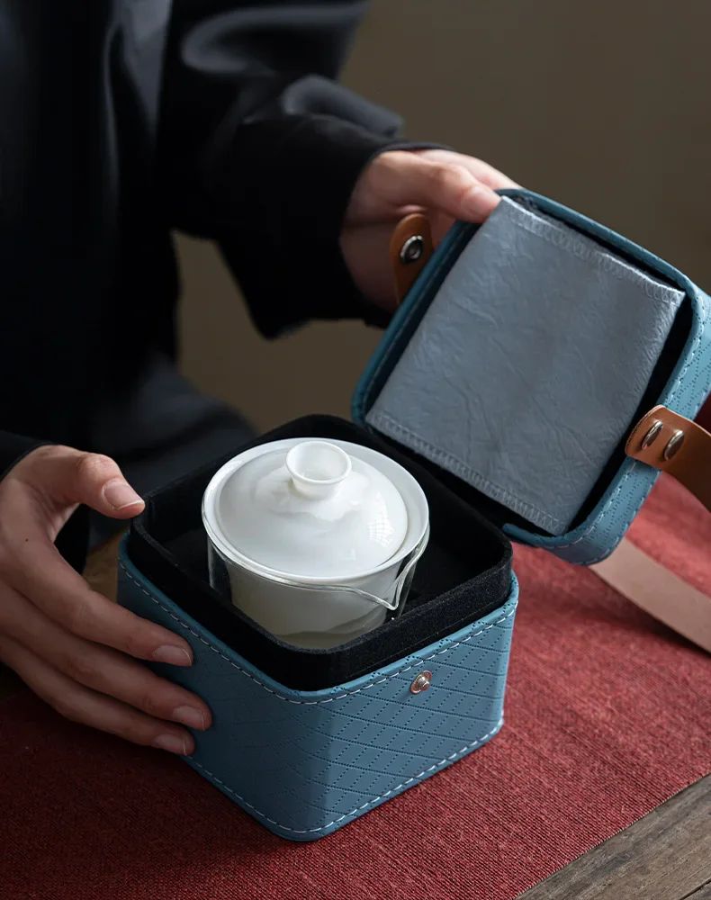 Sheep Fat Jade Porcelain Service Gaiwan Tea Cups Mug of Tea Ceremony Teapot Chinese Portable Leather Bag Kung Fu Travel Tea Set