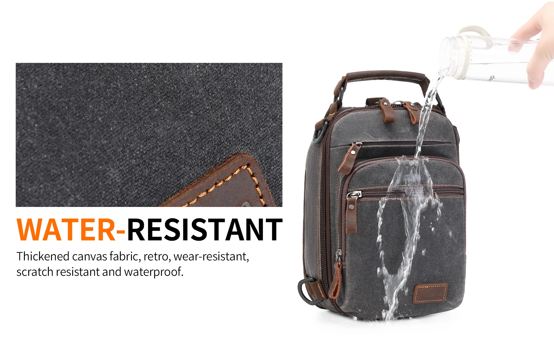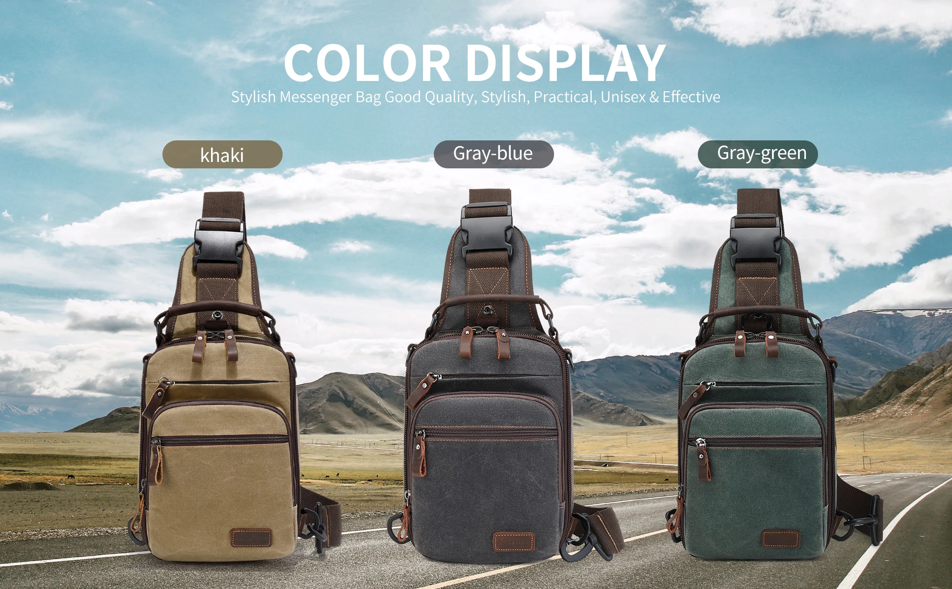 Waxed Canvas Sling Bag: This good looking bag is made of water resistant canvas material and genuine leather, handcrafted by skilled craftsmen, which make the bag durable in use and rich in looks.