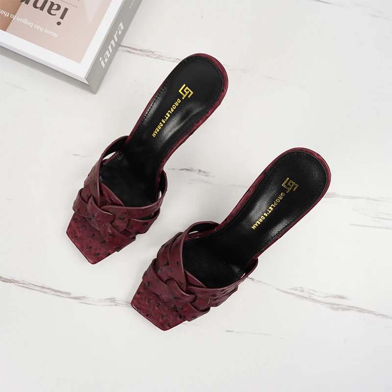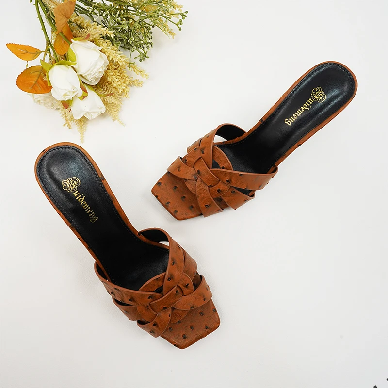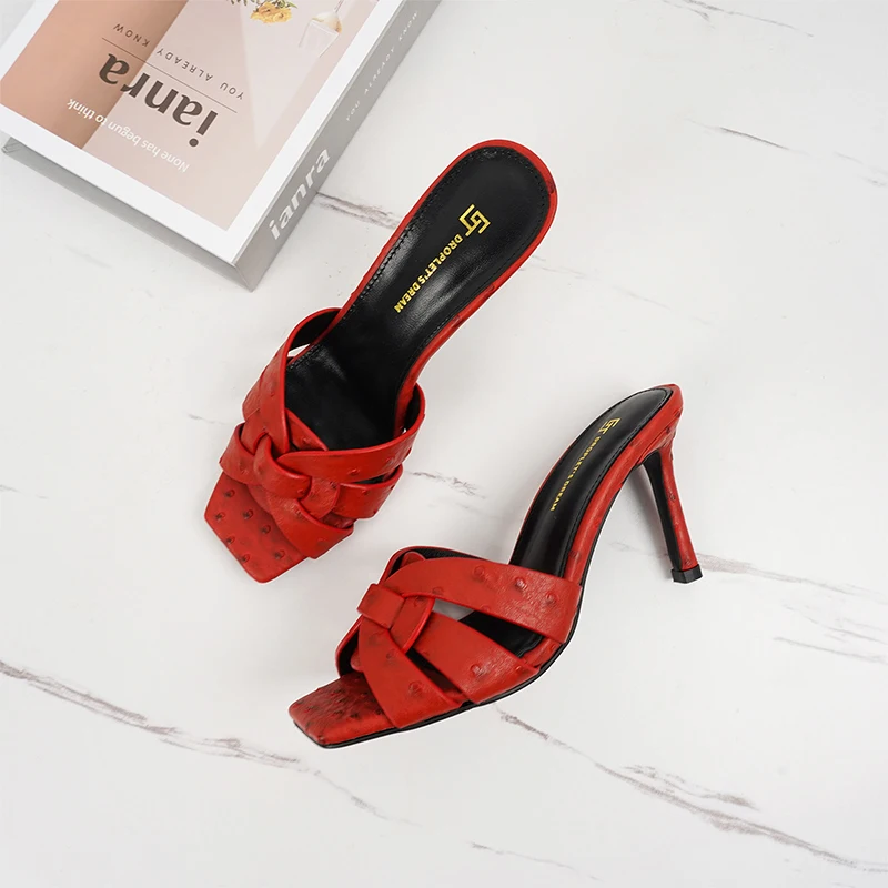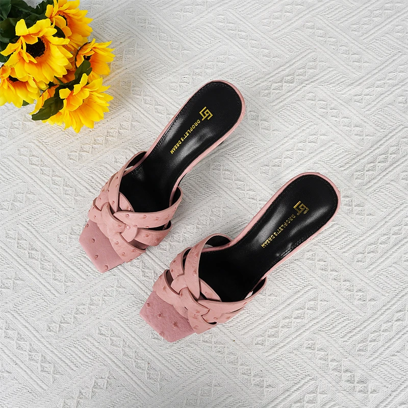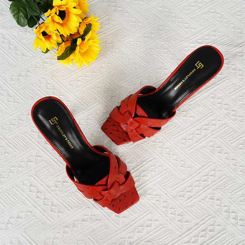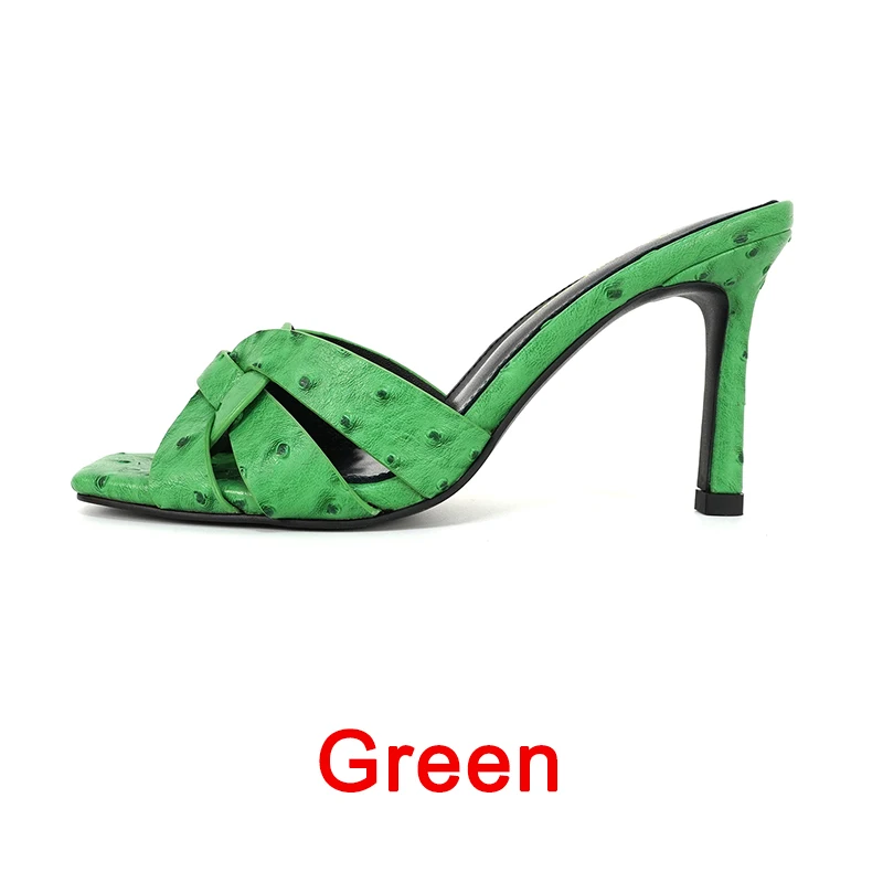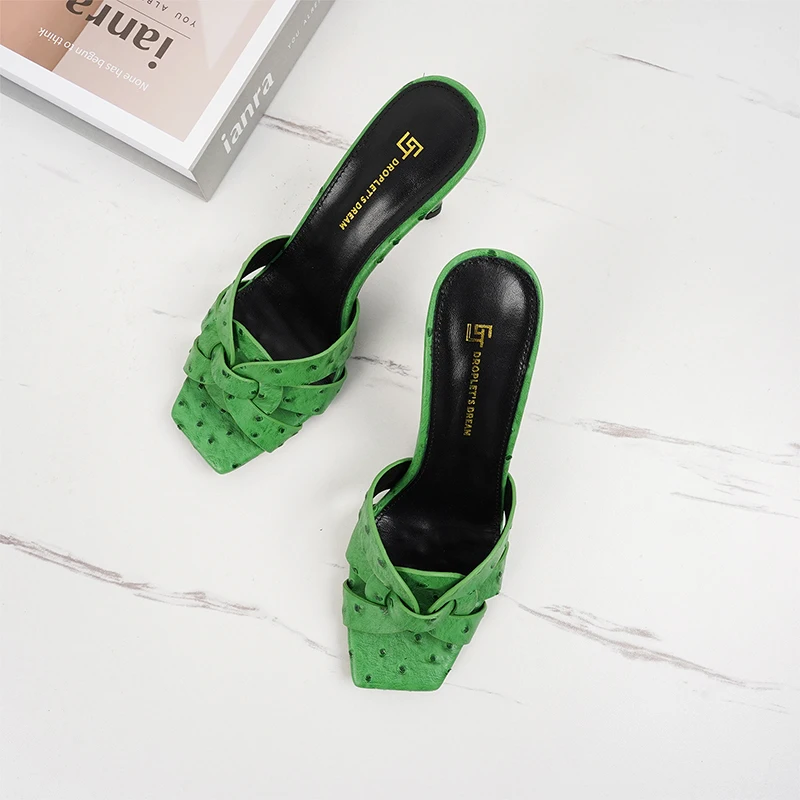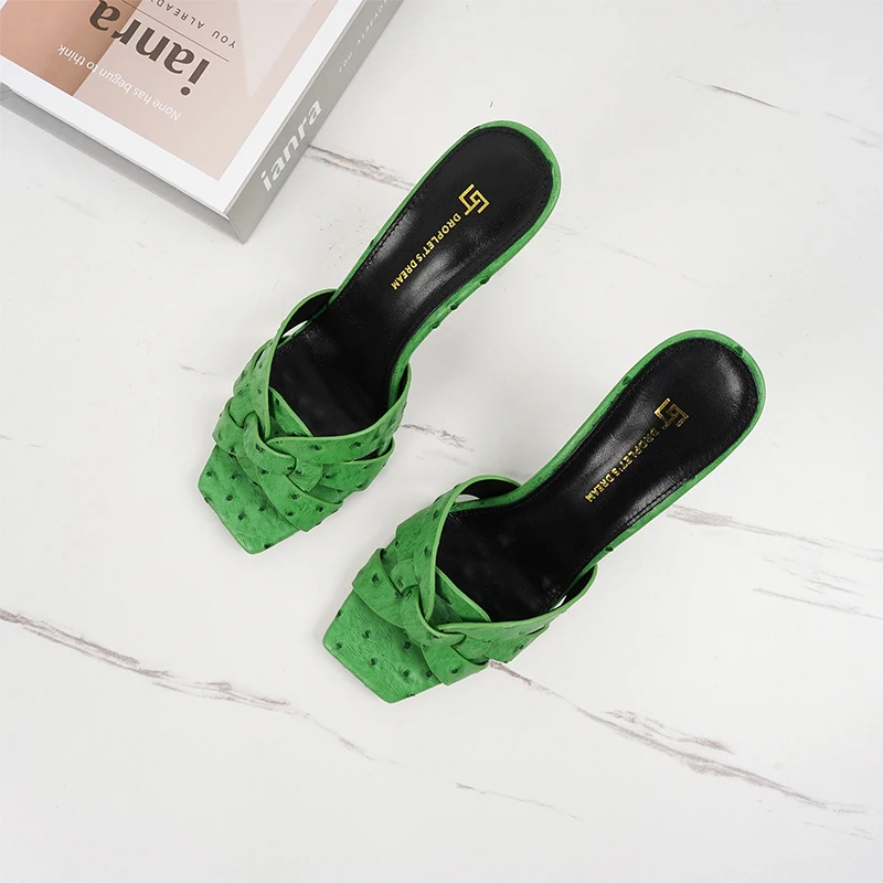 Summer High-heeled Fish-mouth Green Ostrich Women's Slippers Leather 41 42 43 44 Thin-heeled plus size Sandals