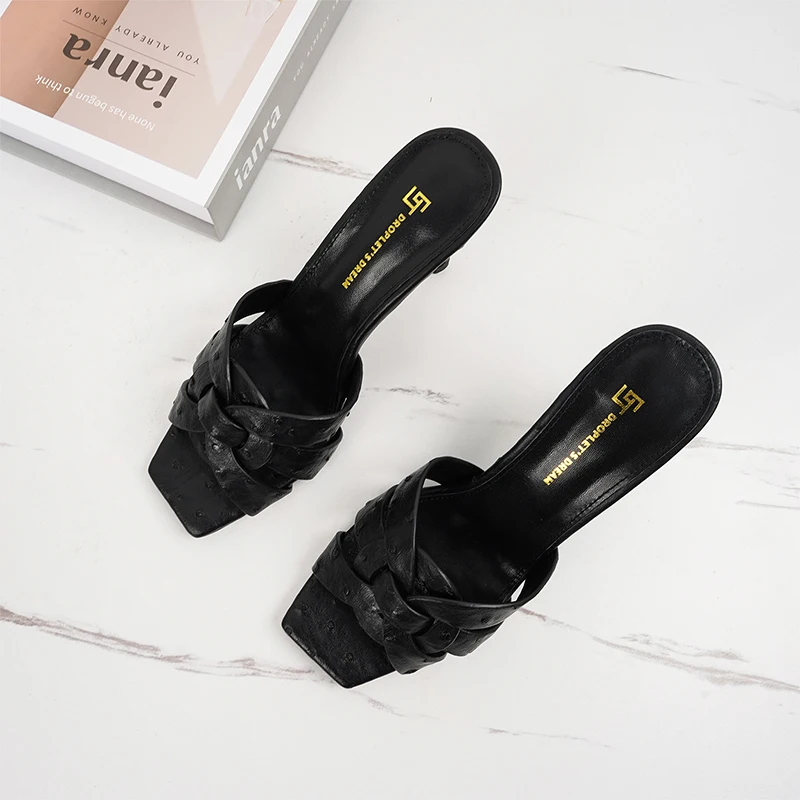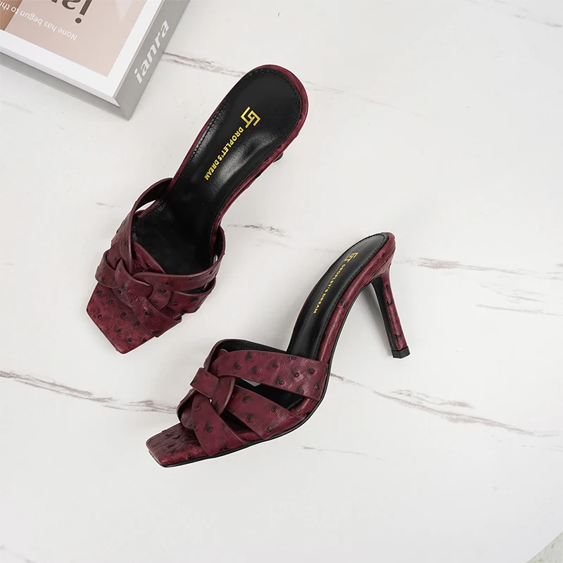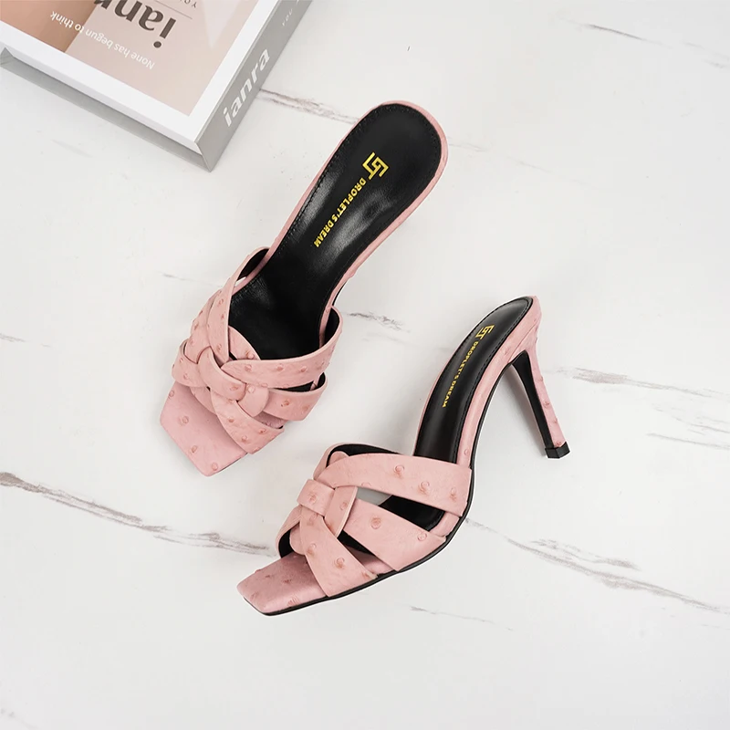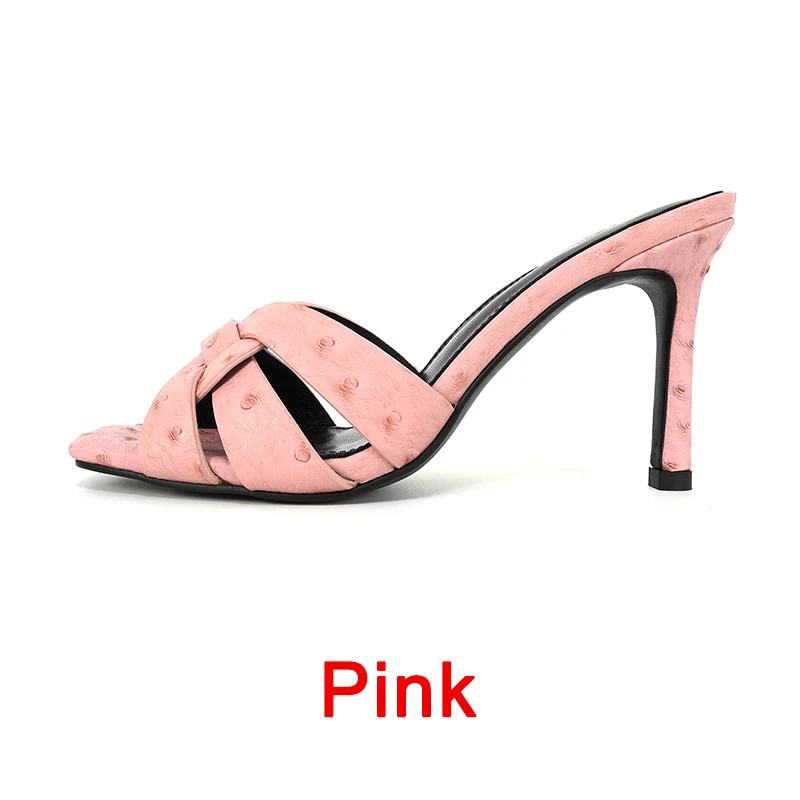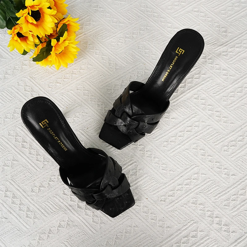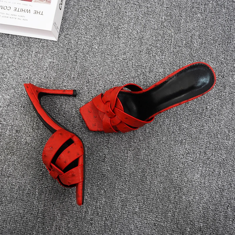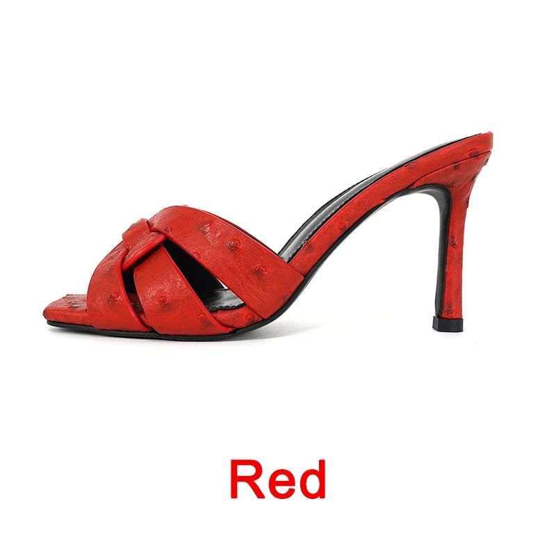 Summer High-heeled Fish-mouth Green Ostrich Women's Slippers Leather 41 42 43 44 Thin-heeled plus size Sandals