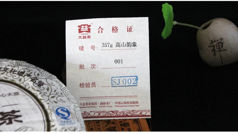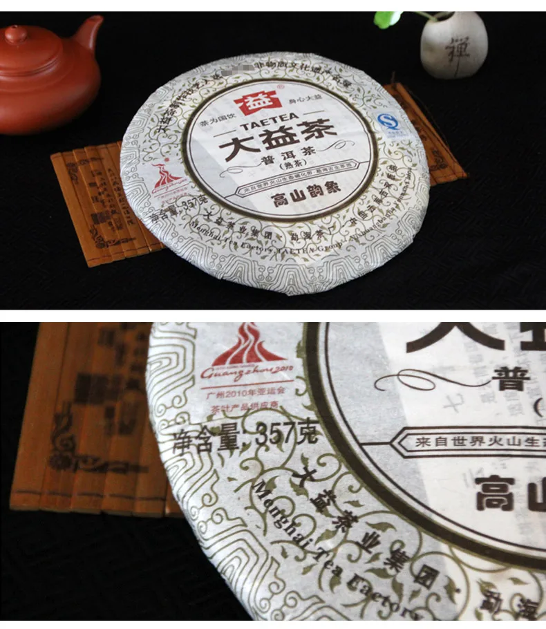 Puer Category: Ripe Pu er, Shu Pu'er Net Weight: 357g Production date: 2010 Storage time: The longer the better Batch Number: 001 Manufacturer: Dayi Tea Group, Menghai Tea Factory