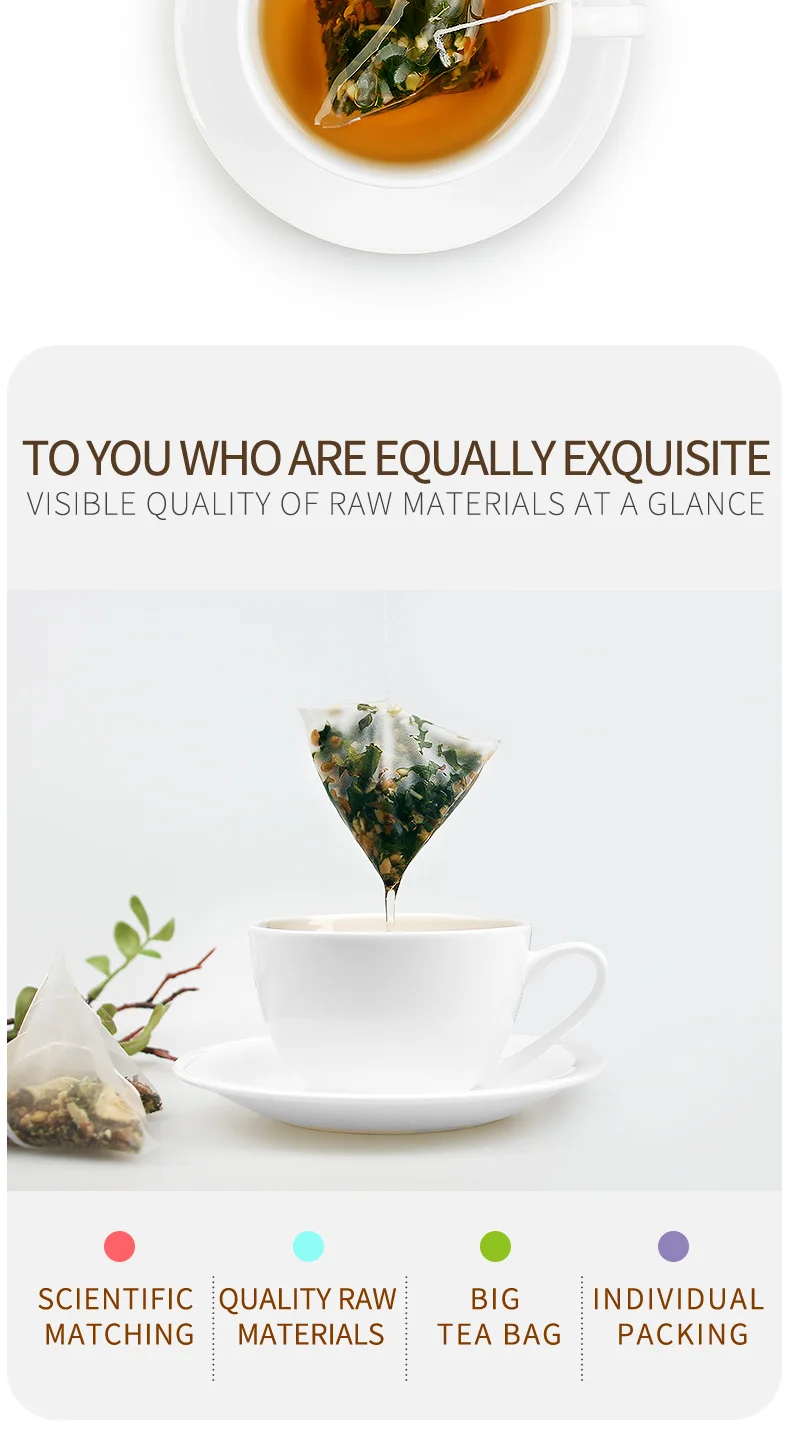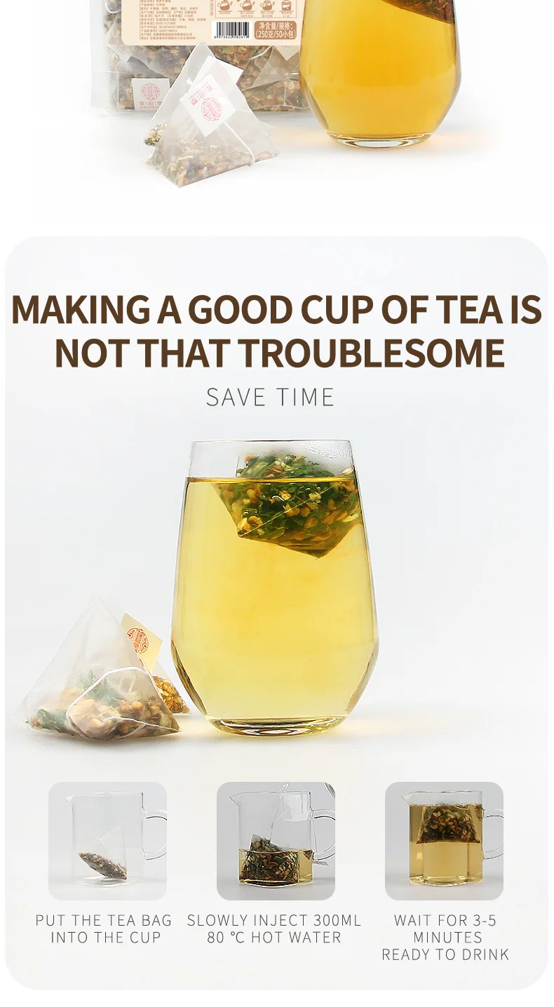 This product adopts a triangular tea bag design, which can prevent tea ingredients from entering the mouth when drinking.