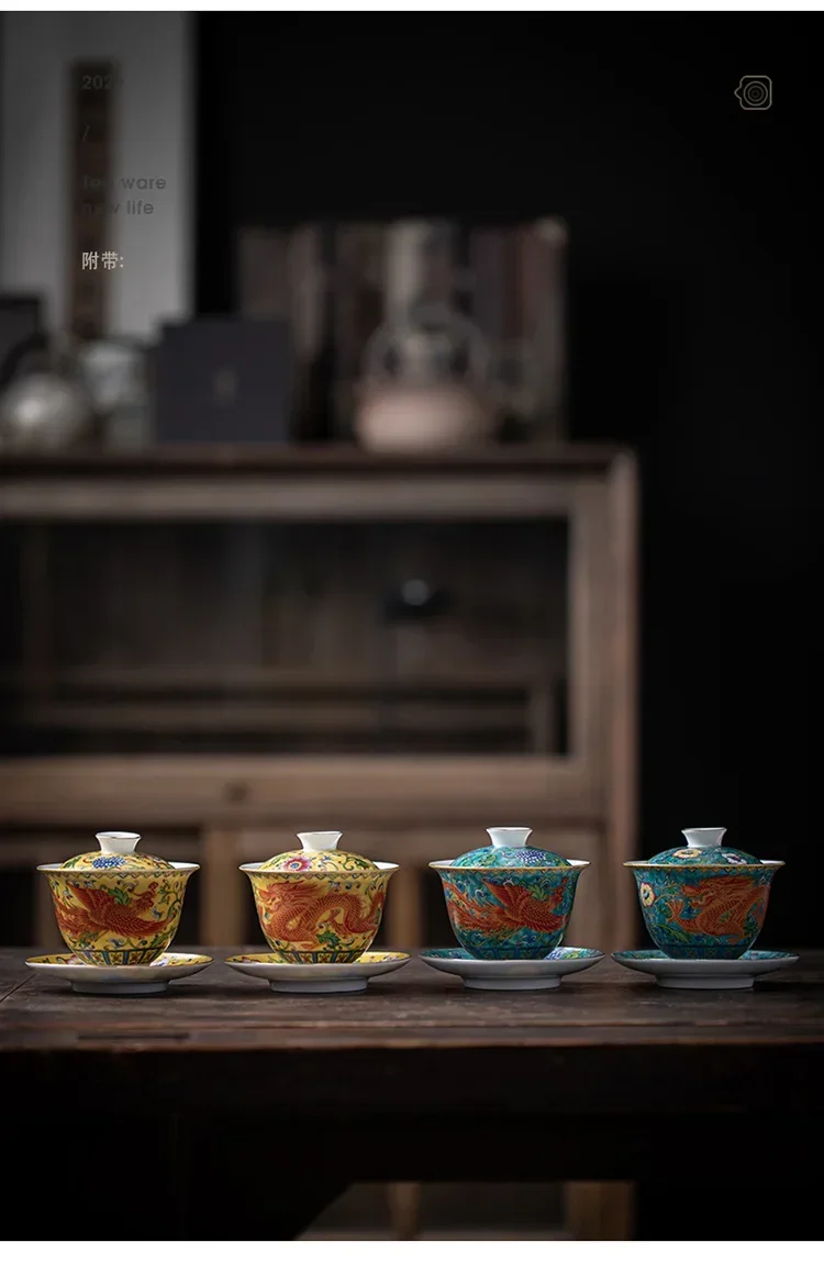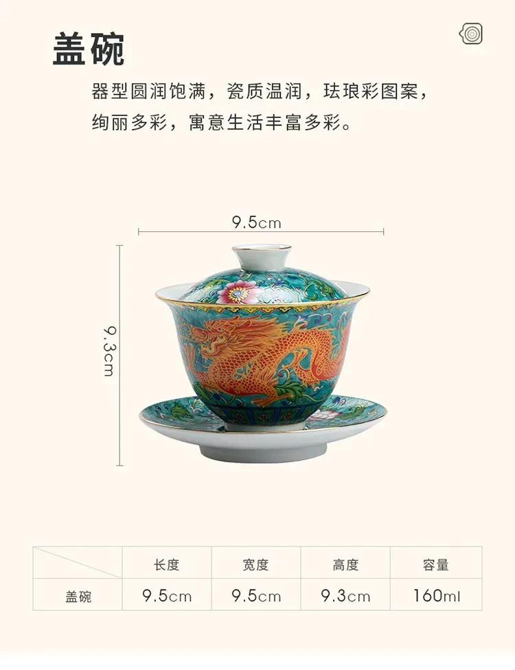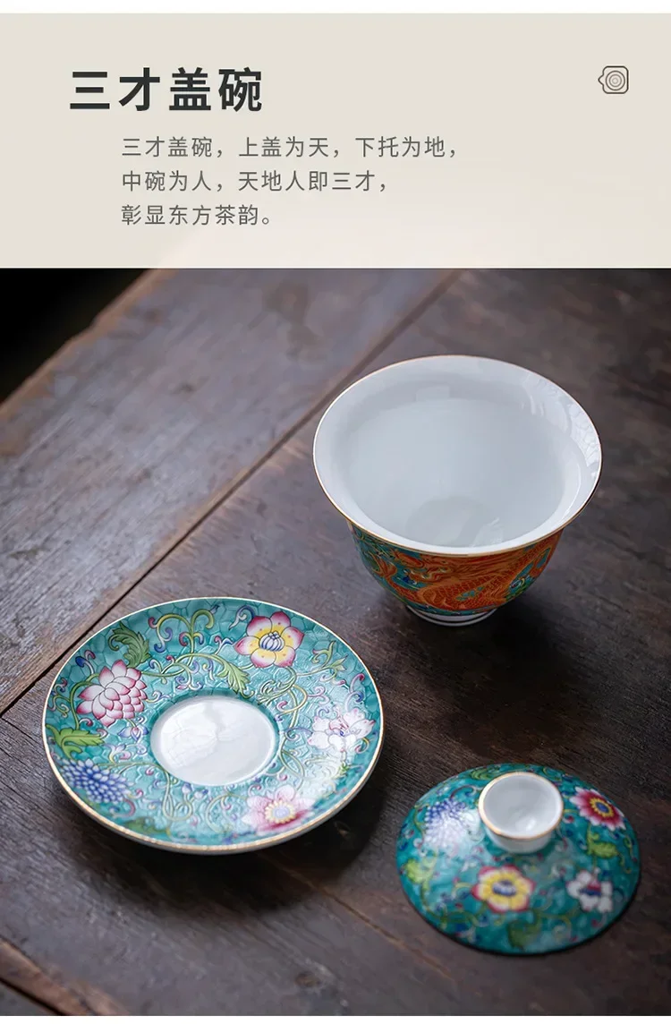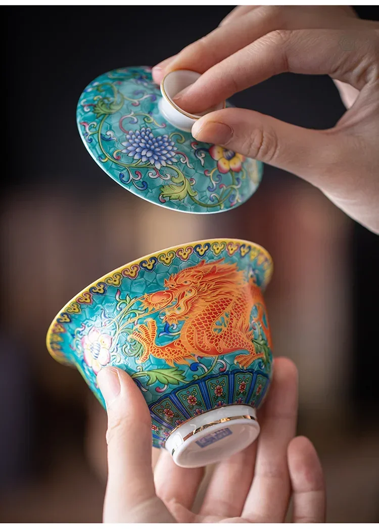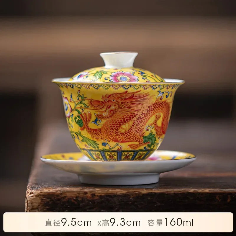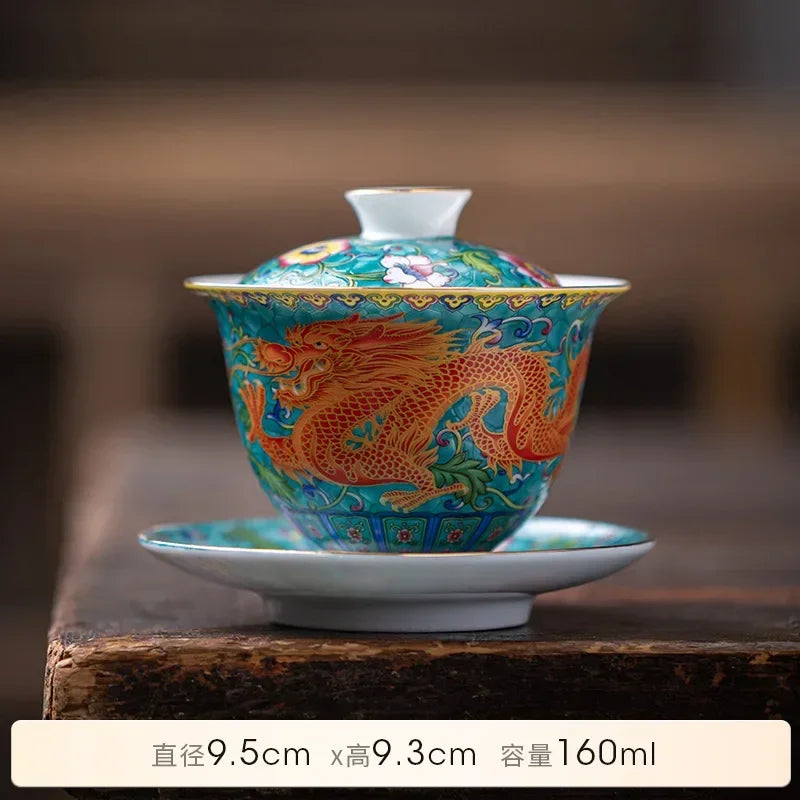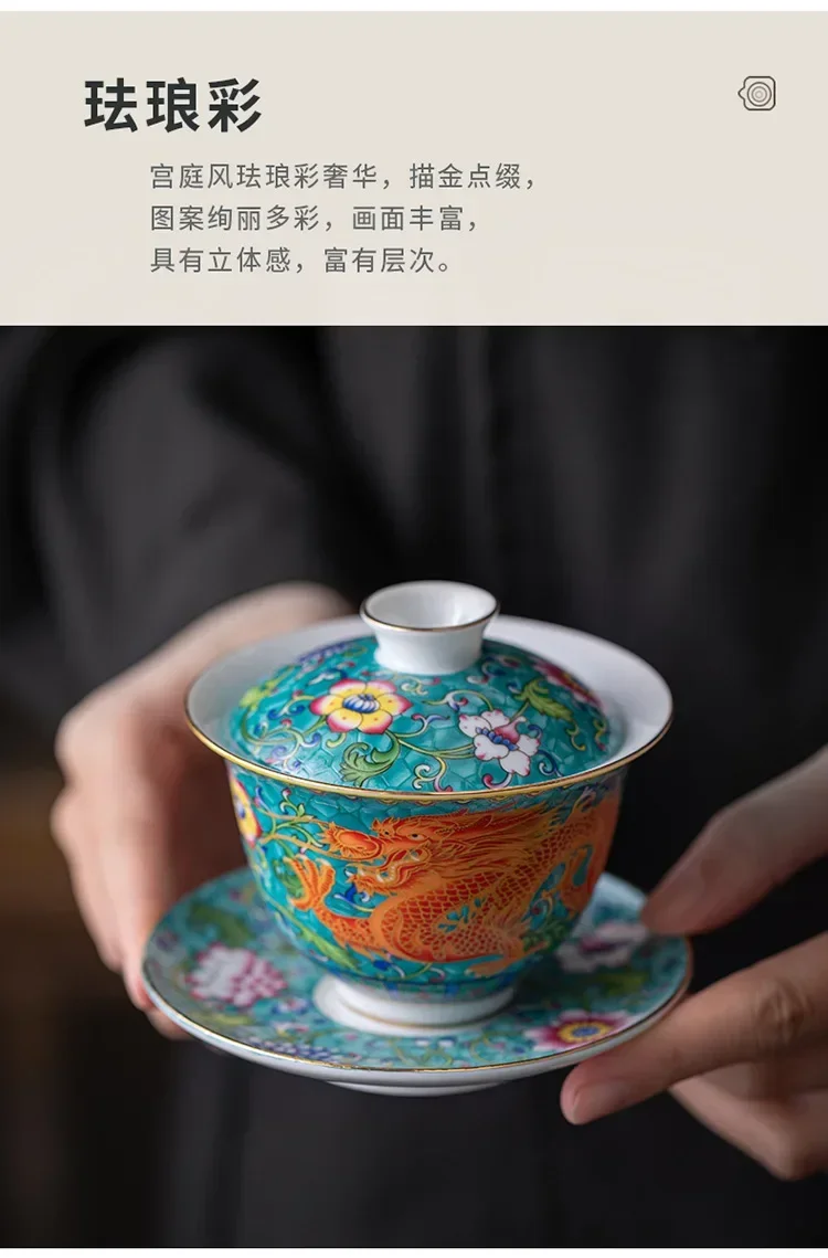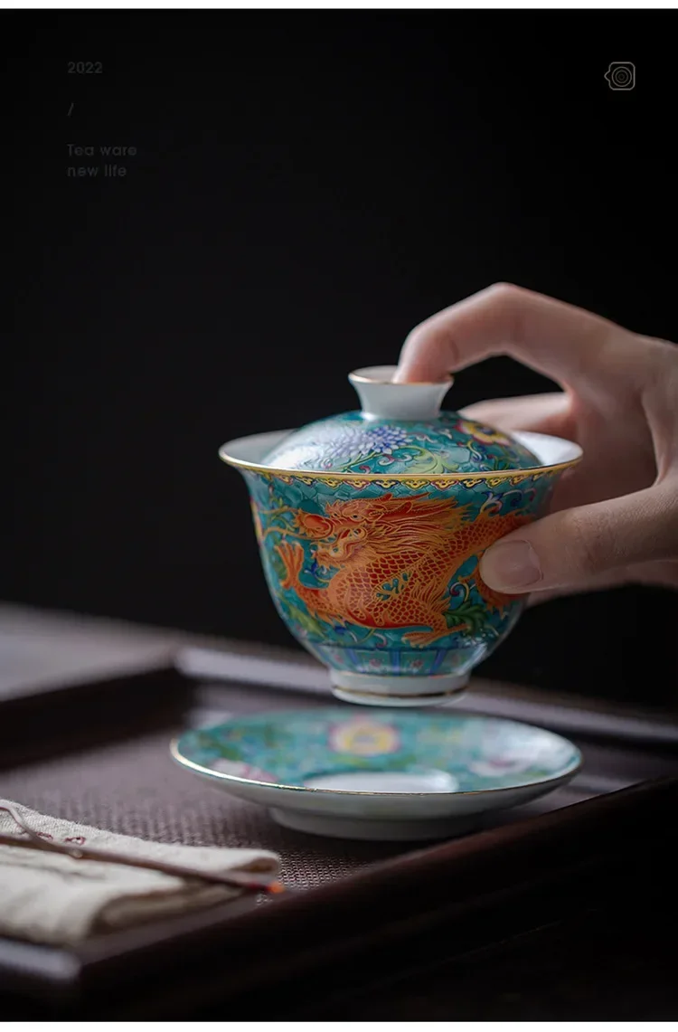 Tea Tureen Elegant Chinese Gaiwan Ceramic Dragon Hand-Painted Tea Set Color Enamel Tea Bowl with Saucer Kung Fu Tea Cup