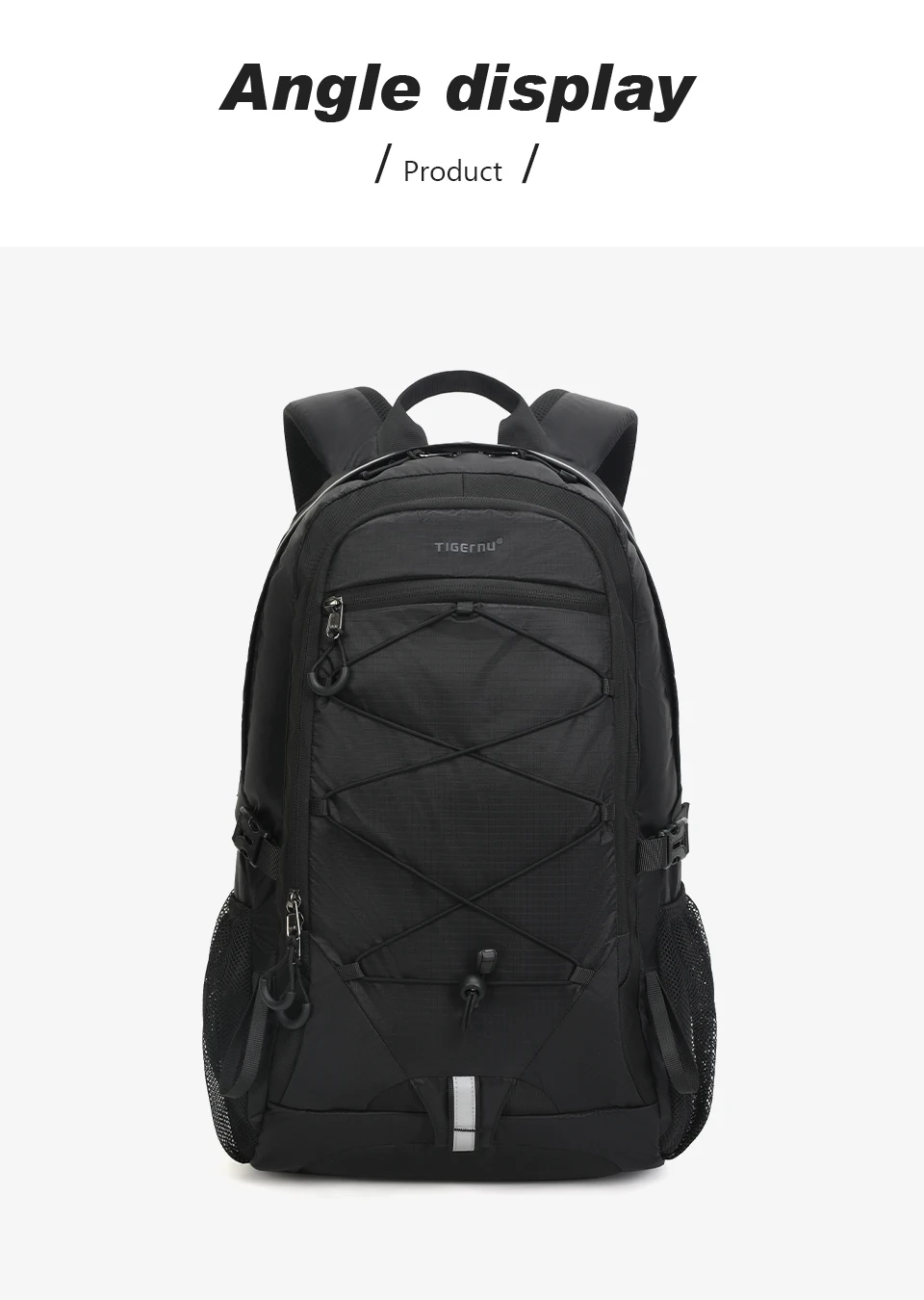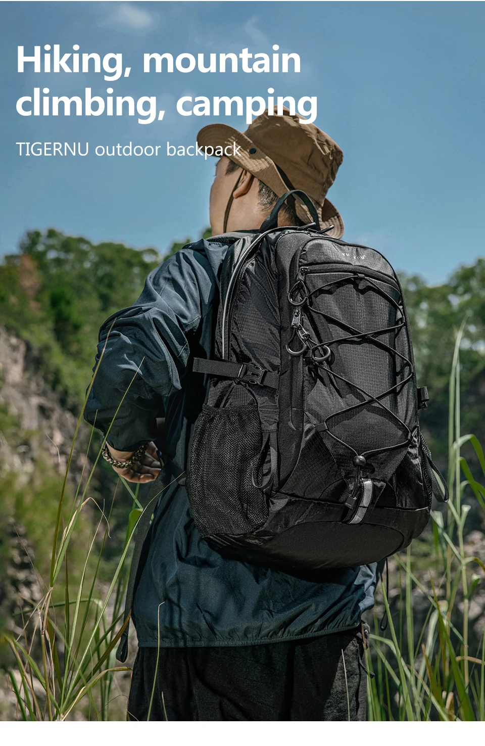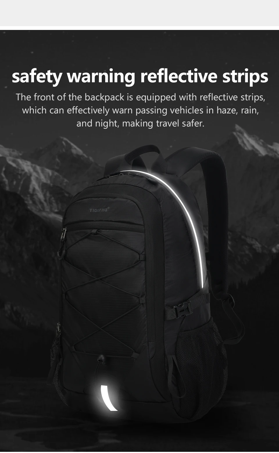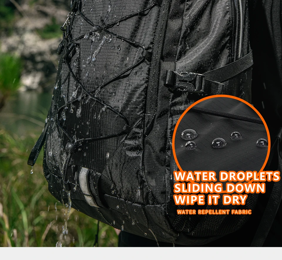 4. Mountaineering bag attributes: lightweight, easy to dry fabric, external hanging rope - easy to carry more things, bottom external hanging loop, and reflective strip - safer for travel.