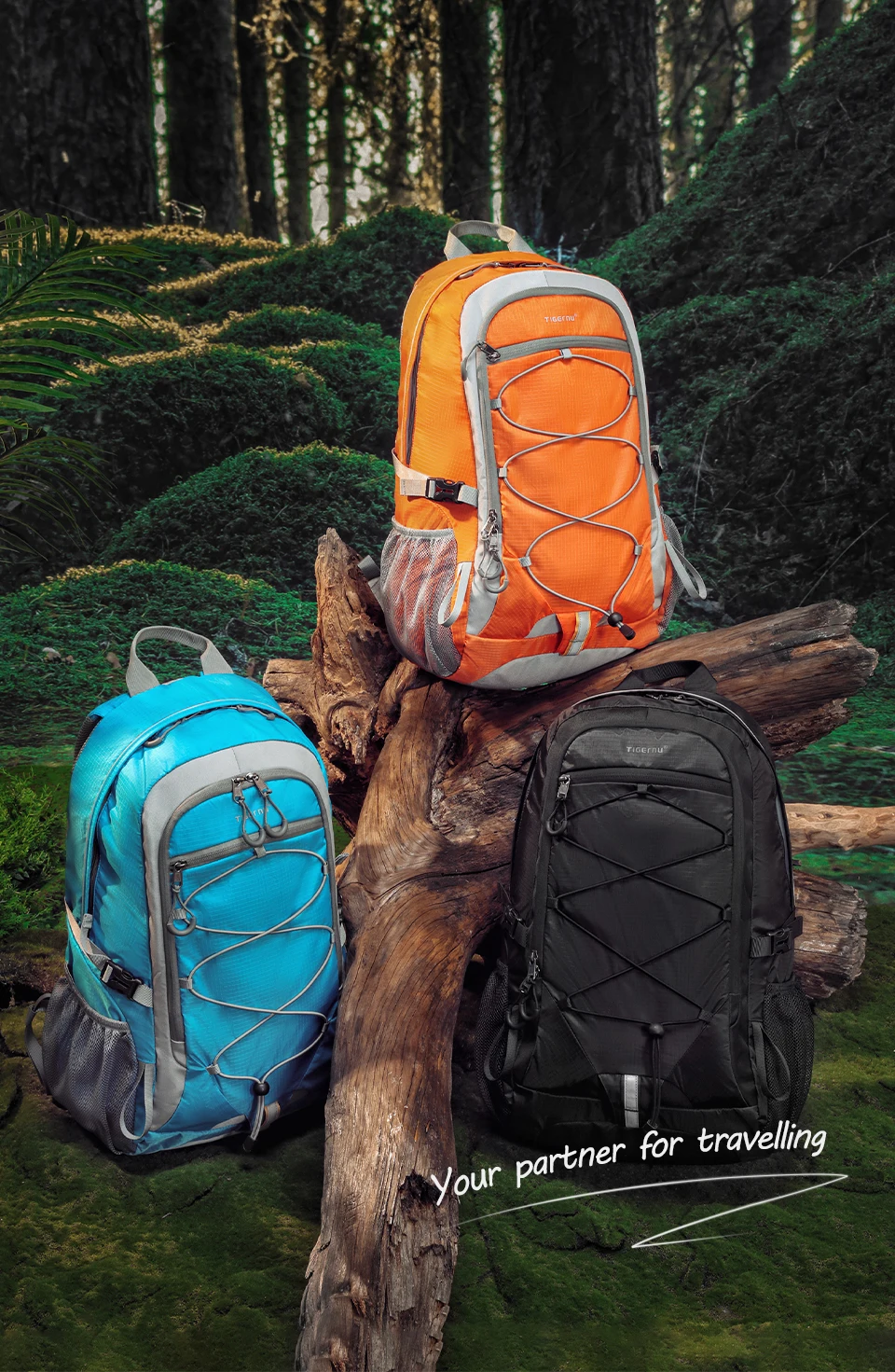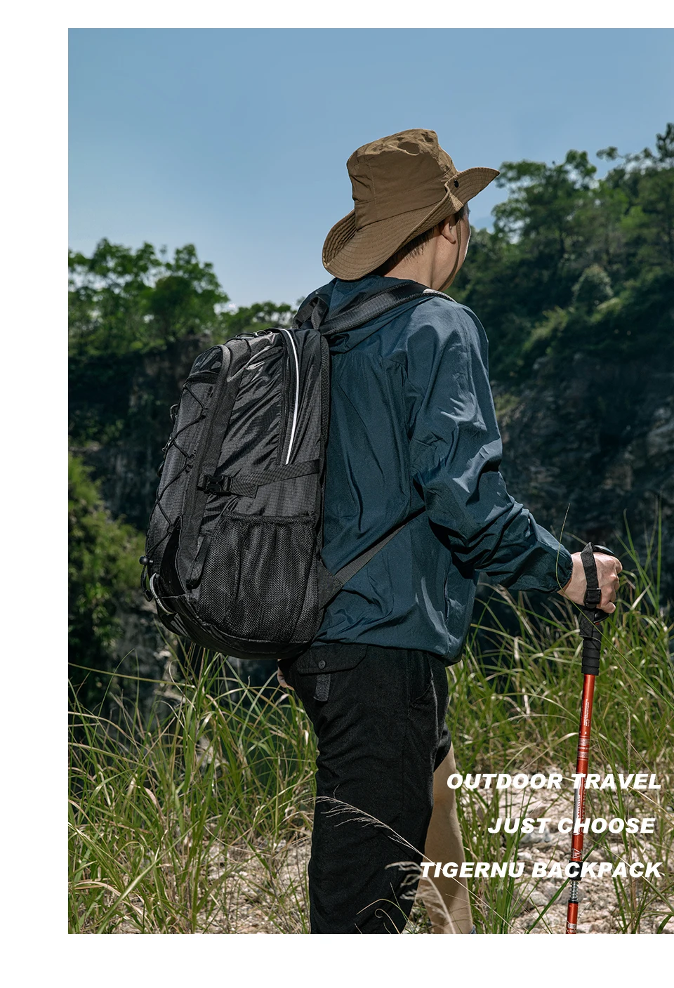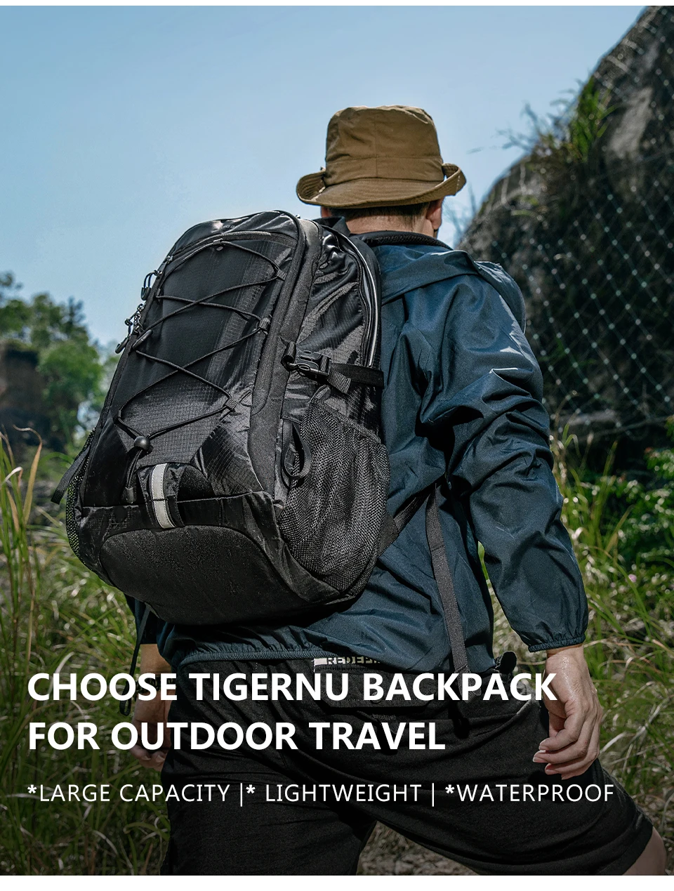 4. Mountaineering bag attributes: lightweight, easy to dry fabric, external hanging rope - easy to carry more things, bottom external hanging loop, and reflective strip - safer for travel.
