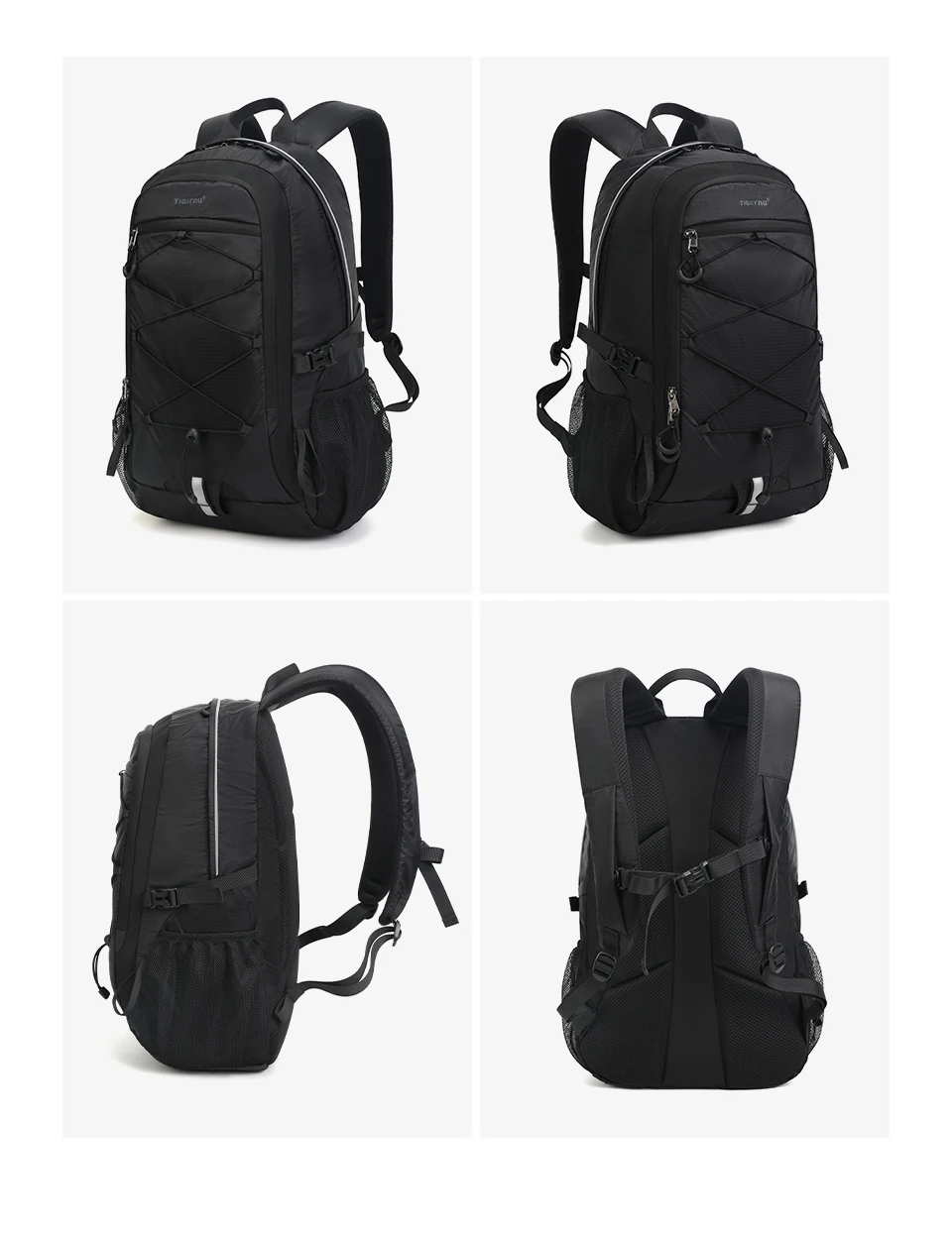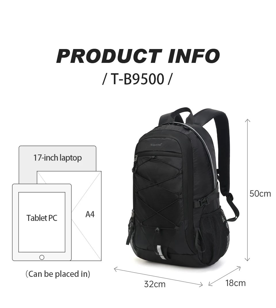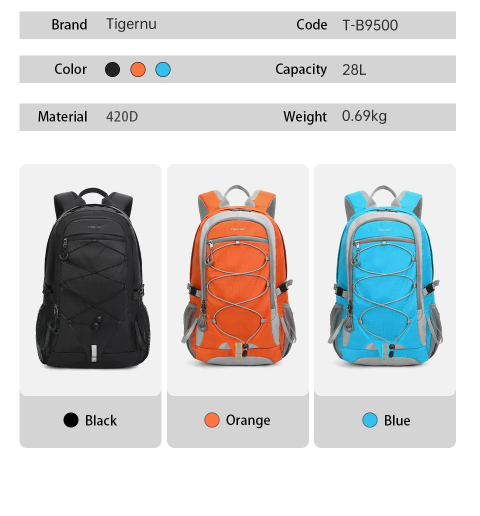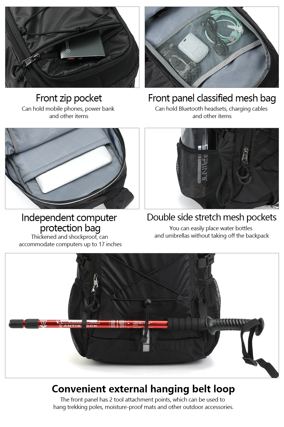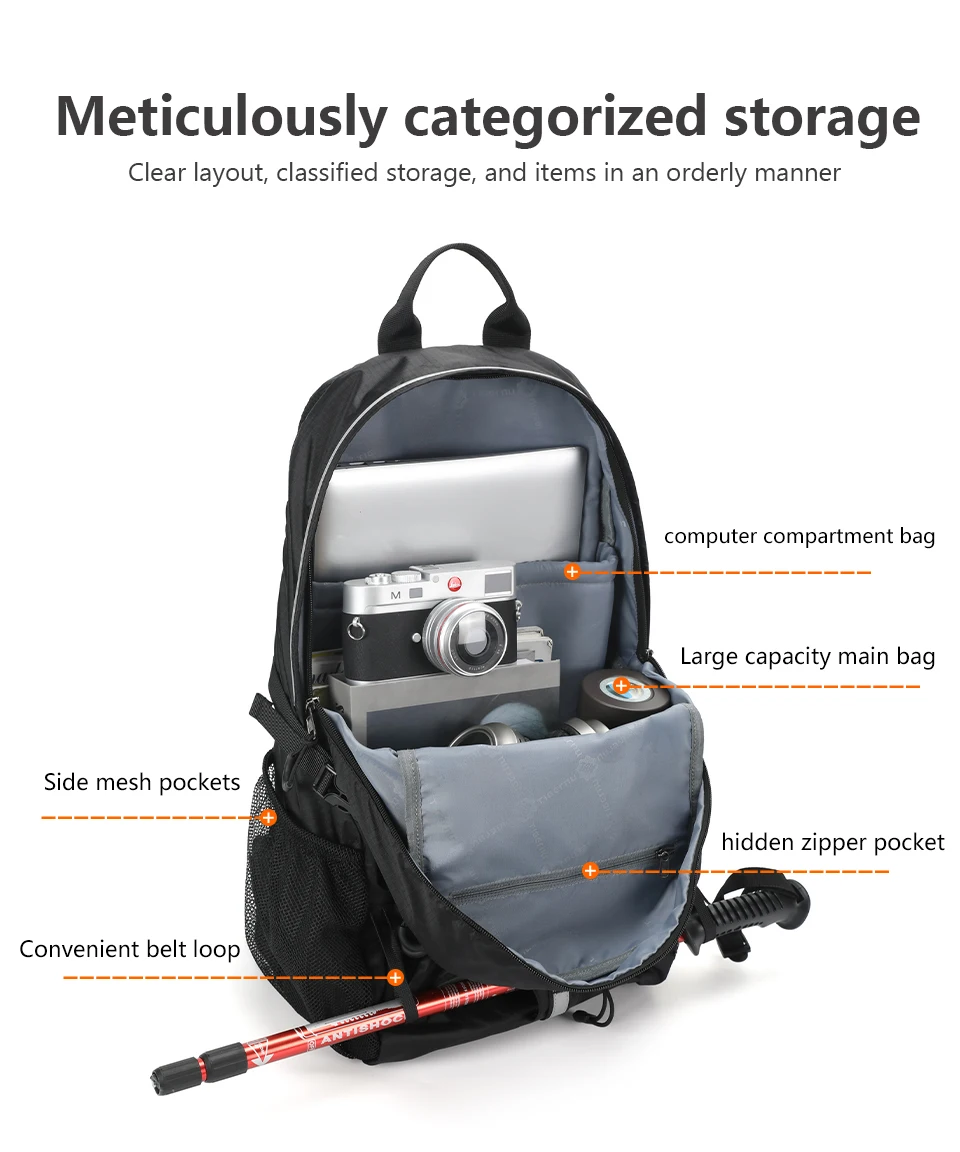 3. Pockets: Large capacity main compartment, computer compartment, waterproof storage bag, internal zipper bag, internal mesh bag, side mesh bag, external zipper bag.