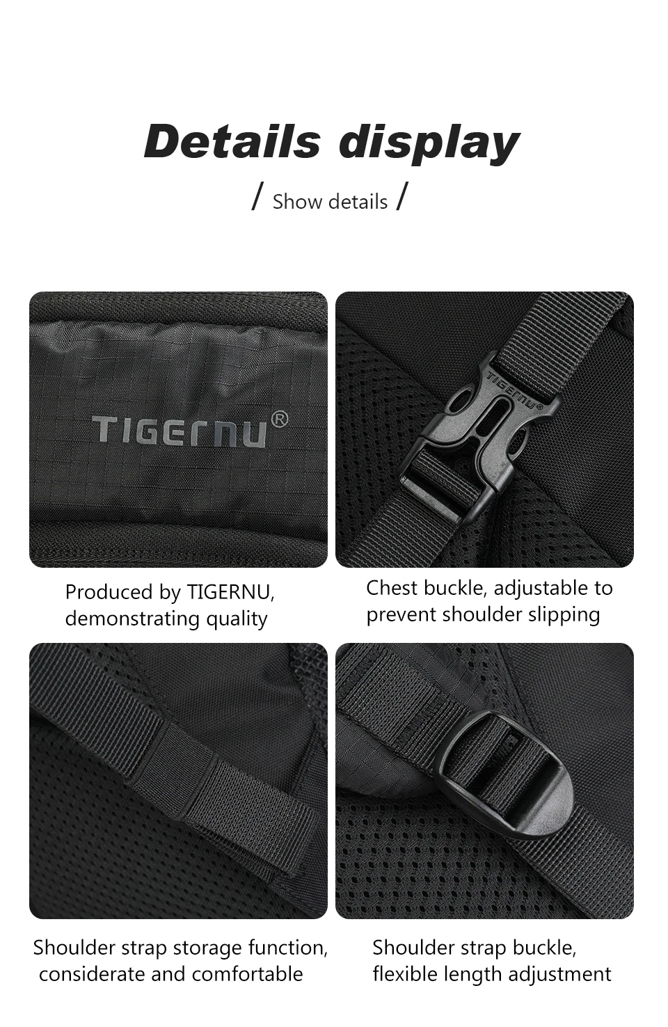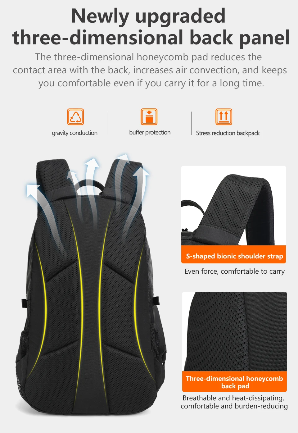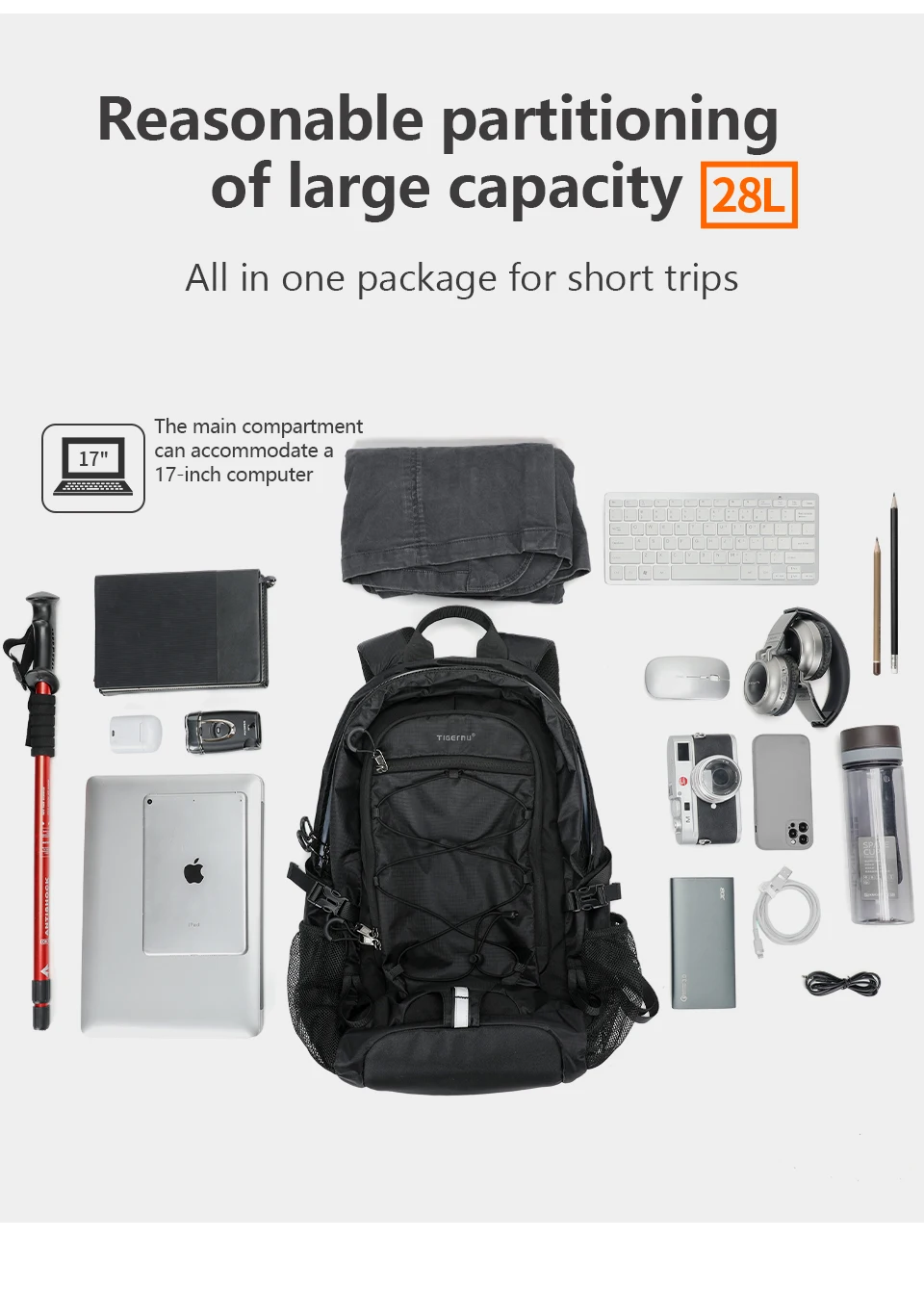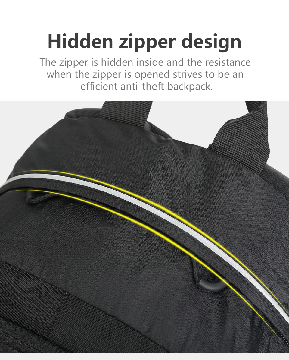 3. Pockets: Large capacity main compartment, computer compartment, waterproof storage bag, internal zipper bag, internal mesh bag, side mesh bag, external zipper bag.