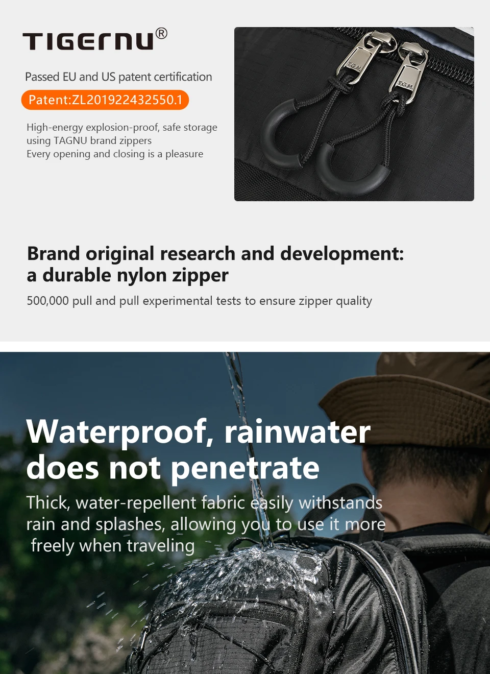 1. Zipper: Brand patent innovative zipper, Suspended design zipper, hidden zipper design, reduce friction, longer life time, lifetime warranty zipper.