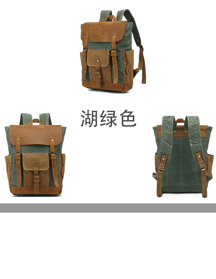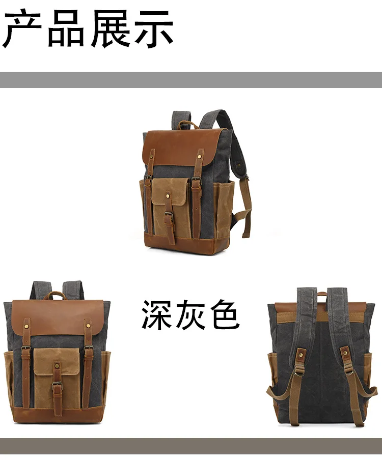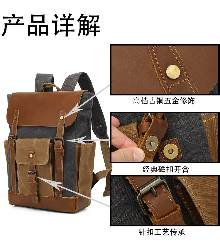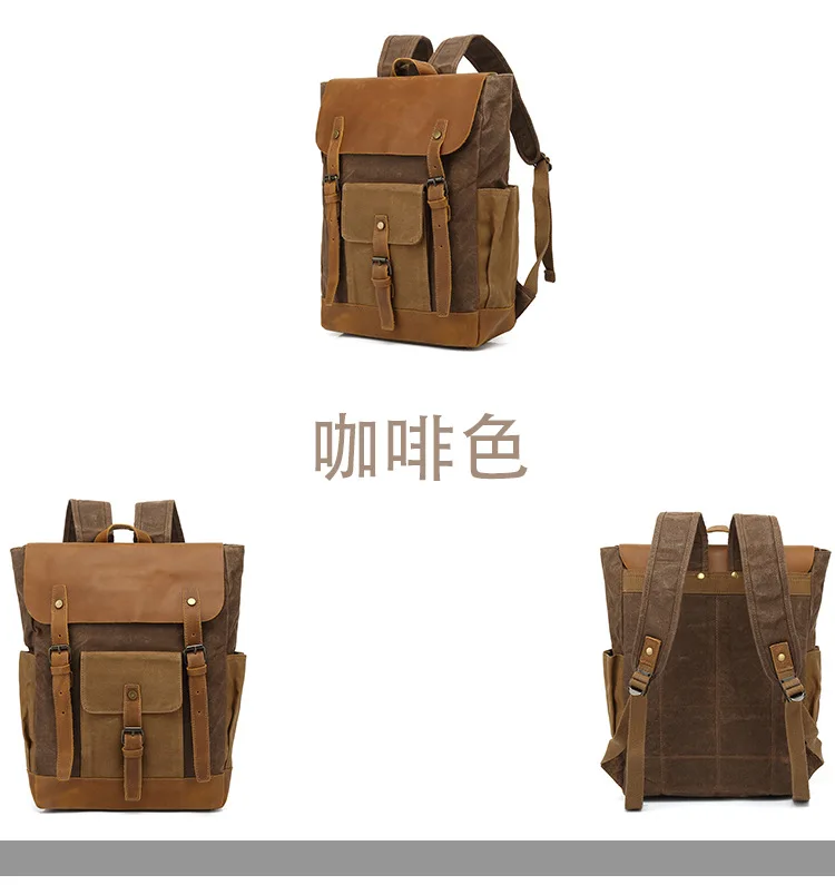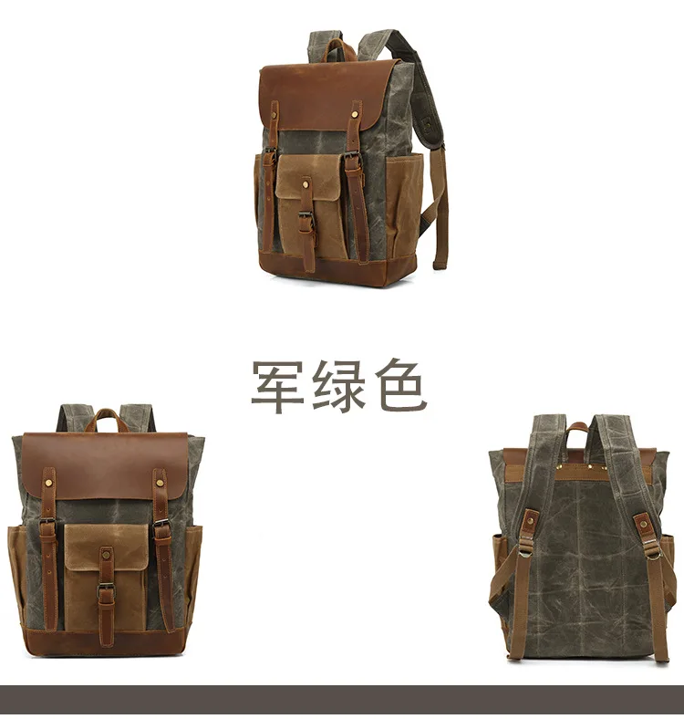 Vintage Outdoor Men Rucksack Canvas Bag Crazy Horse Leather Travel Backpack Waxed Canvas Waterproof Laptop Packsack