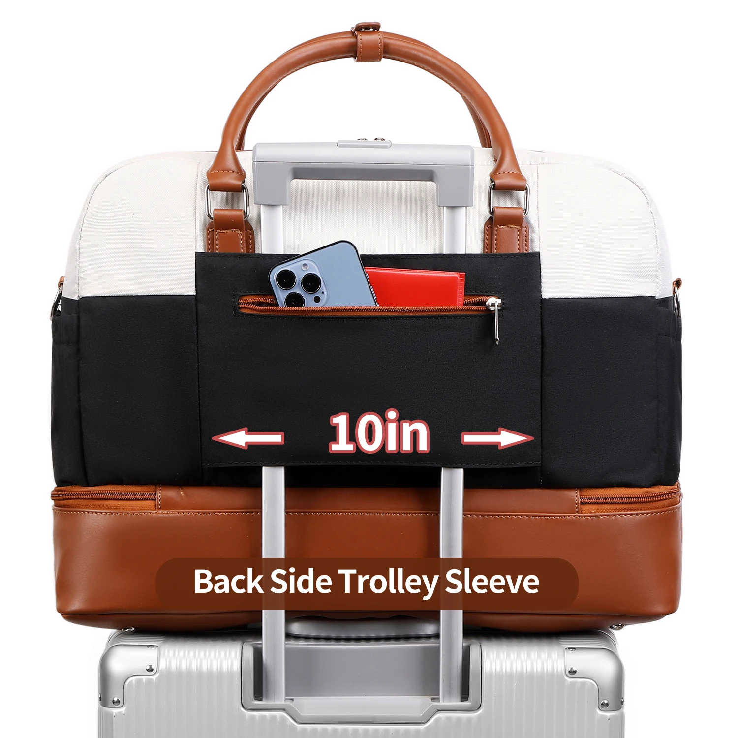 【Airplane Friendly Travel Tote Bag for women& Back Side Trolley Sleeve】The perfect carry-on compliant bag for airline travel. Back side luggage sleeve allows you to slide it over the handle of rolling suitcase or luggage, preventing travel weekender bags falling and freeing your hands. A zipper pocket on the back to hold your phones, ID cards or passports, easy to take any time. There are 3 inner pockets to store small items separately. Your ideal overnight weekend boarding bag for travel.