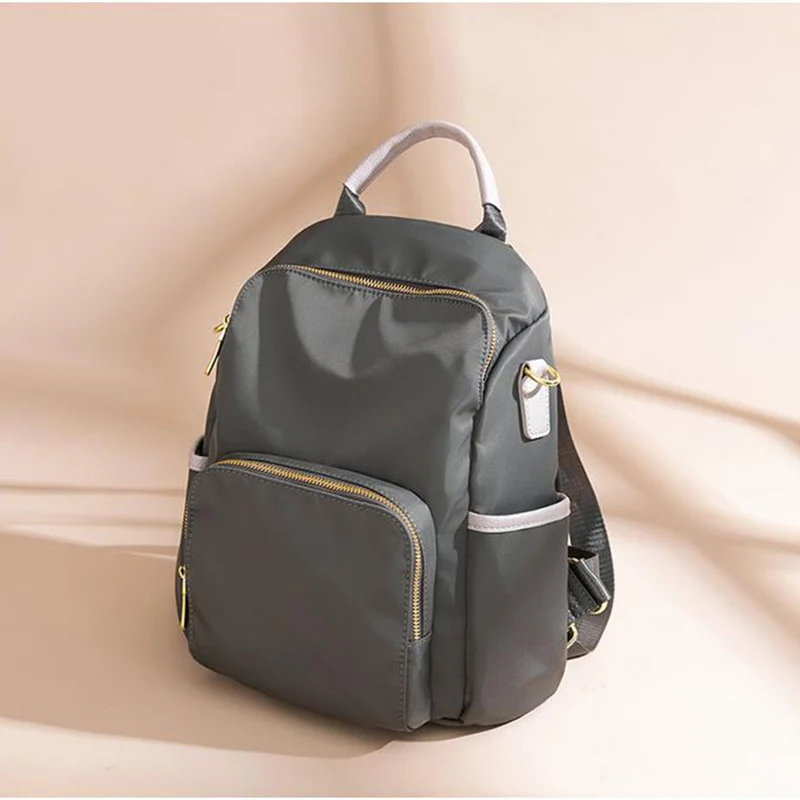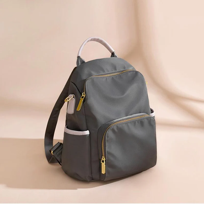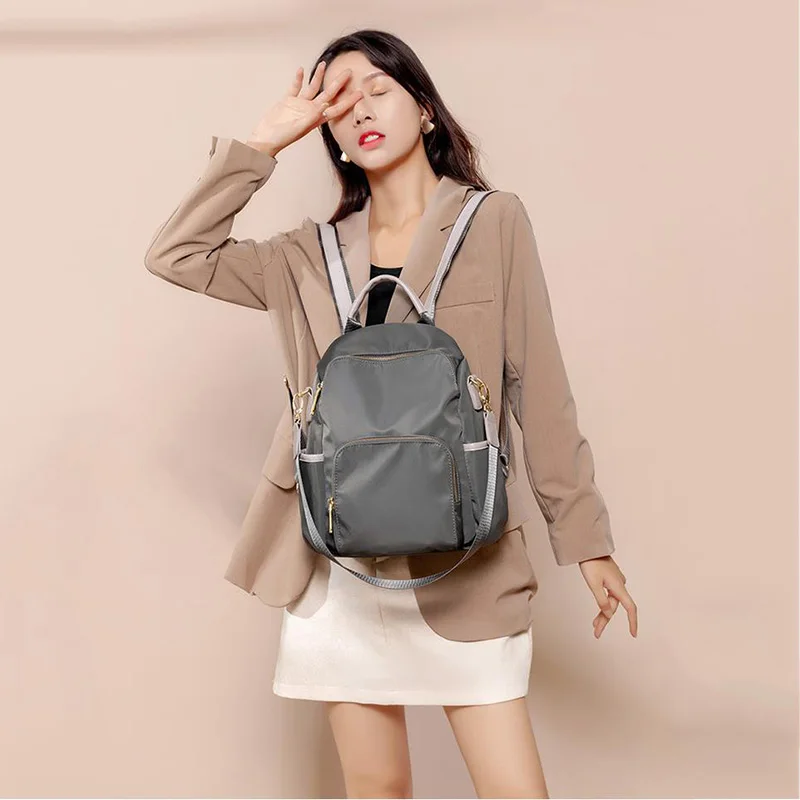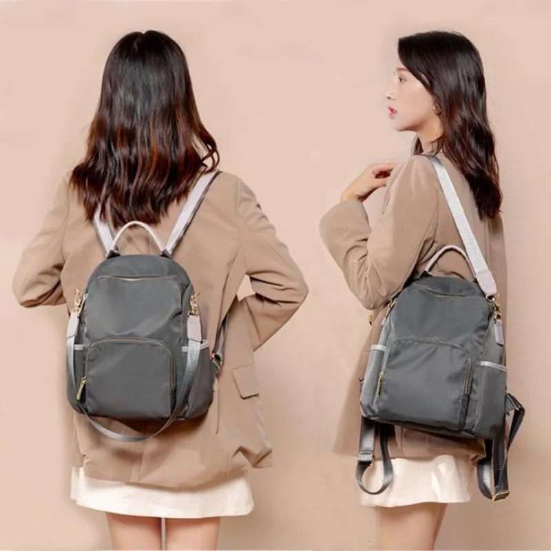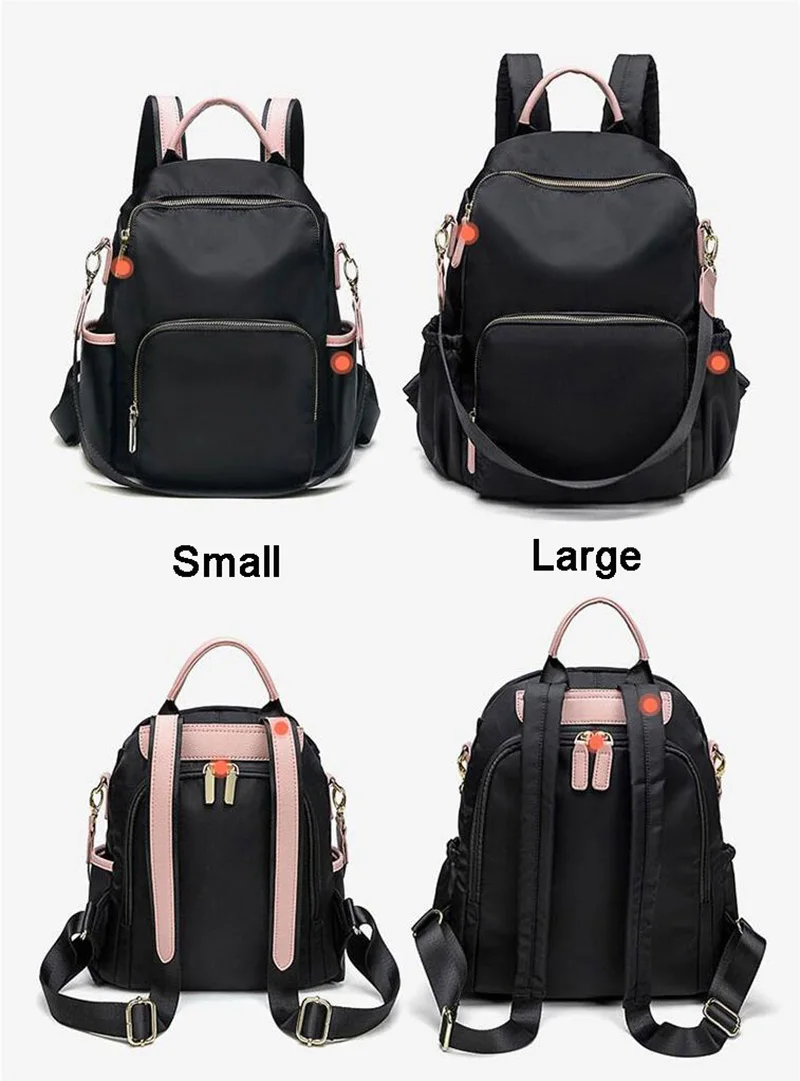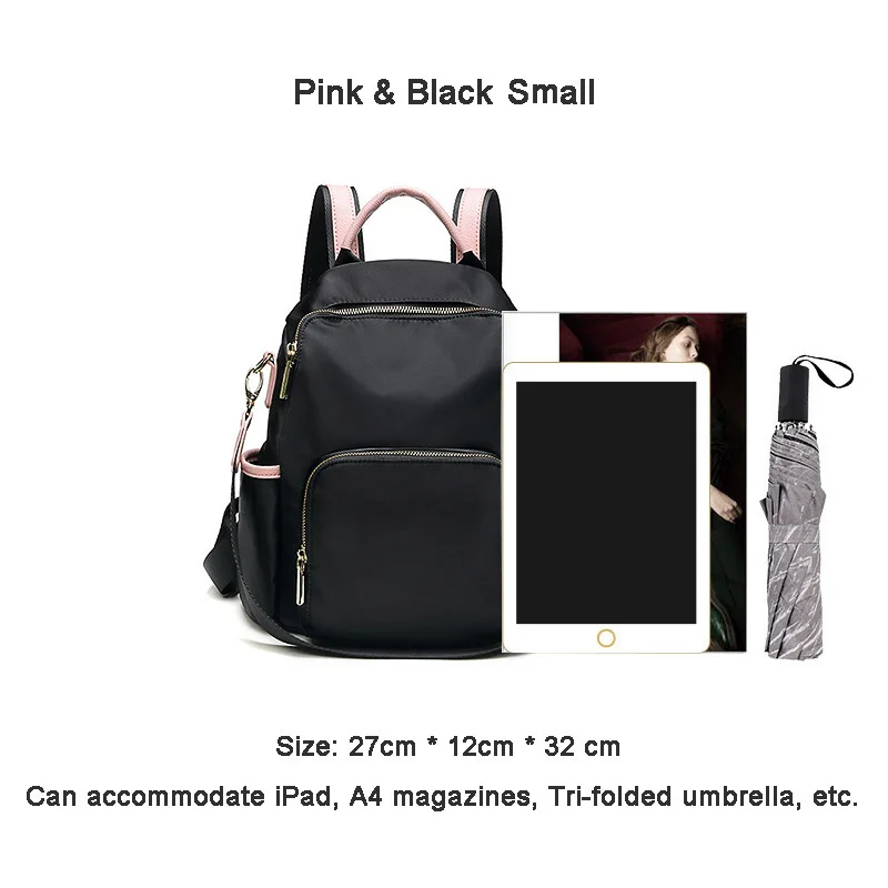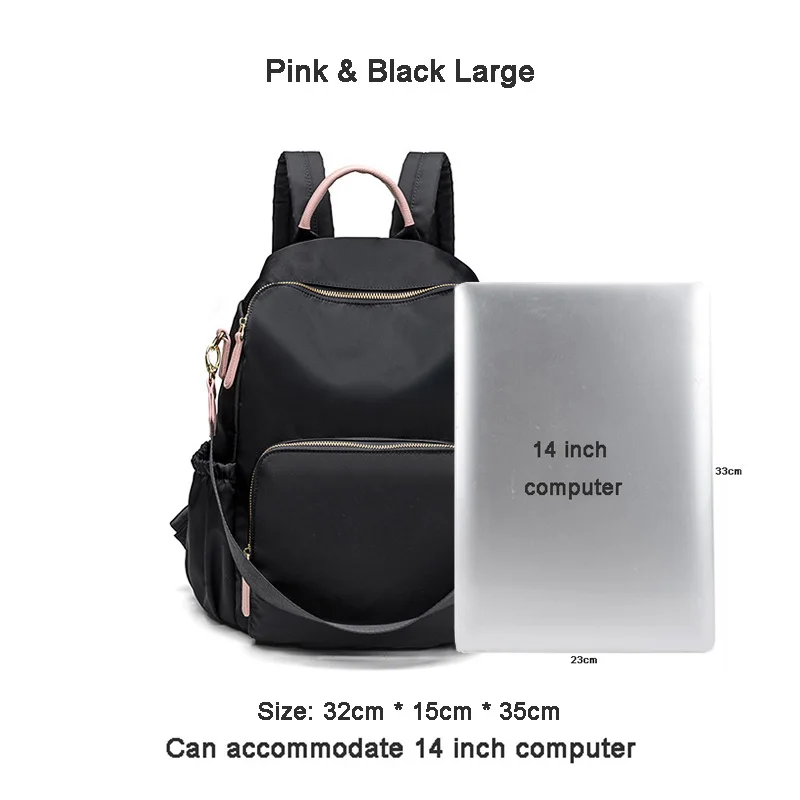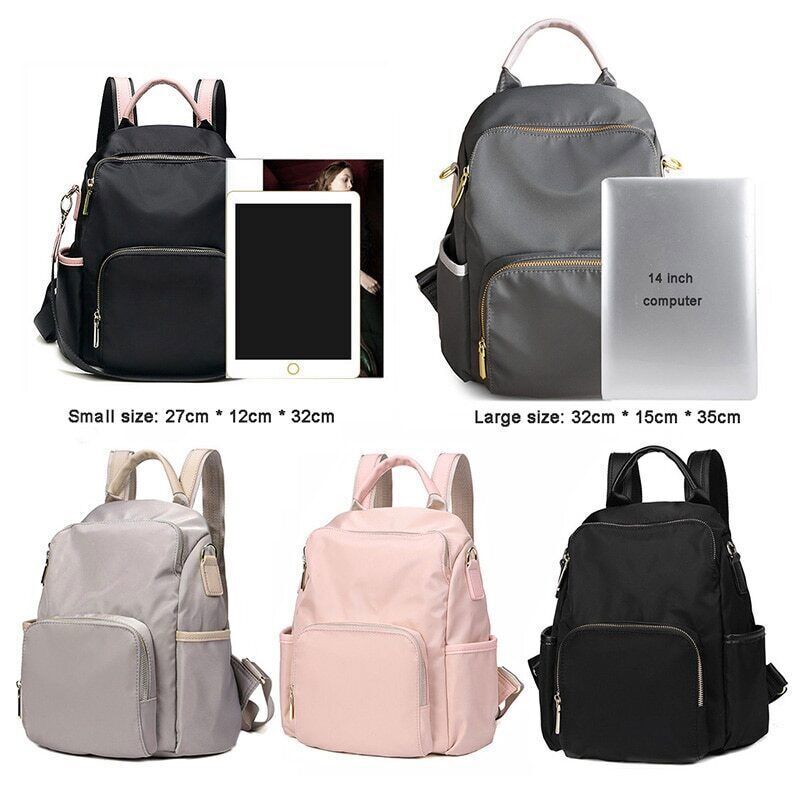 Name: Women Backpack Fashion All-match Oxford Cloth Lady Business Travel Leisure Canvas Bag Girl Large-capacity Anti-theft Schoolbag Material: Fabric: Nylon Sizes: Two sizes are avaiable Colors: black, grey, pink, apricot, black with pink. Warm tips: The hardware of this model is gold color, if you mind it , please enter the following link for dark gery color hardware, thanks.