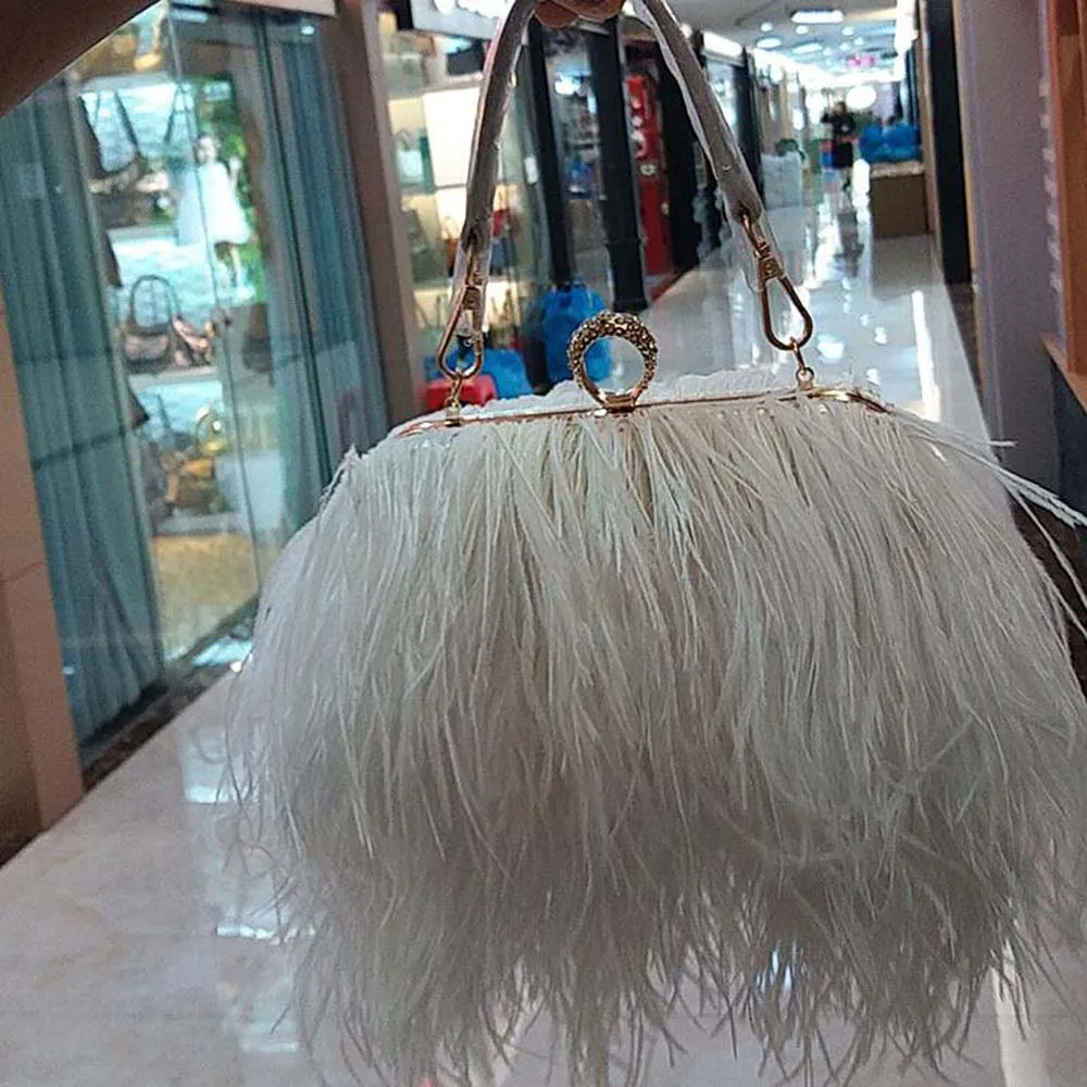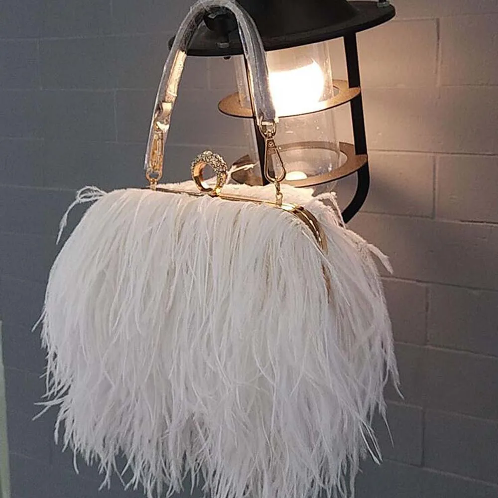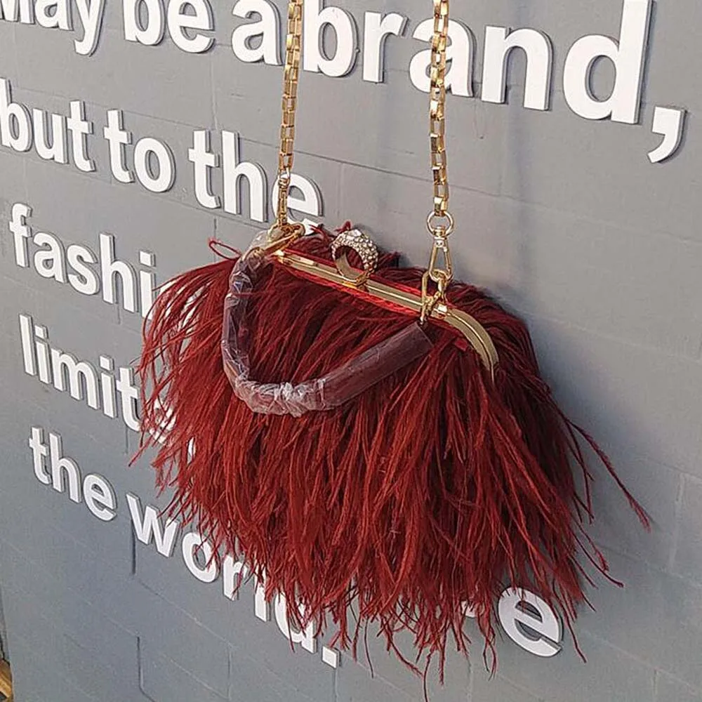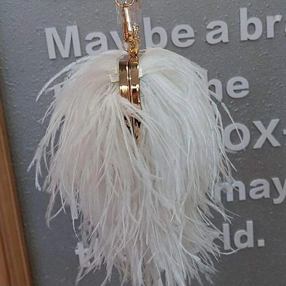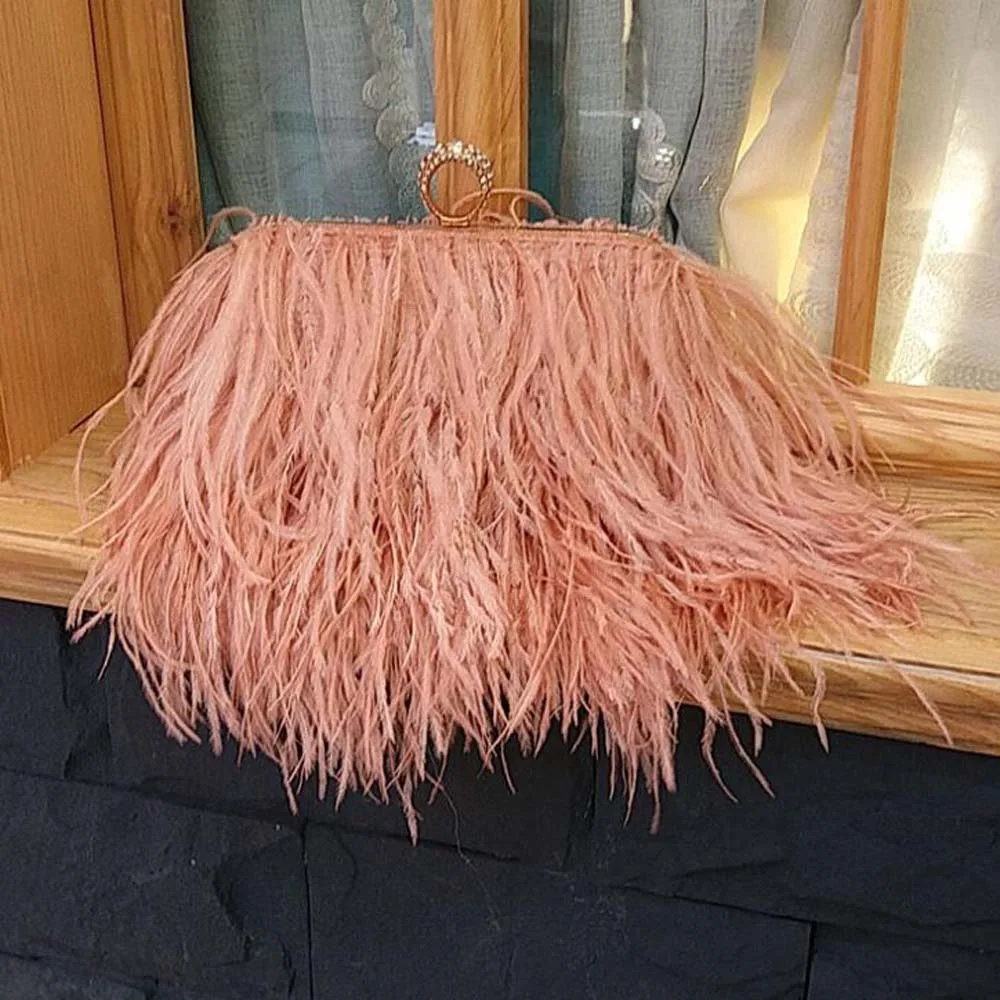 Women Ostrich Fur Evening Bag Luxury Wedding Party Handbag Phone Purse Long Chain Tassel Shoulder Bag Valentine Day Gift Clutch