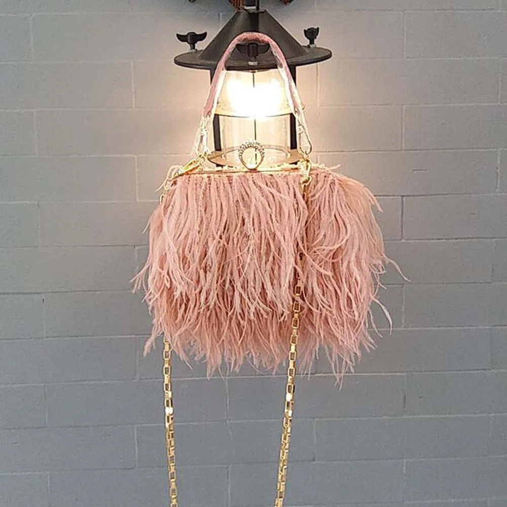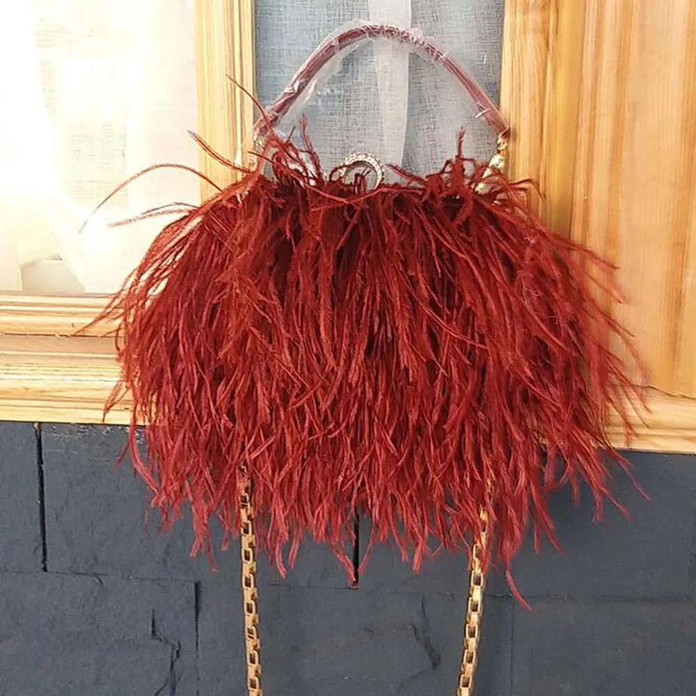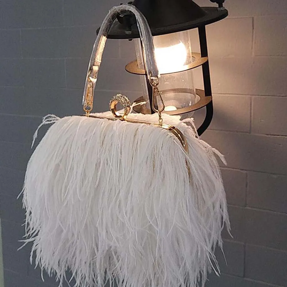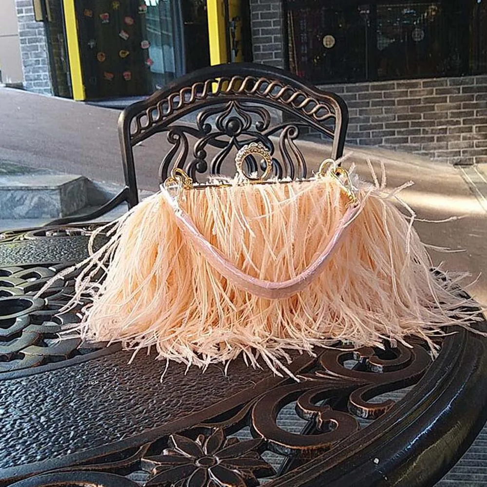 Women Ostrich Fur Evening Bag Luxury Wedding Party Handbag Phone Purse Long Chain Tassel Shoulder Bag Valentine Day Gift Clutch