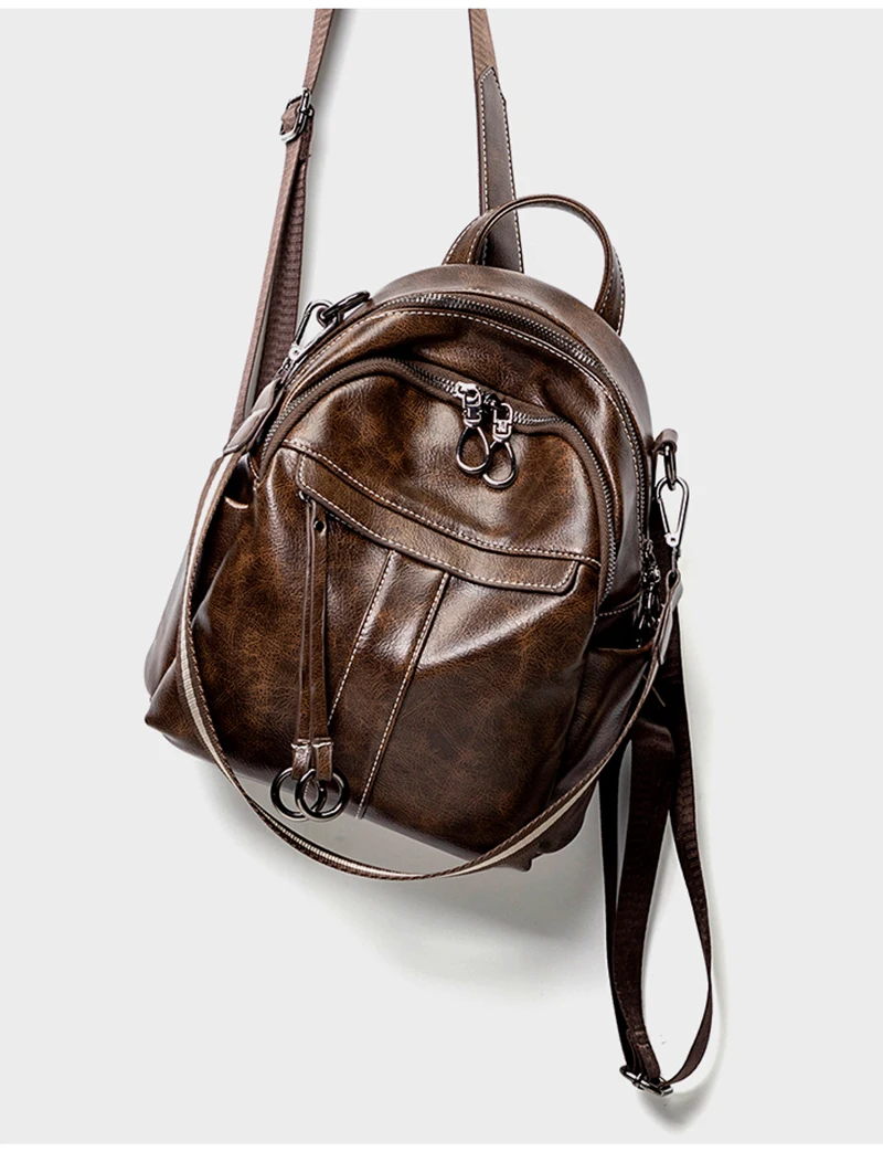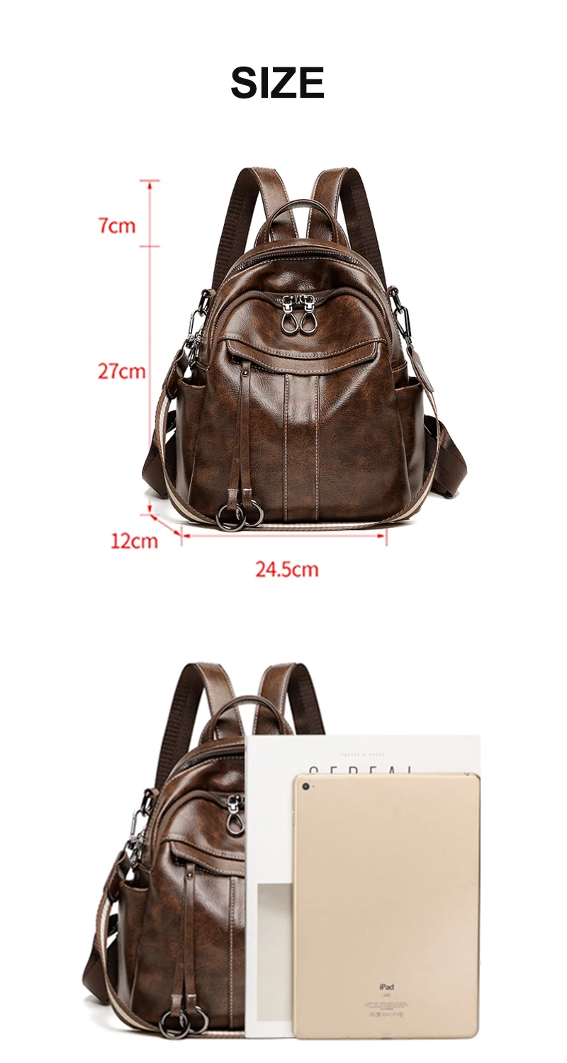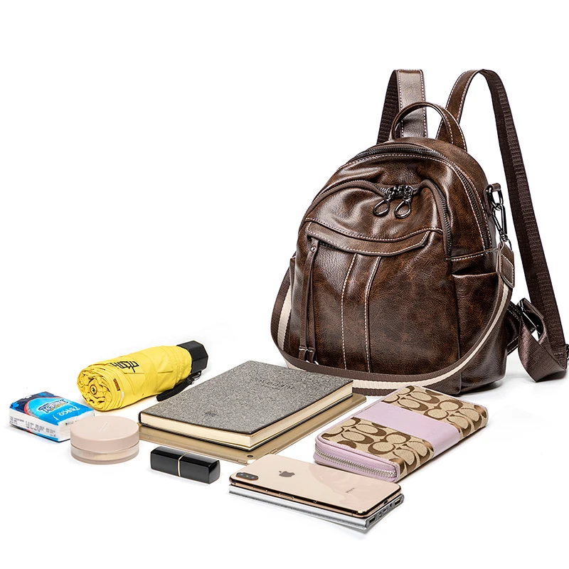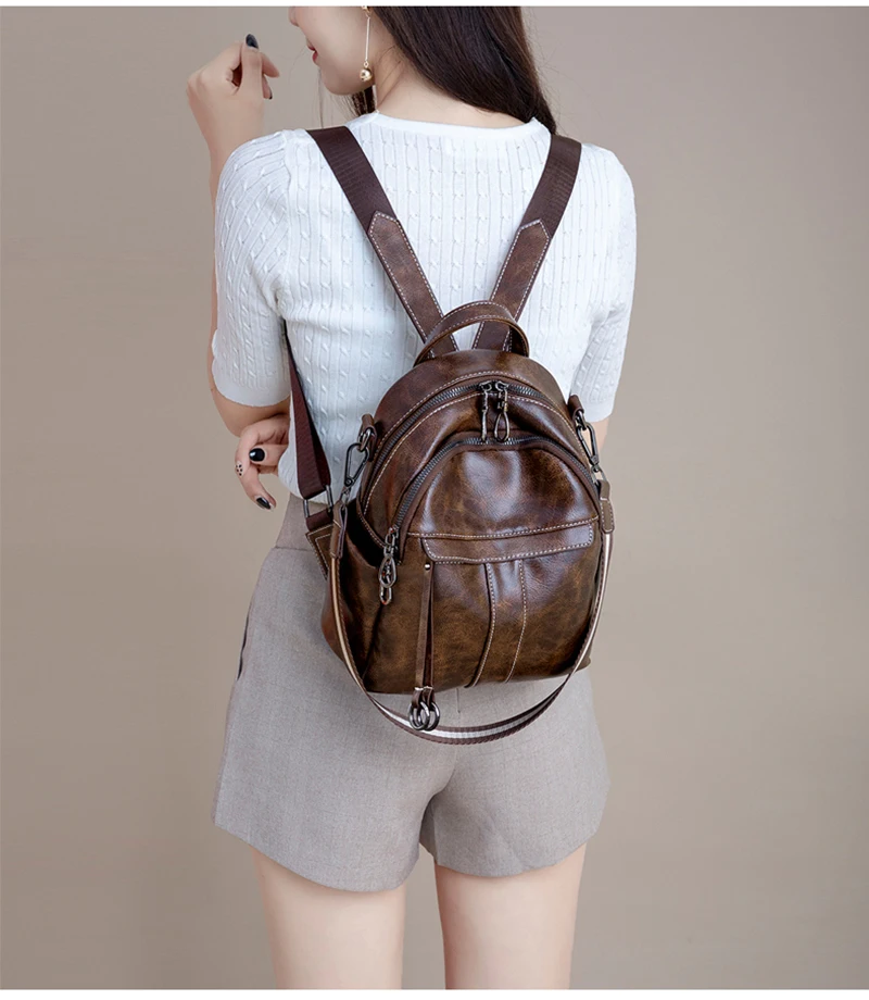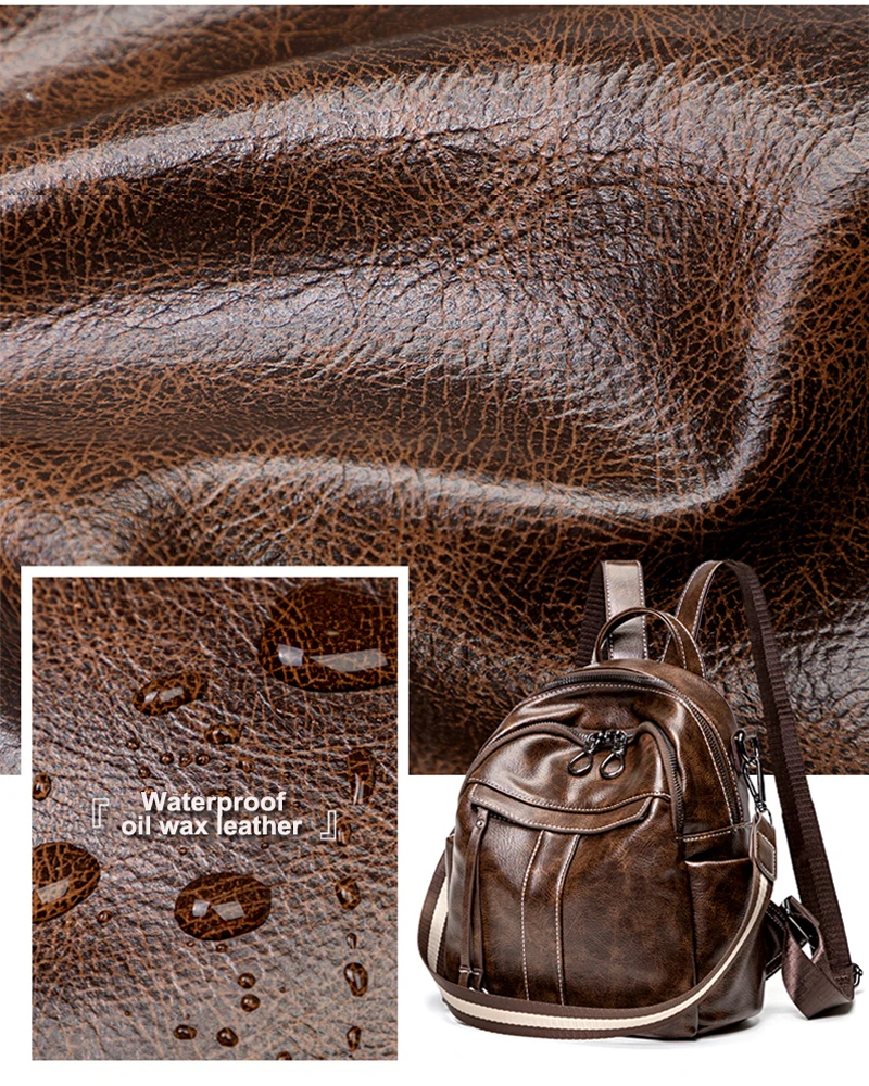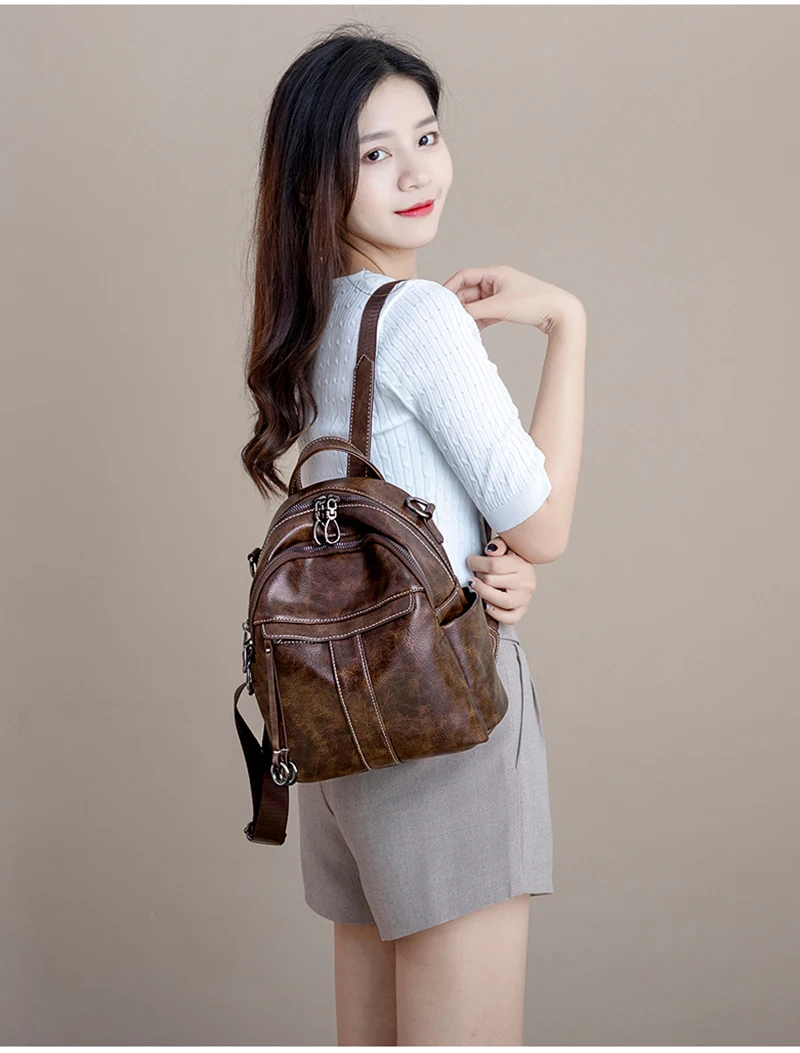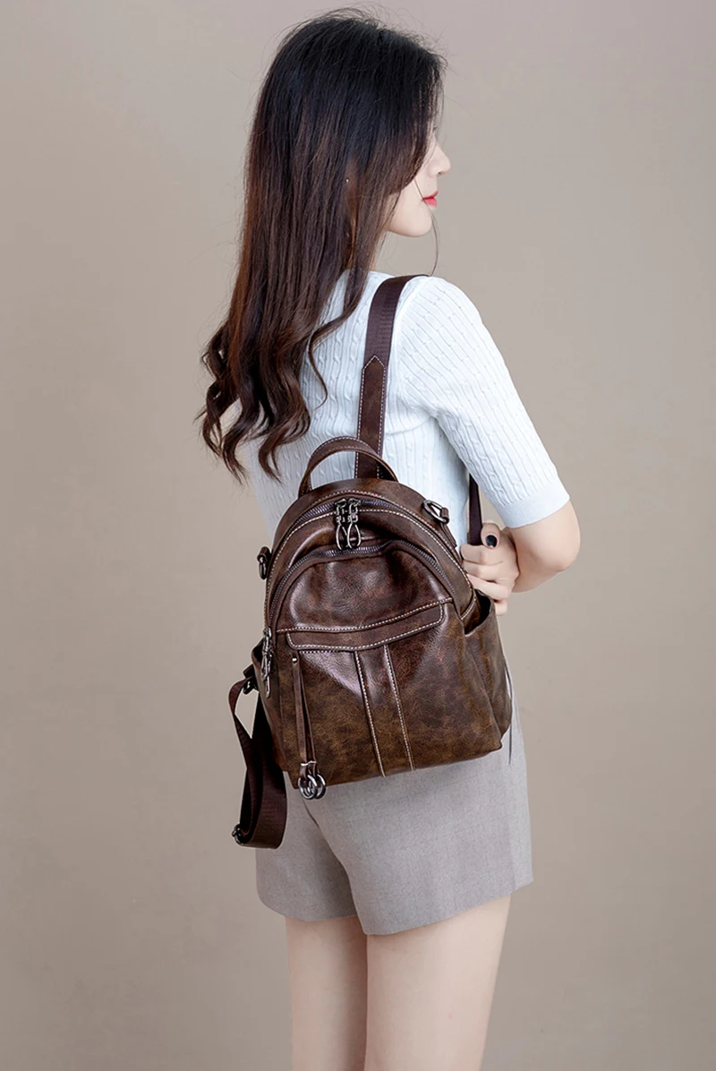 Women‘s Backpack 2024 New PU Oil Wax Leather Retro Style Women Shoulder Bag Fashion Girls Student Knapsack C9855