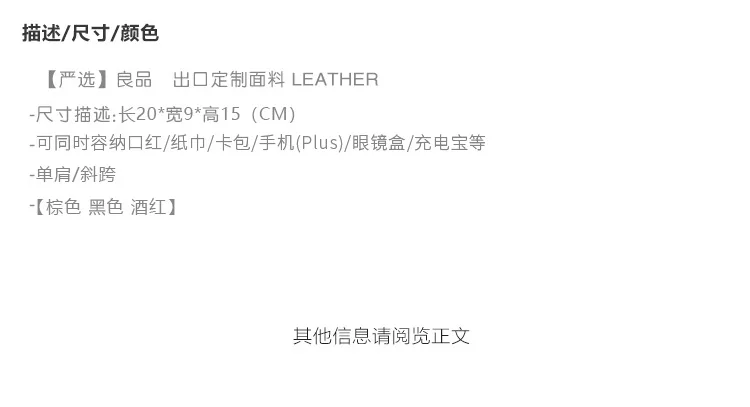 Upper Material: Microfiber leatherLining Material: PolyesterLength: 20cmWidth: 9cmHeight: 15cmColors: Black, Wine, Brown