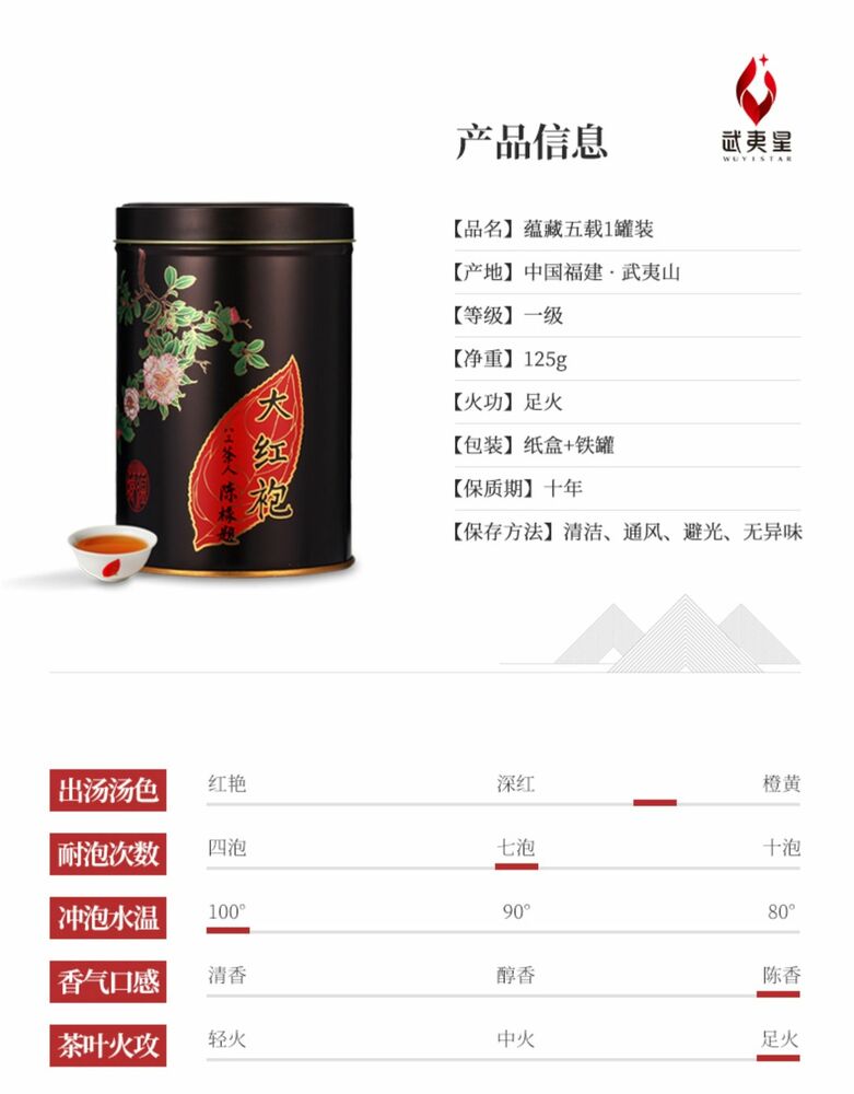 Manufacturer: Wuyi Star Net Weight: 125g Packaging: Tin Origin: Wuyi,Fujian,China Description: Big Red Robe oolong tea is one of famous Wuyi Cliff Tea from Wuyi Mountain of Fu Jian. Wuyi Cliff Oolong has long, curly leaves resembling iron shards. The leaves are hand-rolled into the traditional twisted Yan Cha form and pan-fired at their aromatic peak to arrest oxidation. Afterwards they are charcoal-fired in small batches to produce the deep green color and rich flavor that have made this tea one of China's most famous tea. The aroma of the dry leaf is deliciously sweet while the dark amber infusion is soft, smooth and malt. Rou Gui is famous for its lingering and rich flowery aroma, being so good that you will be captivated before you even drink the tea. The infusion produces cups of strong, amber-colored beverage. Brewing Guide: Place one spoon into an infuser, filter or teapot. Switch the kettle off, before it boils, when you hear the water rumbling. Add the hot, but not boiling, water and infuse for 3 minutes. Serve immediately or remove leaves to prevent spoiling.