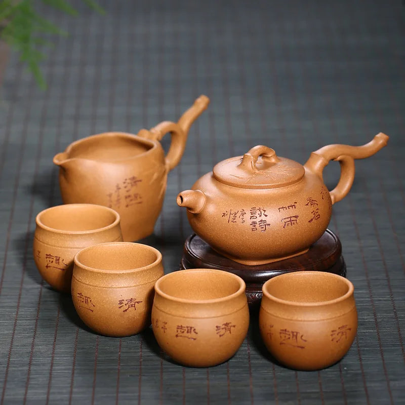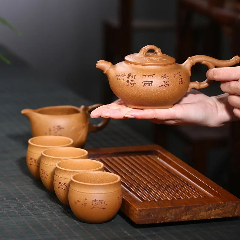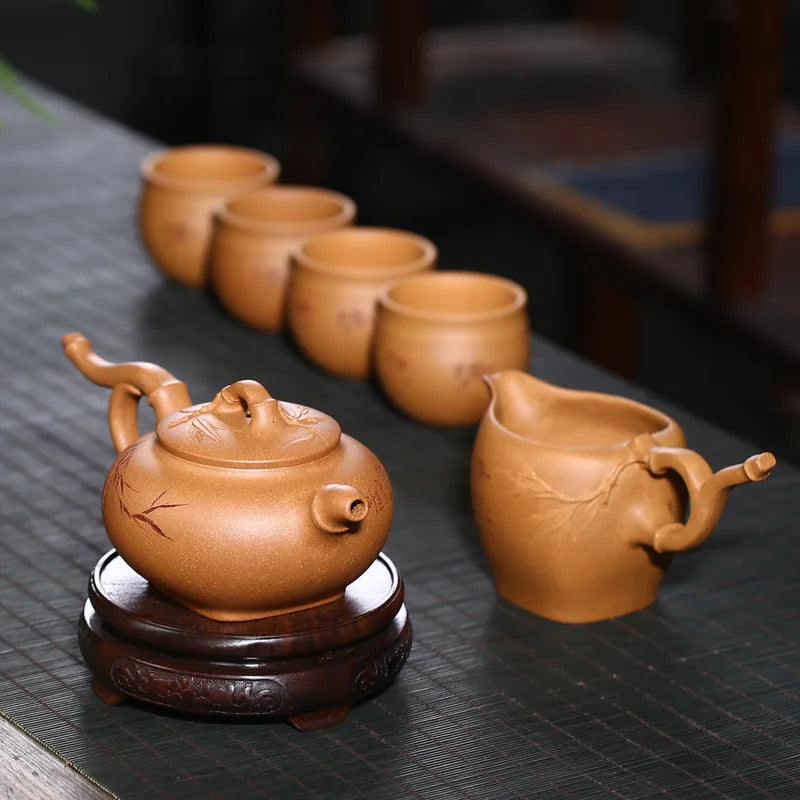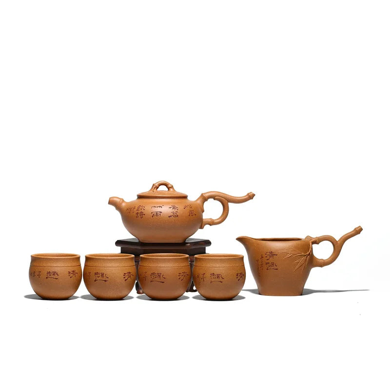 【Introduced】This Teapot Set Contains a Pot、Four Master Cups And One Pitcher,Enter the Question with Bamboo,Kettle Body Inscription“Song Feng, Tea, Bamboo Rain, Poetry Talk”,Profound Meaning,Carved Bamboo Pole,Bamboo Shadow Whirling,Lush。Curved Drooping,Flying Handle Slender,Bridge Button Stand up,The Mouth Button Is Shaped with Bamboo,Elegant and Vivid。Pitcher and Master Cup Belly Carving“Freshh”Two Words,Echo Kettle Body,Fit Theme,Cup Handle and Kettle Handle,Overall Coordination,Harmonious Nature。