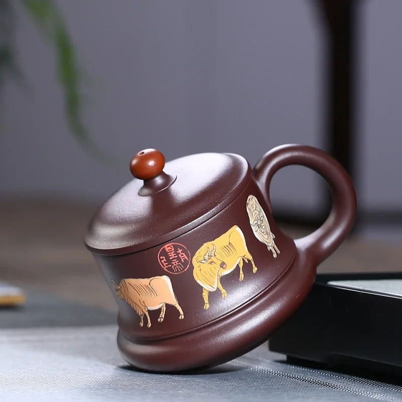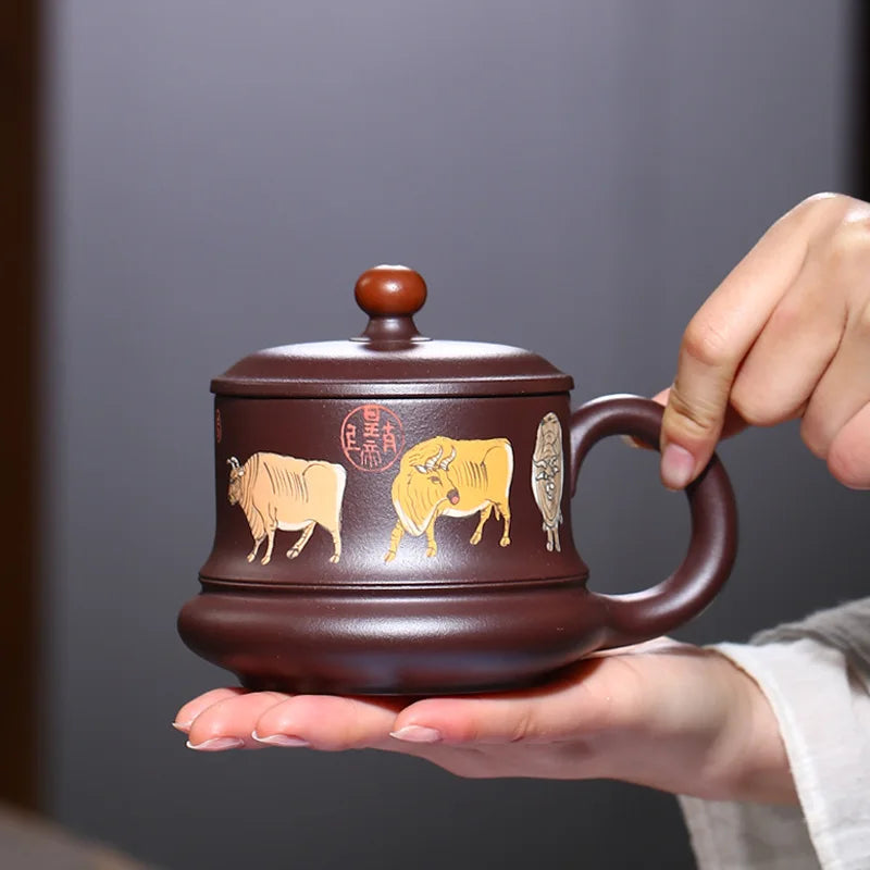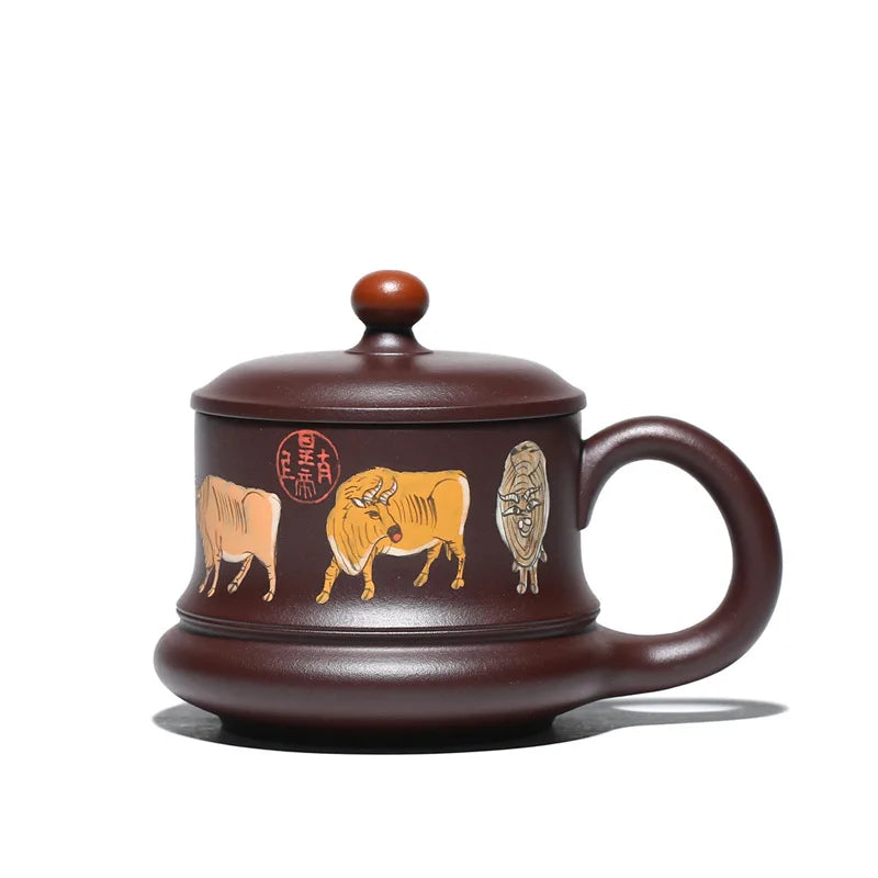 【Introduced】This Cup with Cover Is Made of Top Purple Clay Hand-Made。Cup Body Cylinder Flat round Slightly Bulging,Unique Shape;Flat Lid Micro Drum,Flat Beads-Shaped Cup Button,Take Pinch Comfort;Cup Handle Rough,Connected to Flat Base,Superb Connection。Kettle Body Carving Draw a Picture of Five Cows,Clear Bones,Robust and Powerful,Delicate Description。