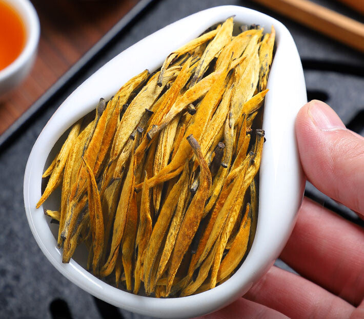 Dian hong ,"Yunnan Red", is a Chinese black tea which is used as a relatively high end gourmet black tea and is sometimes used in various tea blends. The main difference between Dian hong and other Chinese black teas is the amount of fine leaf buds, or "golden tips," present in the dried tea. Finer Dian hong teas produces a brew that is brassy golden orange in colour with a sweet, gentle aroma and no astringency. Cheaper varieties of Dian hong produce a darker brownish brew that can be very bitter. Teas grown in the Yunnan Province of China prior to the Han dynasty were typically exported in a compressed form similar to modern pu-erh tea. Dian hong is a relatively new product from Yunnan that began production in the early 20th century. The word "Diān" is the short name for the Yunnan region while "hóng" means "red (tea)"; as such, these teas are sometimes simply referred to asYunnan red or Yunnan black. However, such references are often confusing due to the other varieties of teas produced in Yunnan as well as the ambiguous nature of the color classifications.