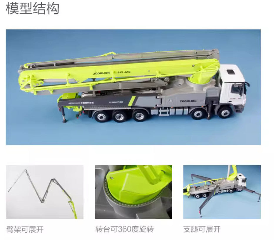 ZOOMLION 1:38 64X-6RZ Concrete Pump Truck Construction Machine Diecast Model Collection
