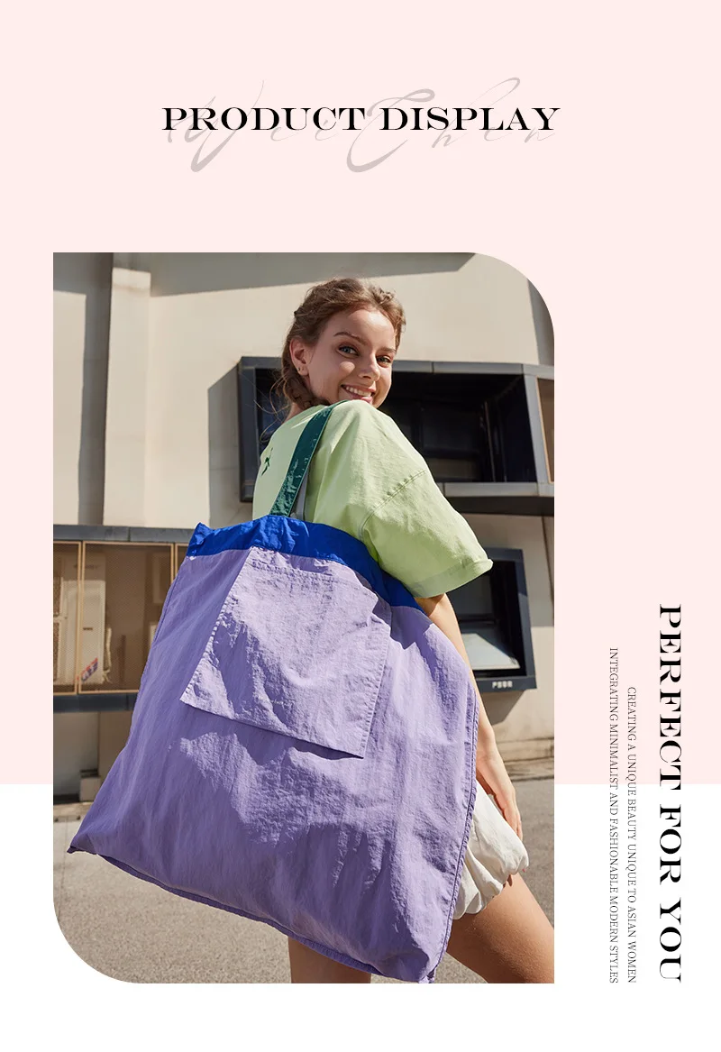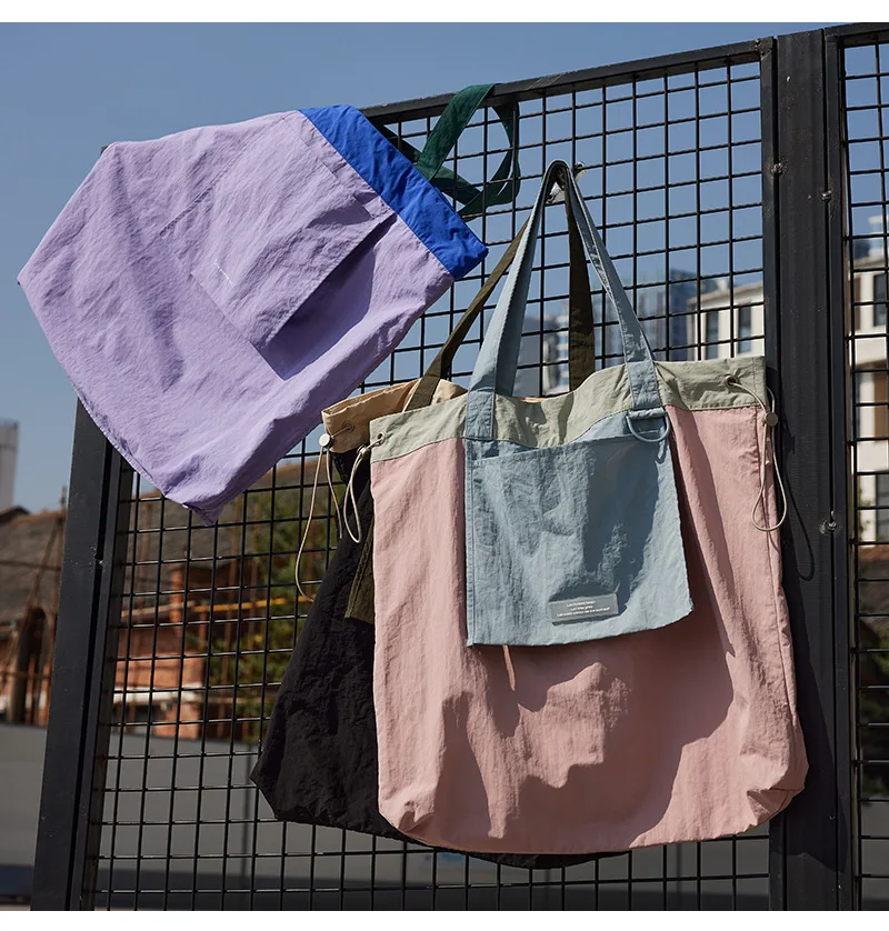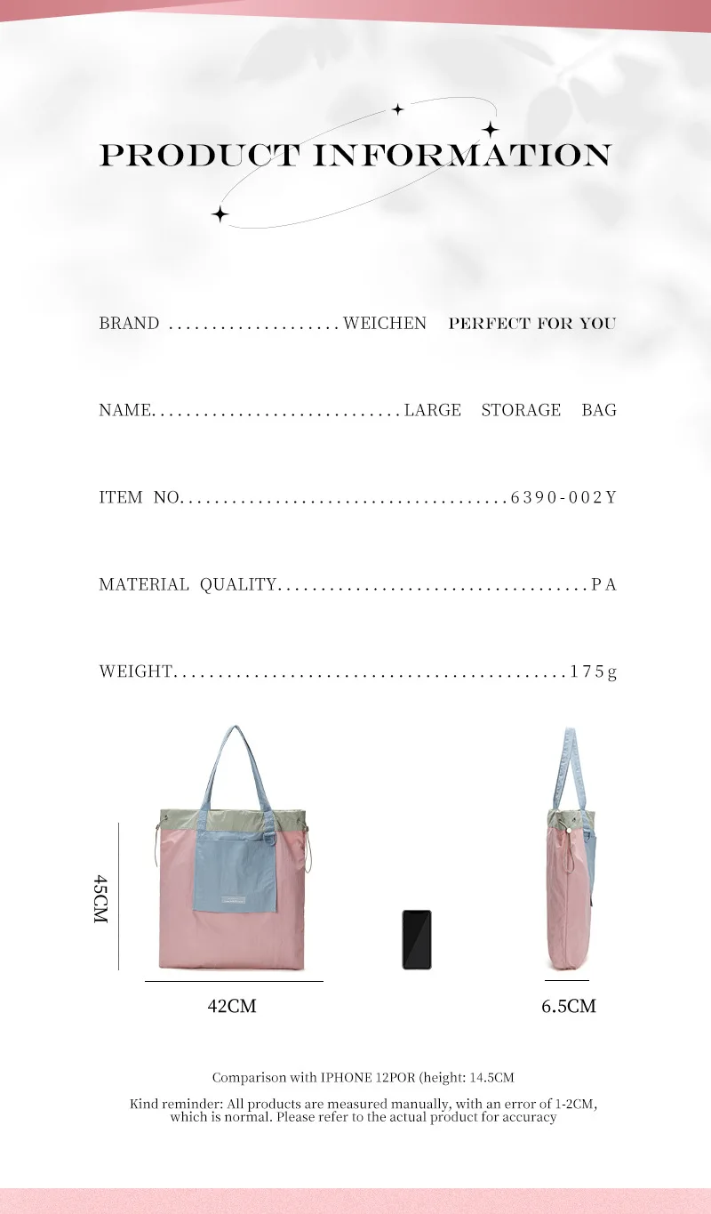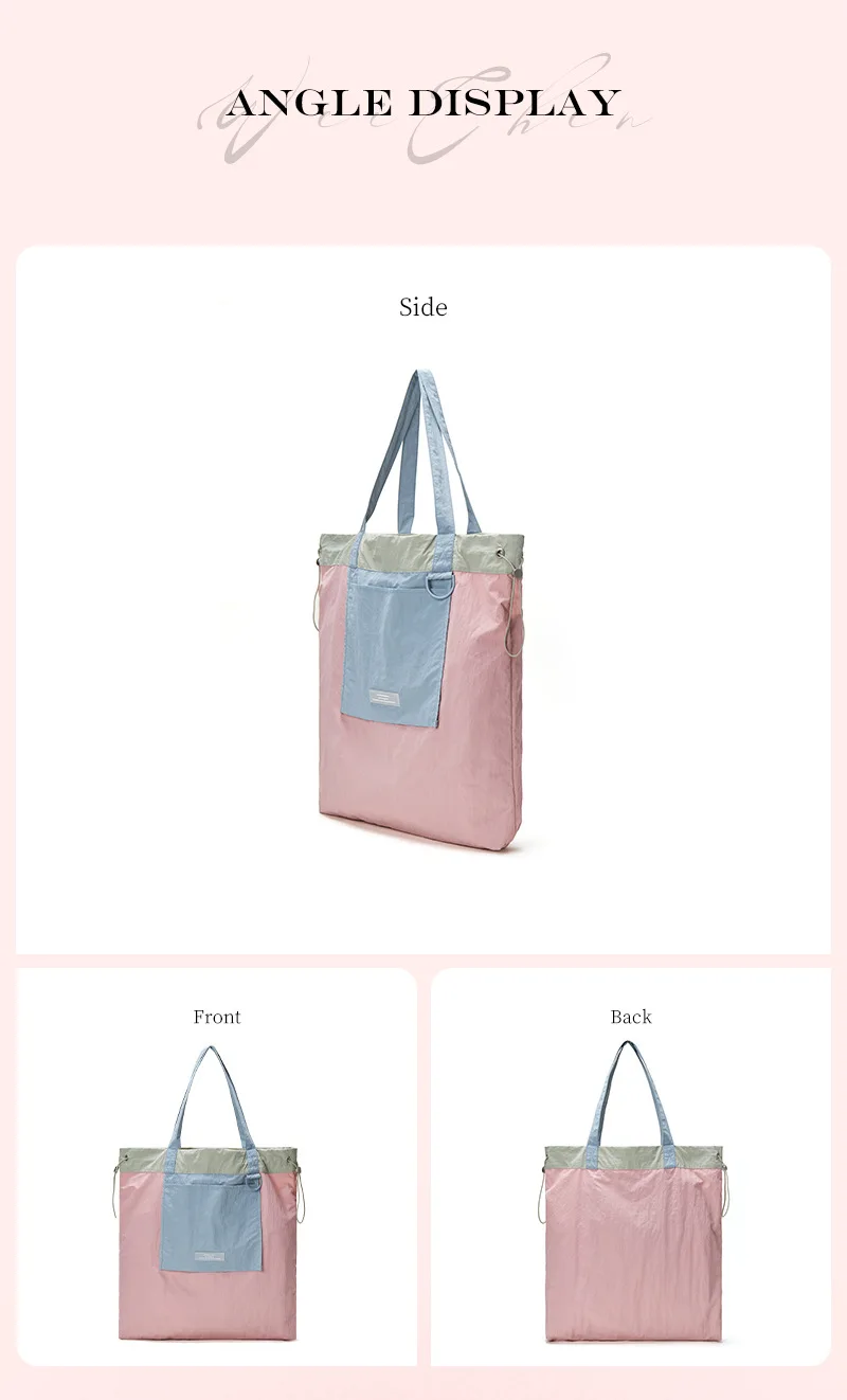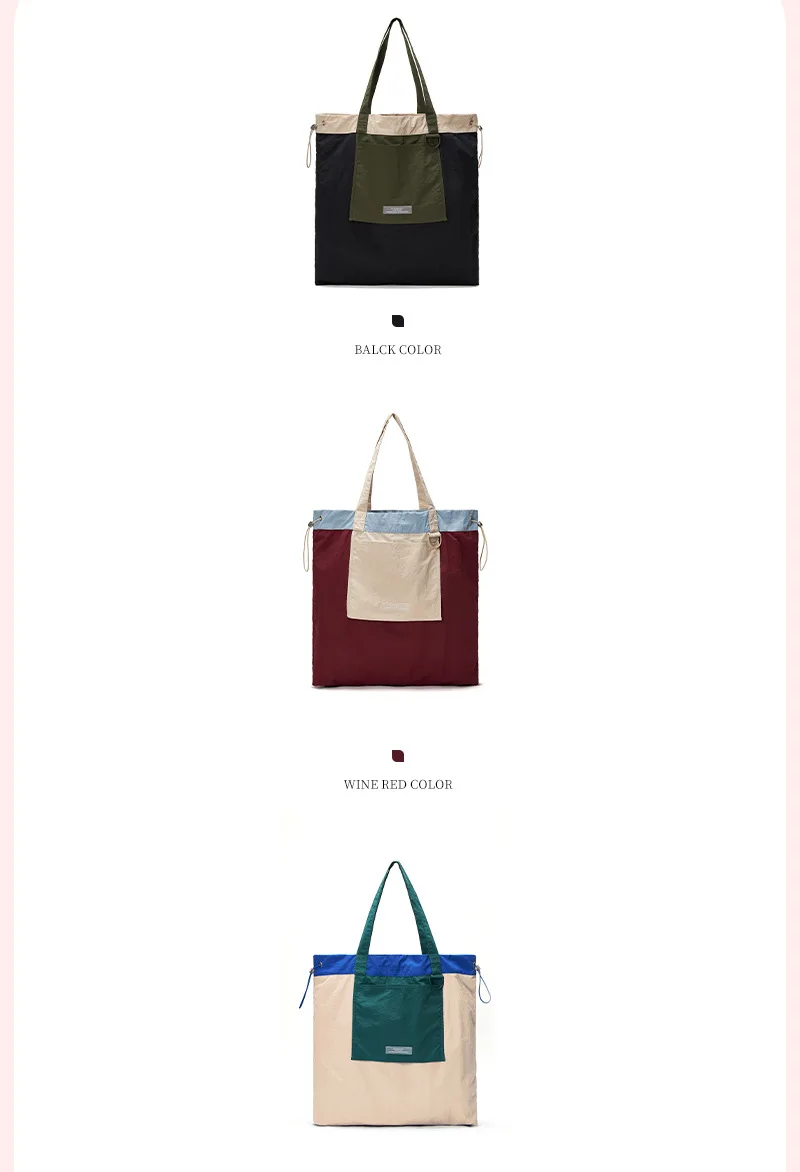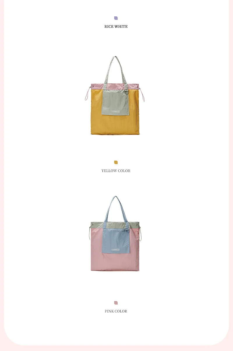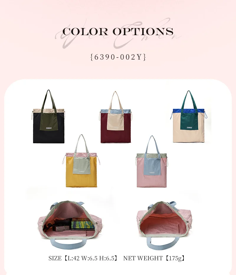 Nylon upper material Polyester lining materialLarge capacityLightweight&foldableSize: 42*6.5*45cmPatchwork designColor: Black, Pink, Yellow, Claret, Beige