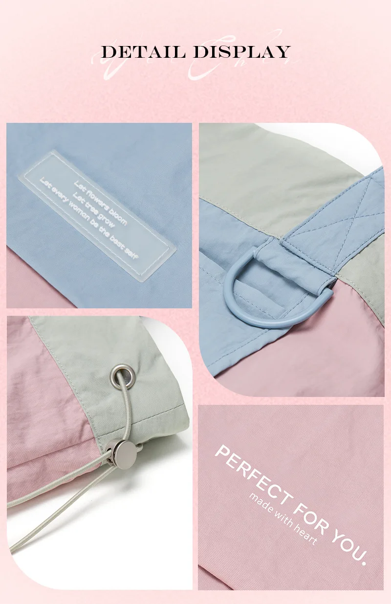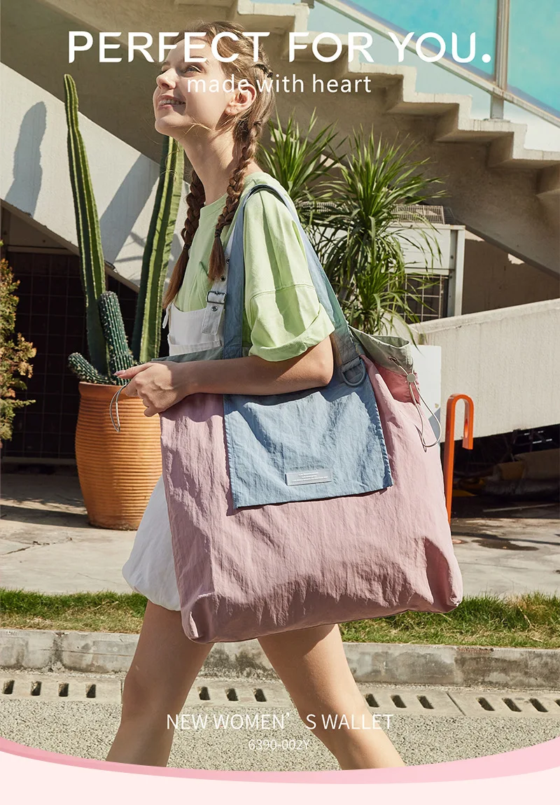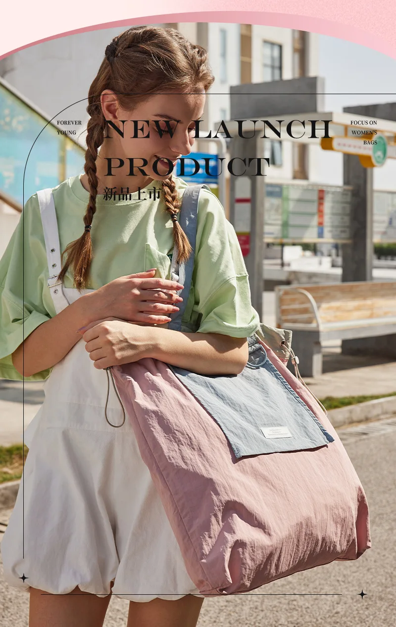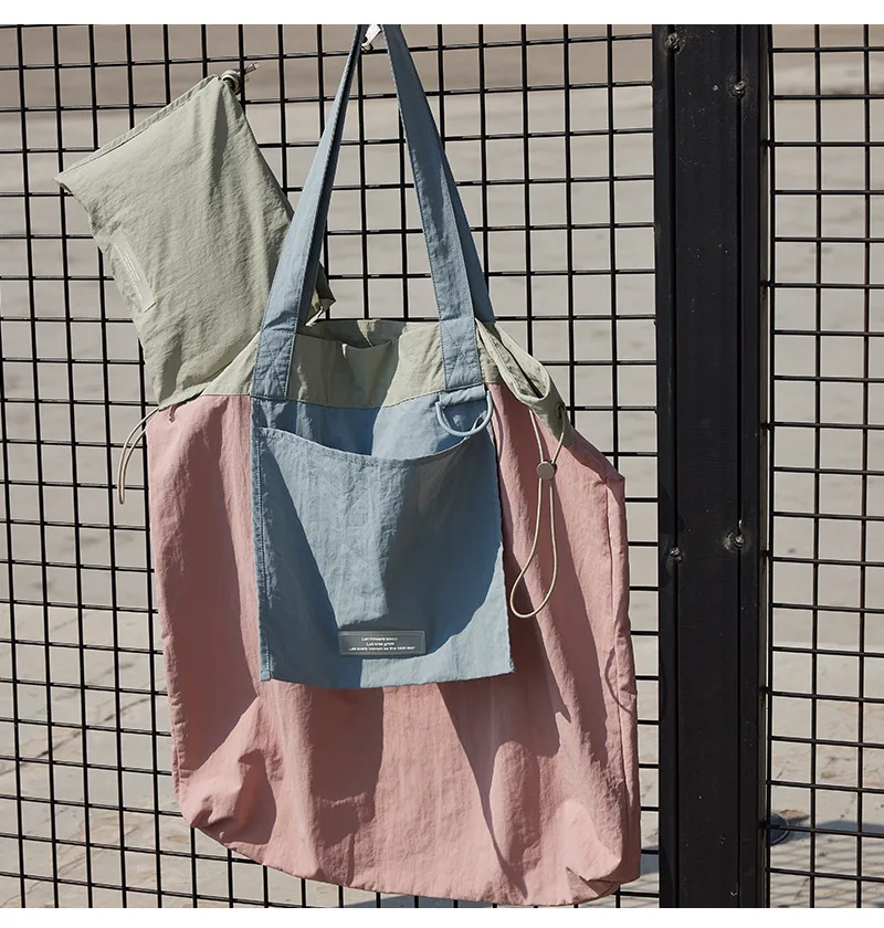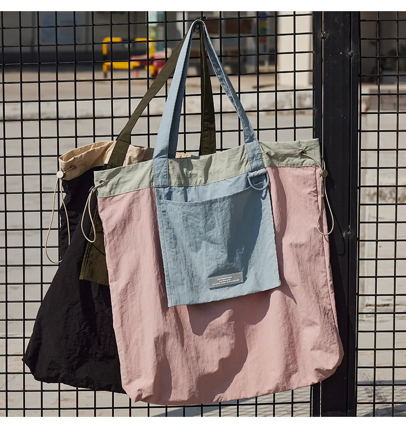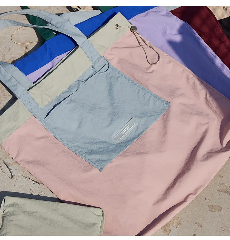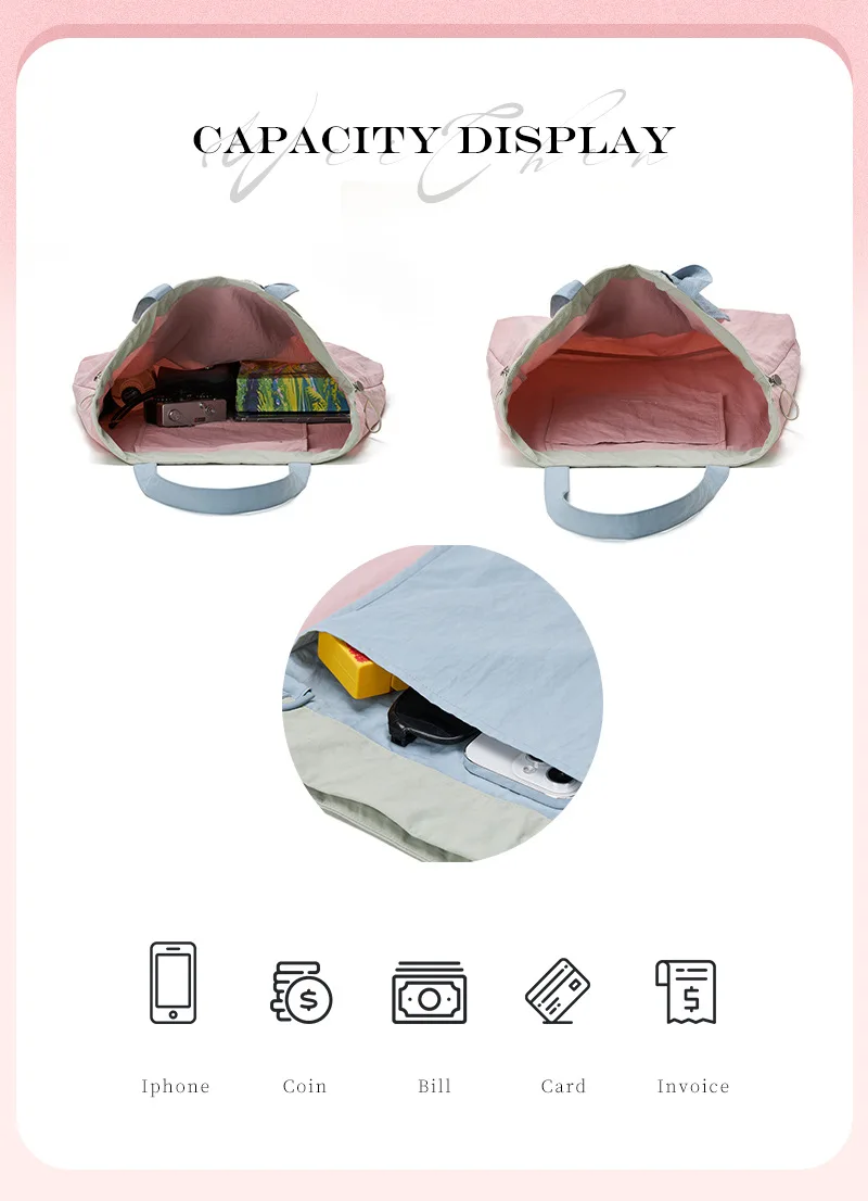 Nylon upper material Polyester lining materialLarge capacityLightweight&foldableSize: 42*6.5*45cmPatchwork designColor: Black, Pink, Yellow, Claret, Beige