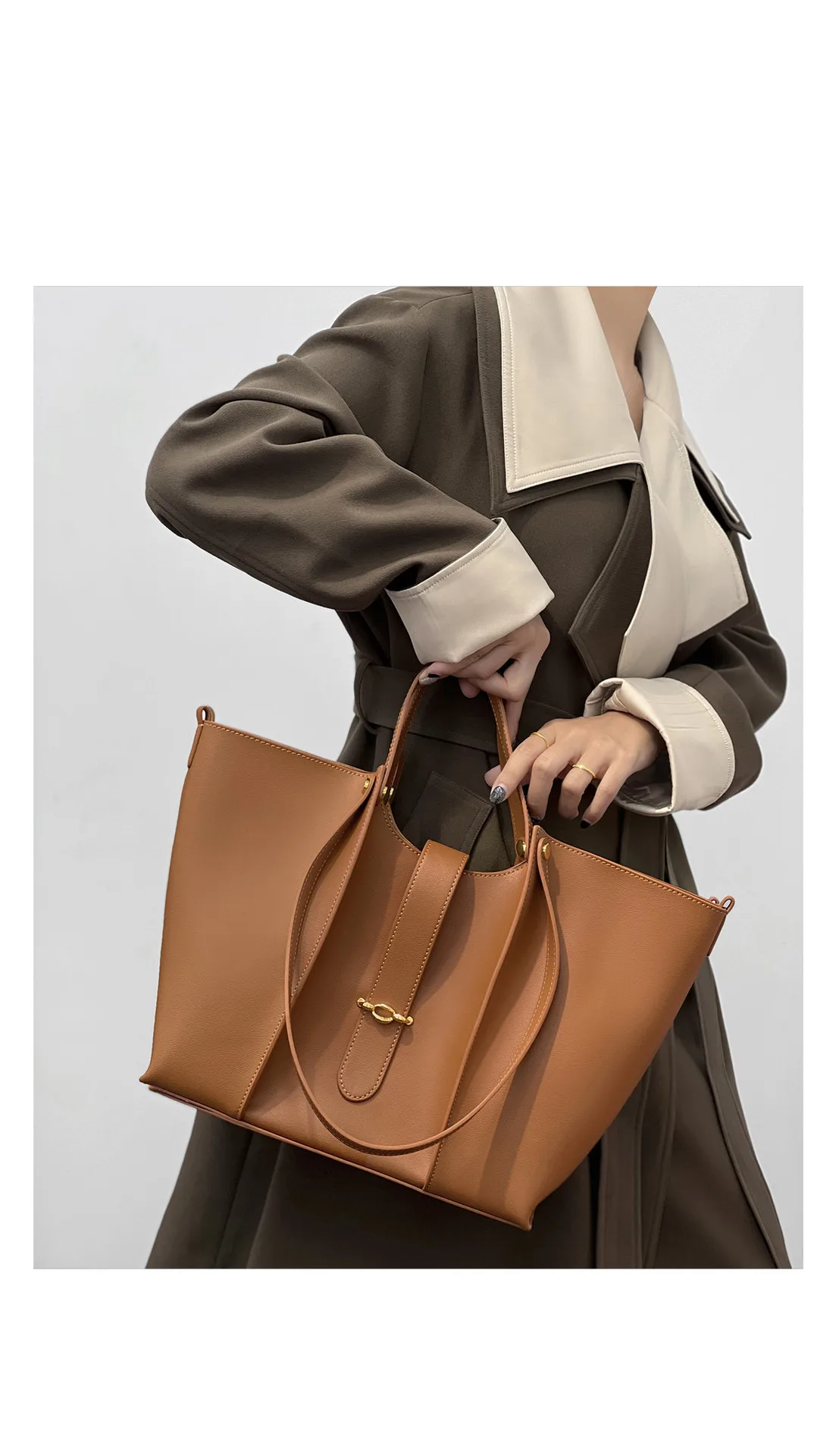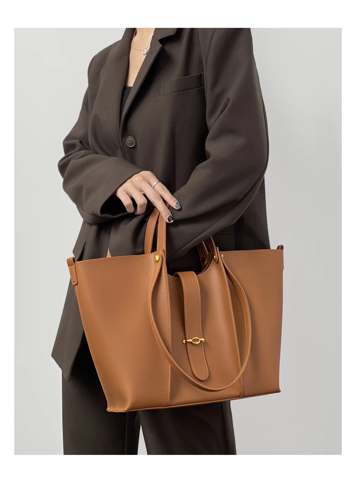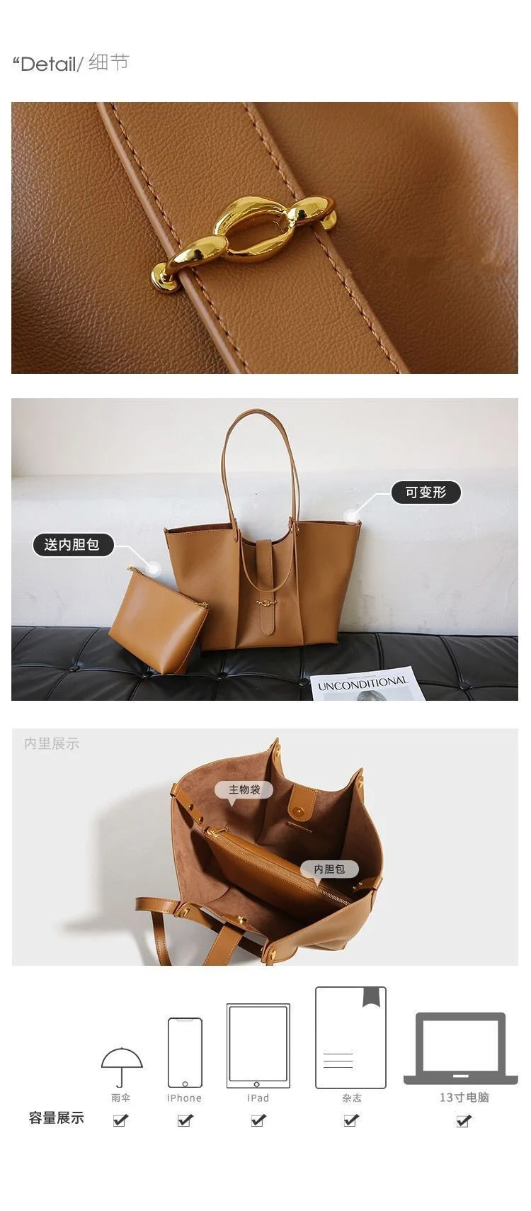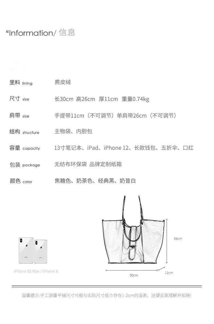 Split leather upper material Polyester lining materialLarge capacitySize: 30*26*11cmSewing designColor: Black, Brown