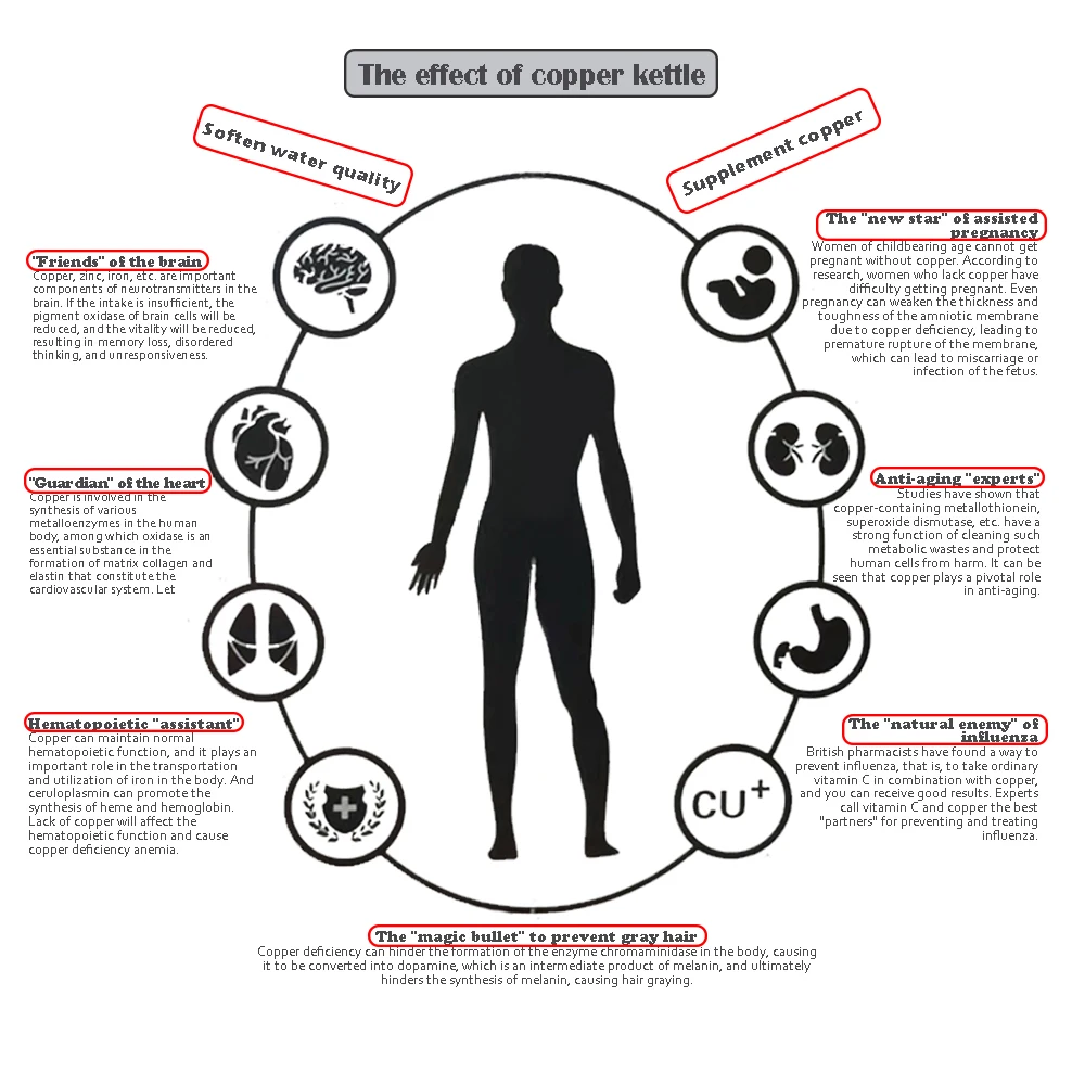 --The copper pot will appear black spots after a period of use, which is an oxidation phenomenon, not a quality problem, and does not affect normal use and water quality.