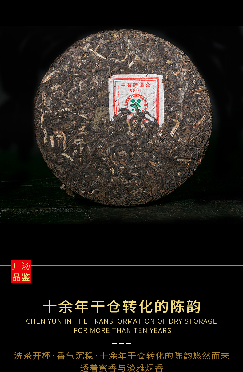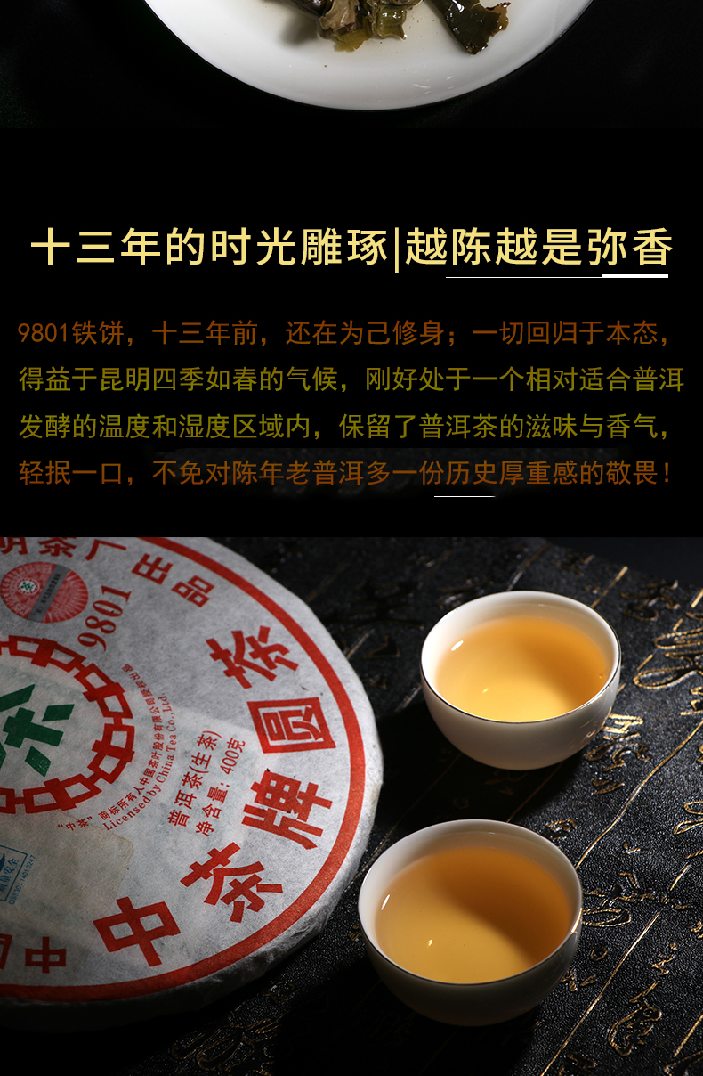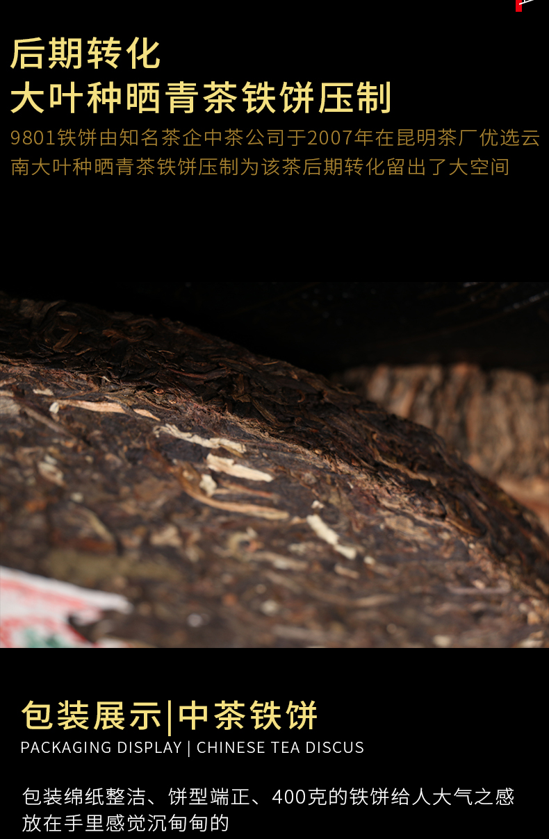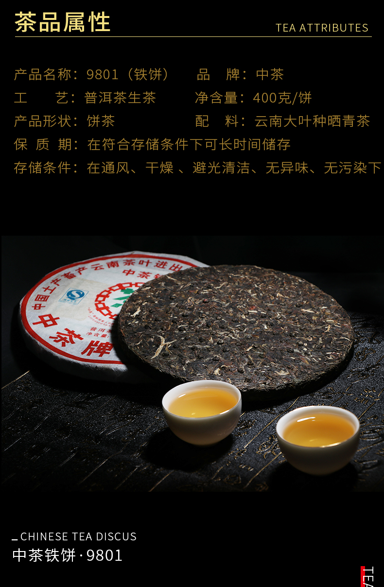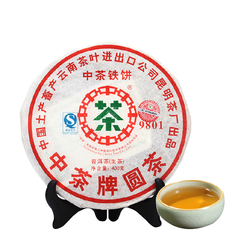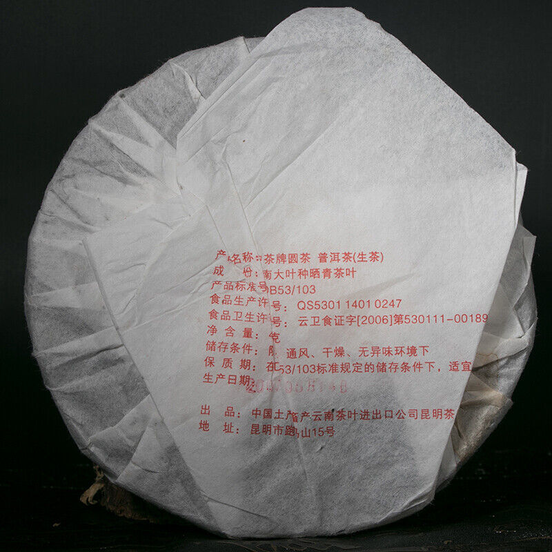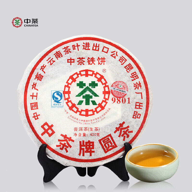 Product detail: ZHONG CHA TIE BING 2007 Round Tea 9801 China Tea Discus Pu'er Puer Raw Tea 400g Product Date: 2007 Year Packing specification: 400g / Pcs, The price for 400g Storage: Avoid sunlight, ventilation places Shelf time: The longer the better PRODUCT OF CHINA TUHSU YUNNAN TEA IMP.&EXP.CORP. KUNMING TEA FACTORY