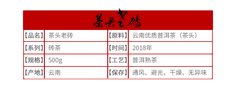 Product Name : LaoTongZhi Cha Tou Old Brick Ripe Puer Tea Manufacturer : Anning Haiwan Tea Industry Co,. Ltd. Production date : 2018 year Net weight : 500g / Pc Origin : Anning, Yunnan, China Storage : Ventilation, cool, dry, no odor, long-term preservation in a pollution-free environment. Raw materials : High quality Puer tea in Menghai, Yunnan