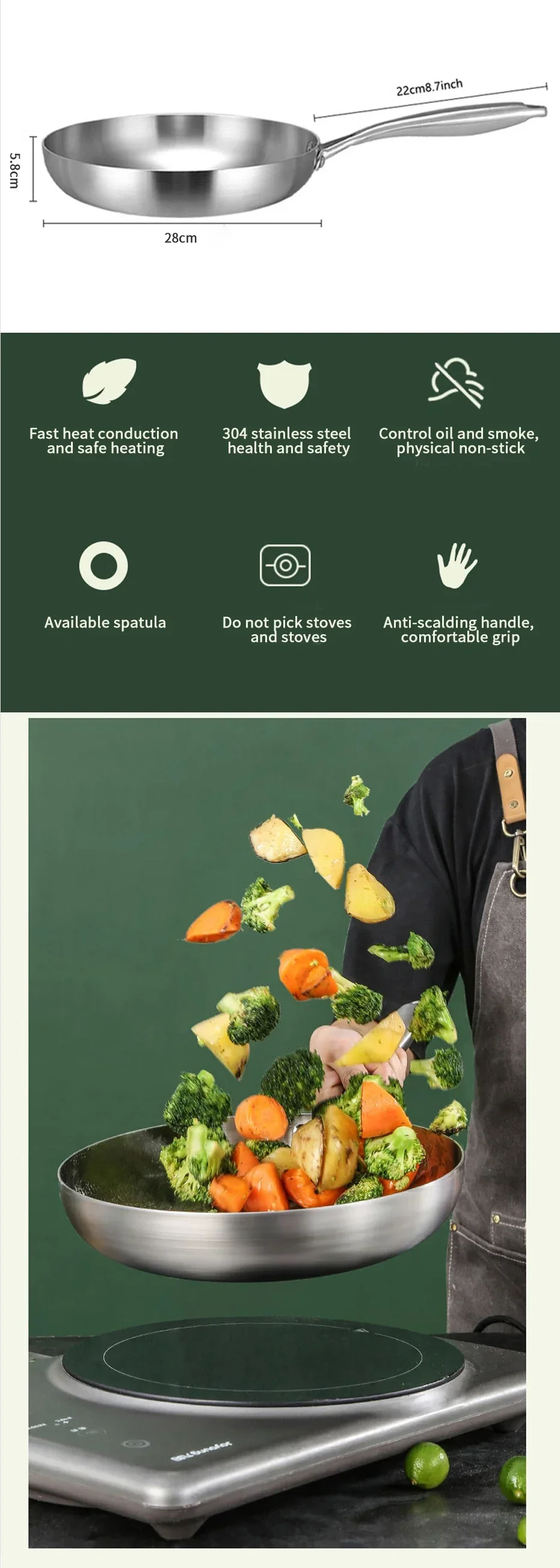 ●11 inch stir fry pan made of stainless steel, nonstick cookware interior is High quality 304 stainless steel material, achieve separation state nonstick.