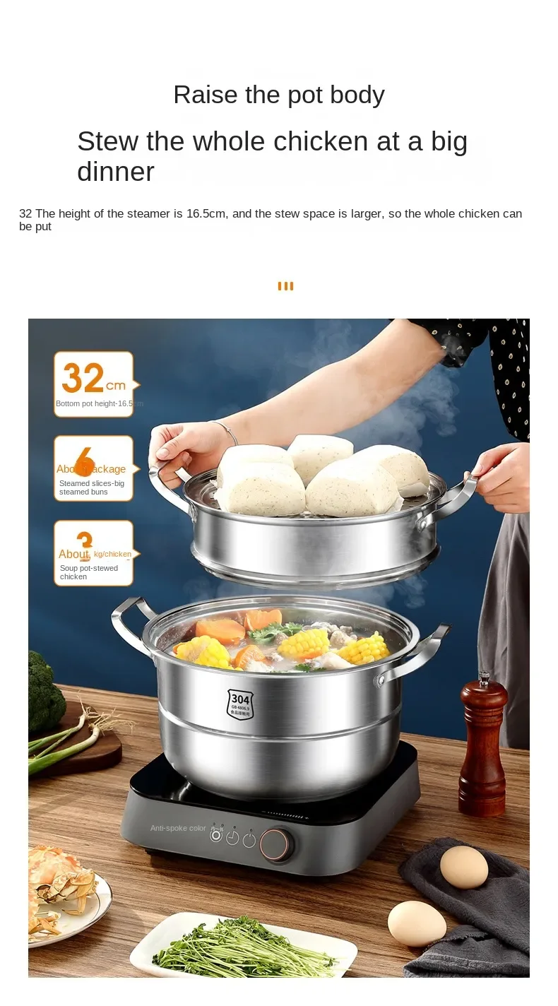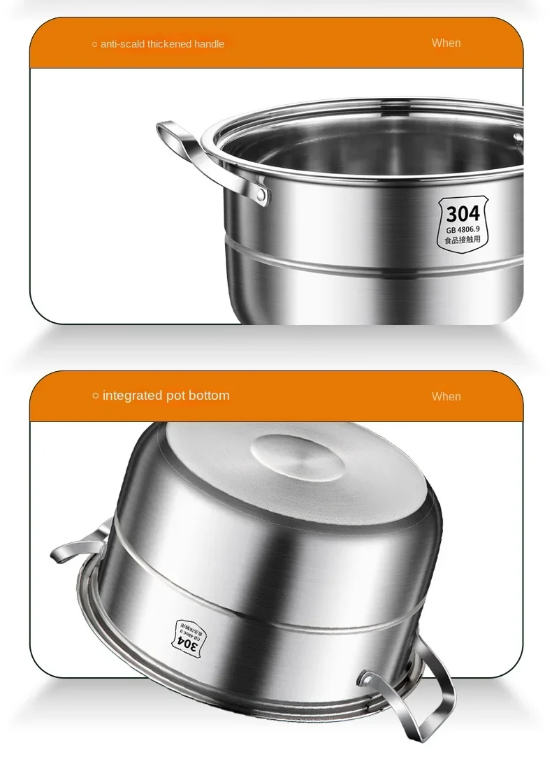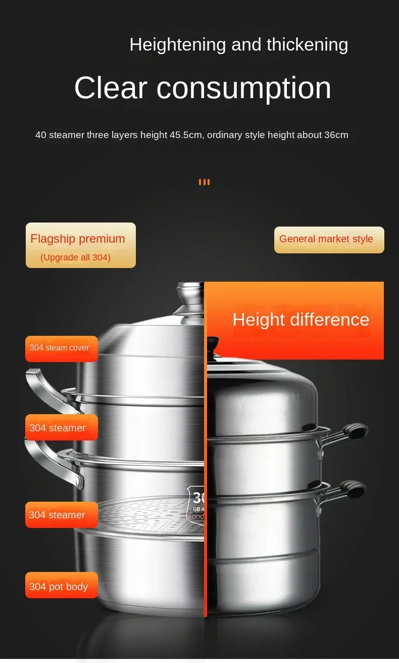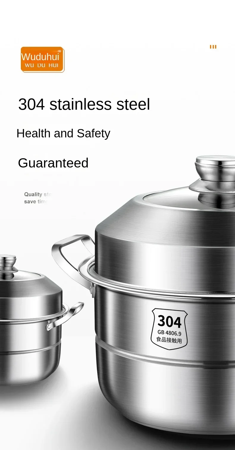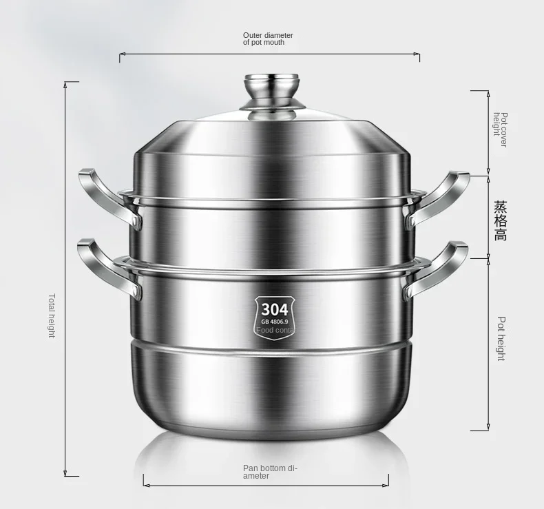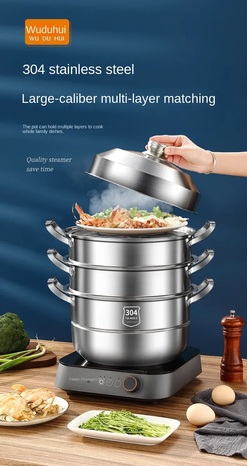 304 Stainless Steel Steamer Thickened Three-Tier Steamer Steamed Buns Household Cage Drawer 2-Layer Double-Layer Induction